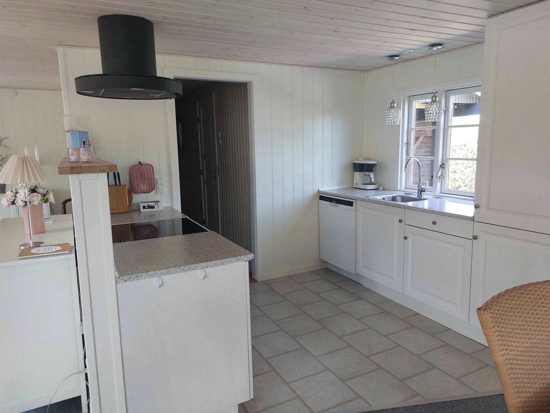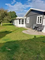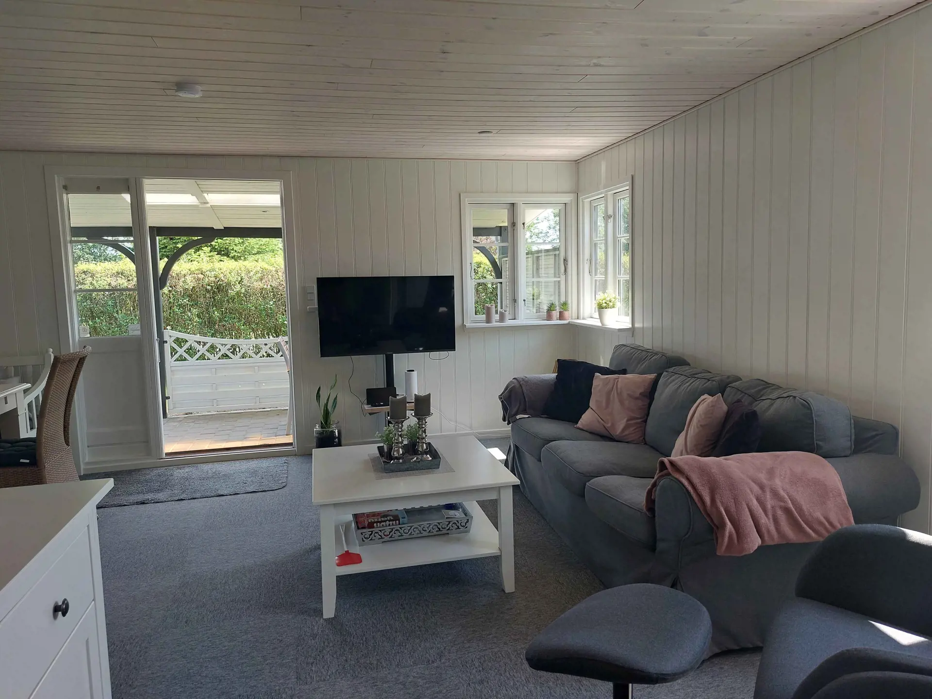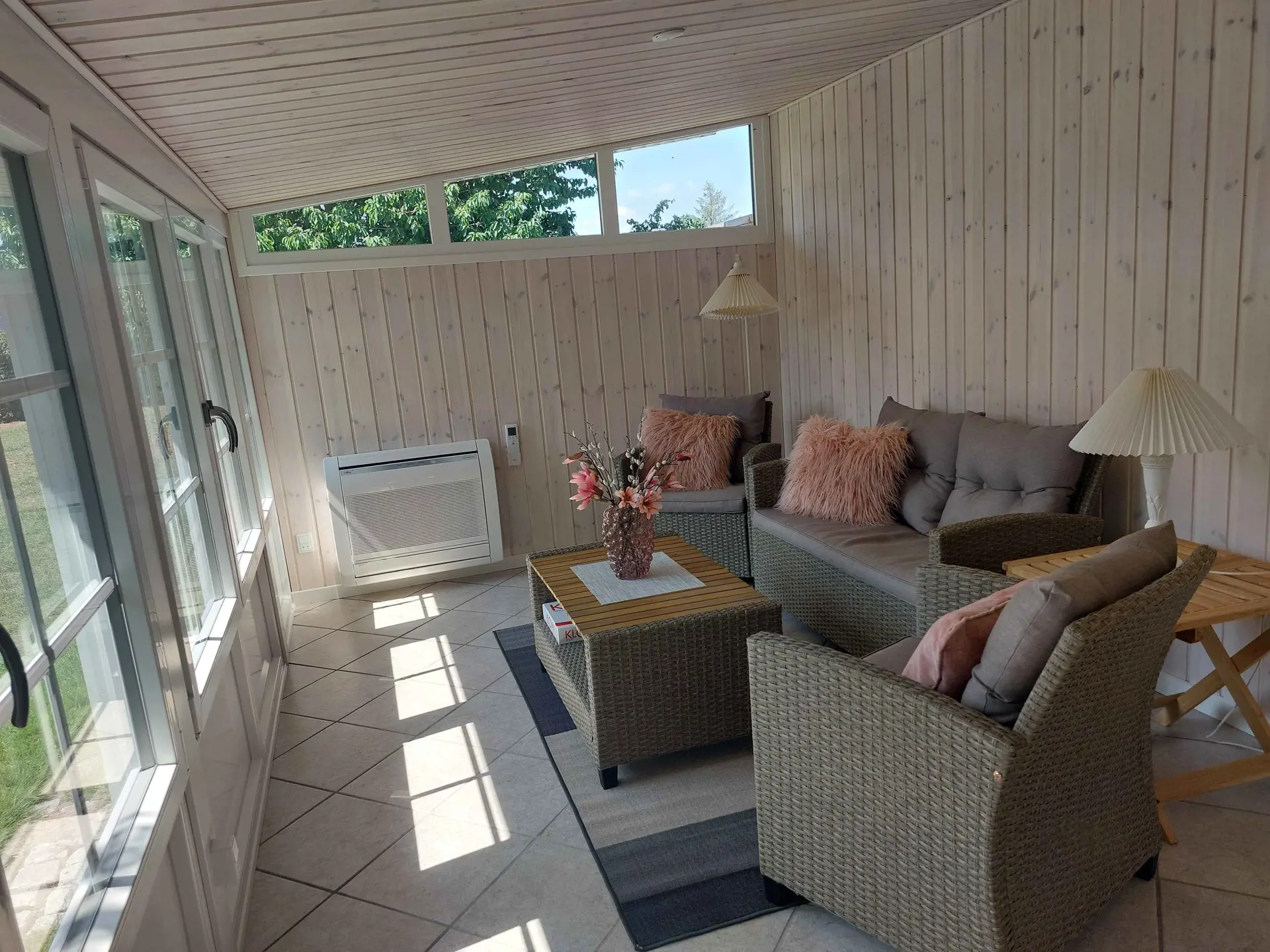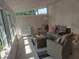 Das Wohnzimmer ist gemütlich eingerichtet und verfügt über einen Fernseher mit Chromecast. Das Haus wird mit Elektroheizung in den Schlafzimmern und im Badezimmer beheizt und hat außerdem eine Wärmepumpe im Wohnzimmer sowie im Wintergarten.