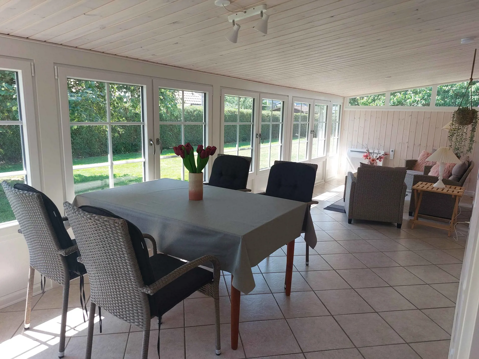 Es gibt einen wunderschönen, großen Wintergarten mit herrlichem Blick in den Garten und ins Grüne. Hier befinden sich sowohl eine gemütliche Sitzecke als auch ein Essbereich.
