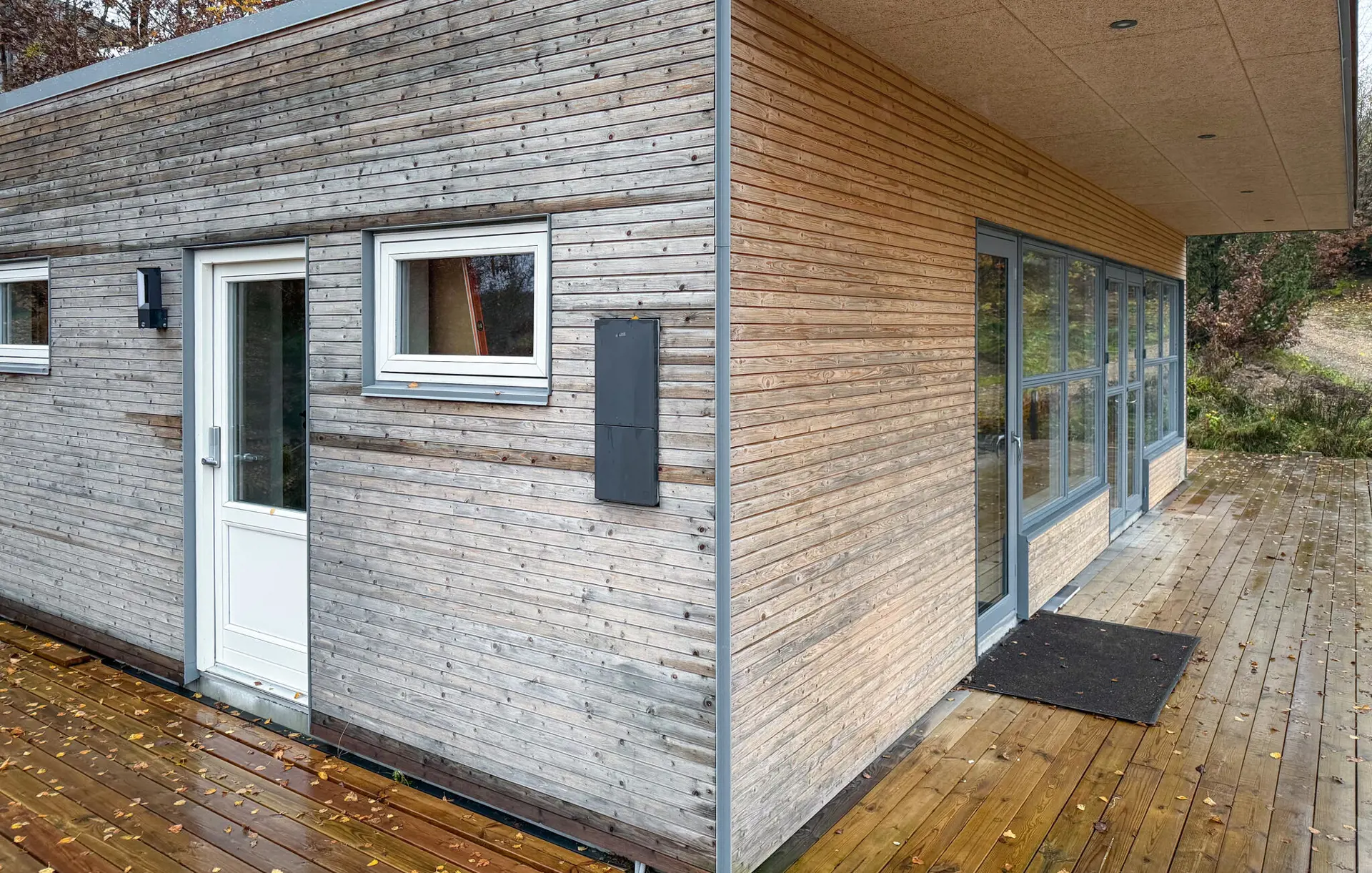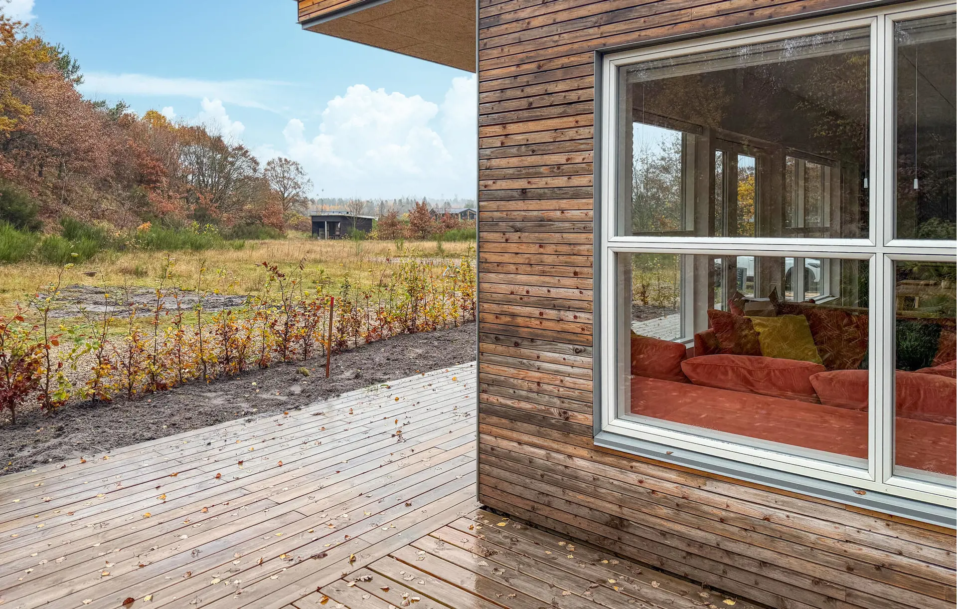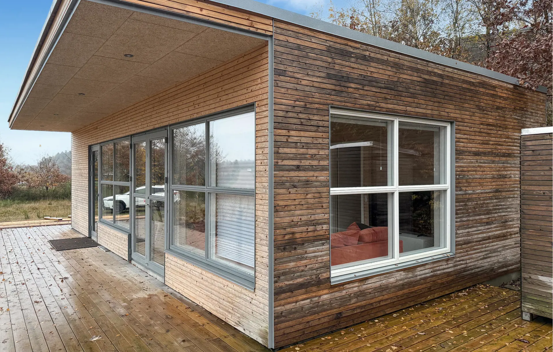 Das Haus fügt sich harmonisch in die Landschaft ein. Gehen Sie hinaus und genießen Sie die ruhige Atmosphäre auf der Holzterrasse. Nehmen Sie Platz mit einer Tasse Kaffee und lassen Sie den Blick über das weite Gelände schweifen. Nutzen Sie den überdachten Bereich als geschützten Platz bei jedem Wetter oder entspannen Sie in der Sonne.