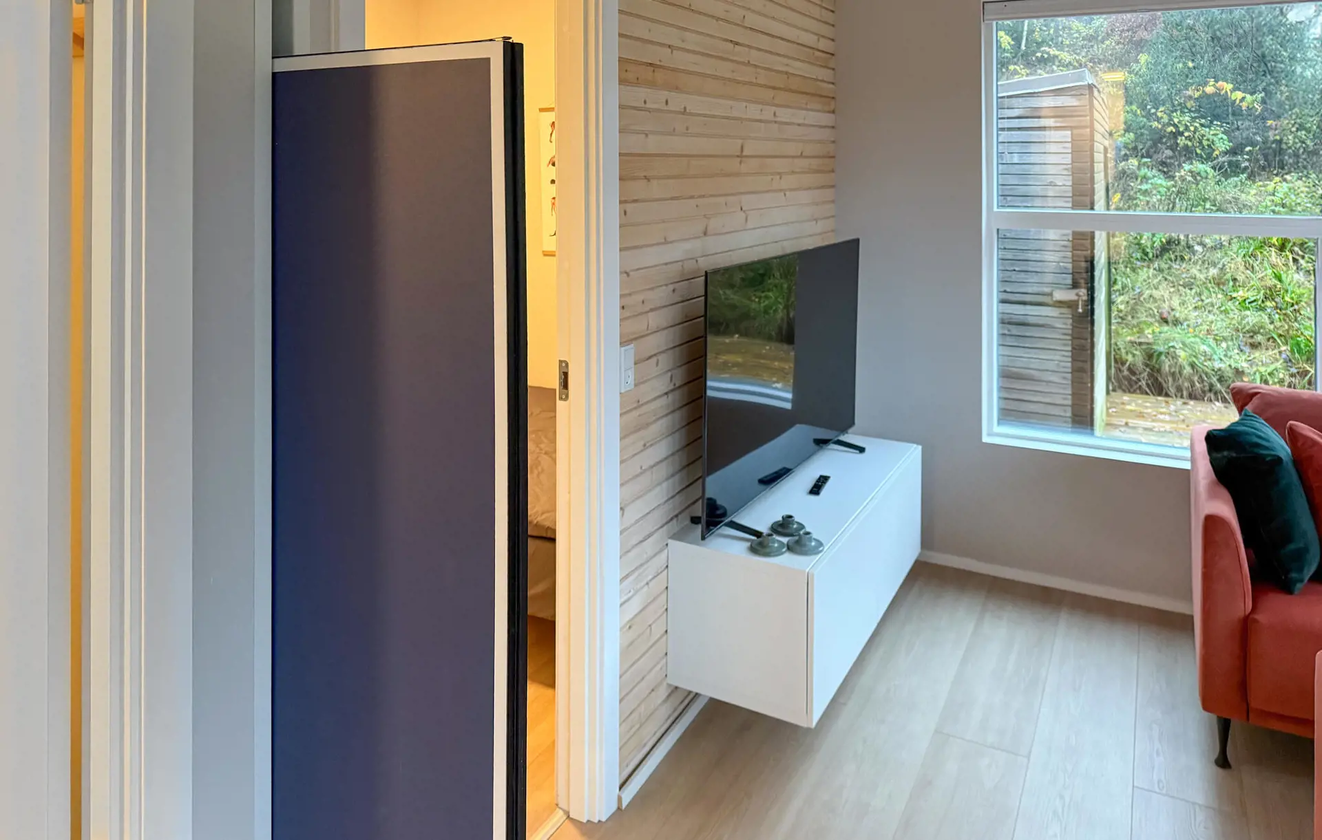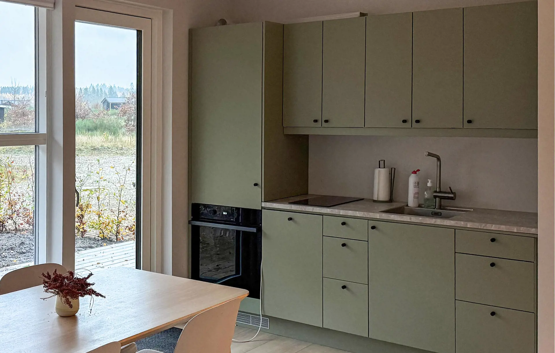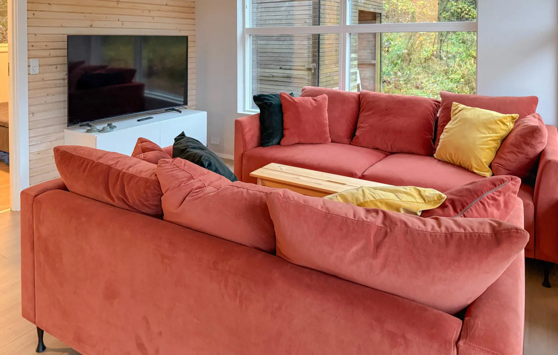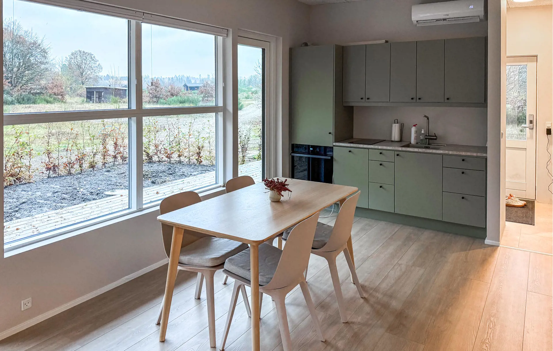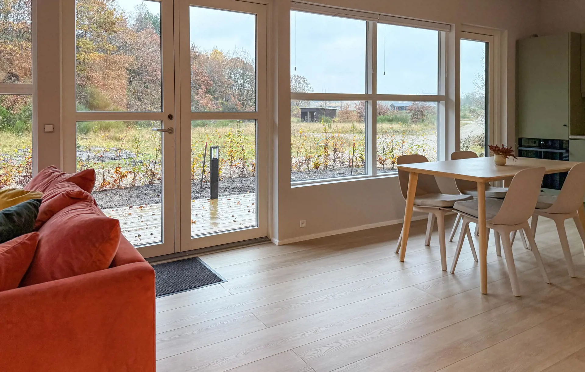 In diesem Ferienhaus verbringen Sie Ihre Auszeit in ruhiger Umgebung und genießen gleichzeitig den Komfort eines hellen, durchdachten Wohnkonzepts. Entspannen Sie im schönen Innenbereich auf den bequemen Sofas und genießen Sie den Blick in die Natur. Schauen Sie einen Film, lesen Sie ein Buch oder führen Sie anregende Gespräche – hier fühlen Sie sich schnell zu Hause. Bereiten Sie in der kompakten, modernen Küche Ihre Lieblingsgerichte zu. Der Essbereich mit hellen Holzmöbeln lädt zu gemütlichen Mahlzeiten ein und bietet einen harmonischen Übergang zwischen Wohnen und Kochen.