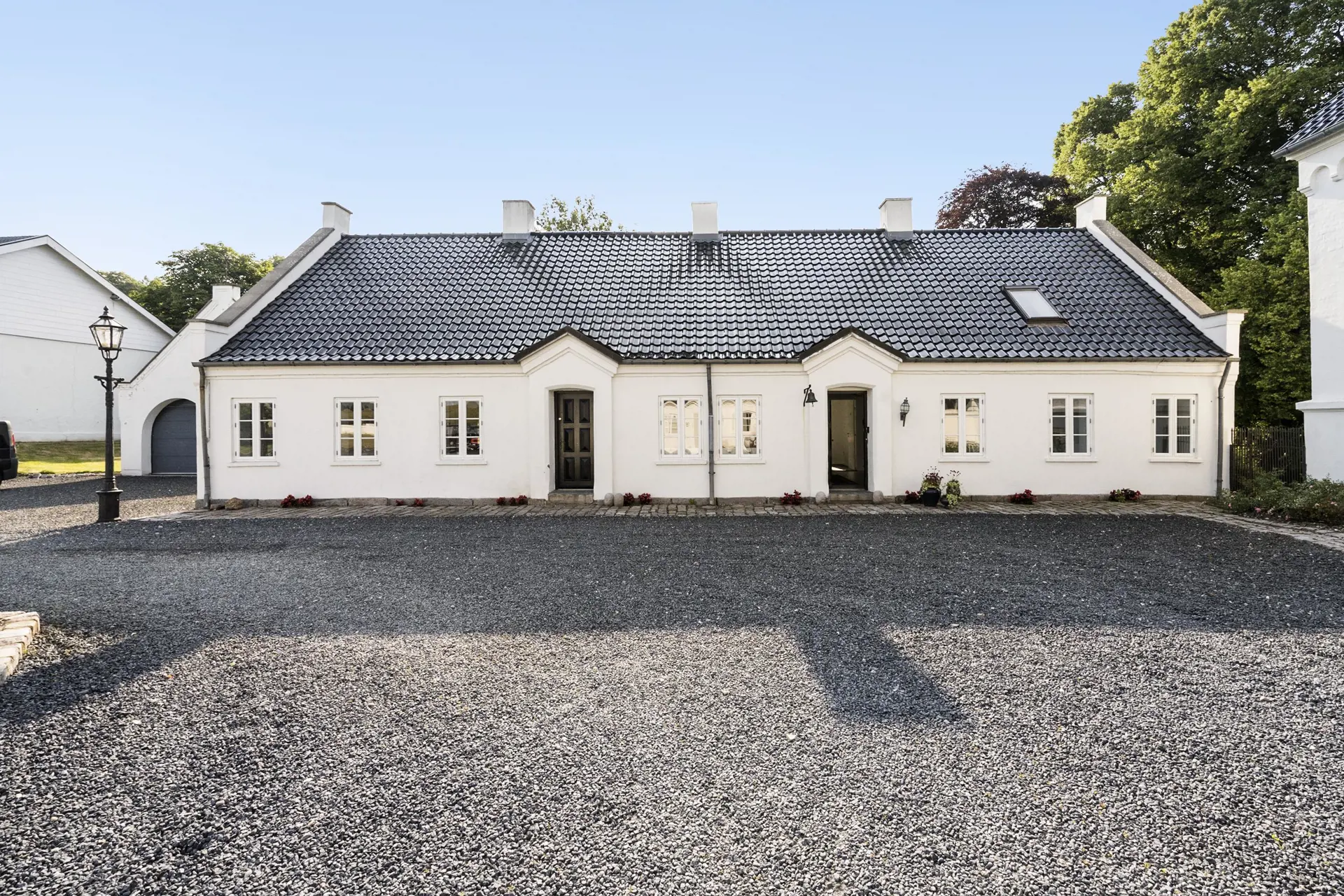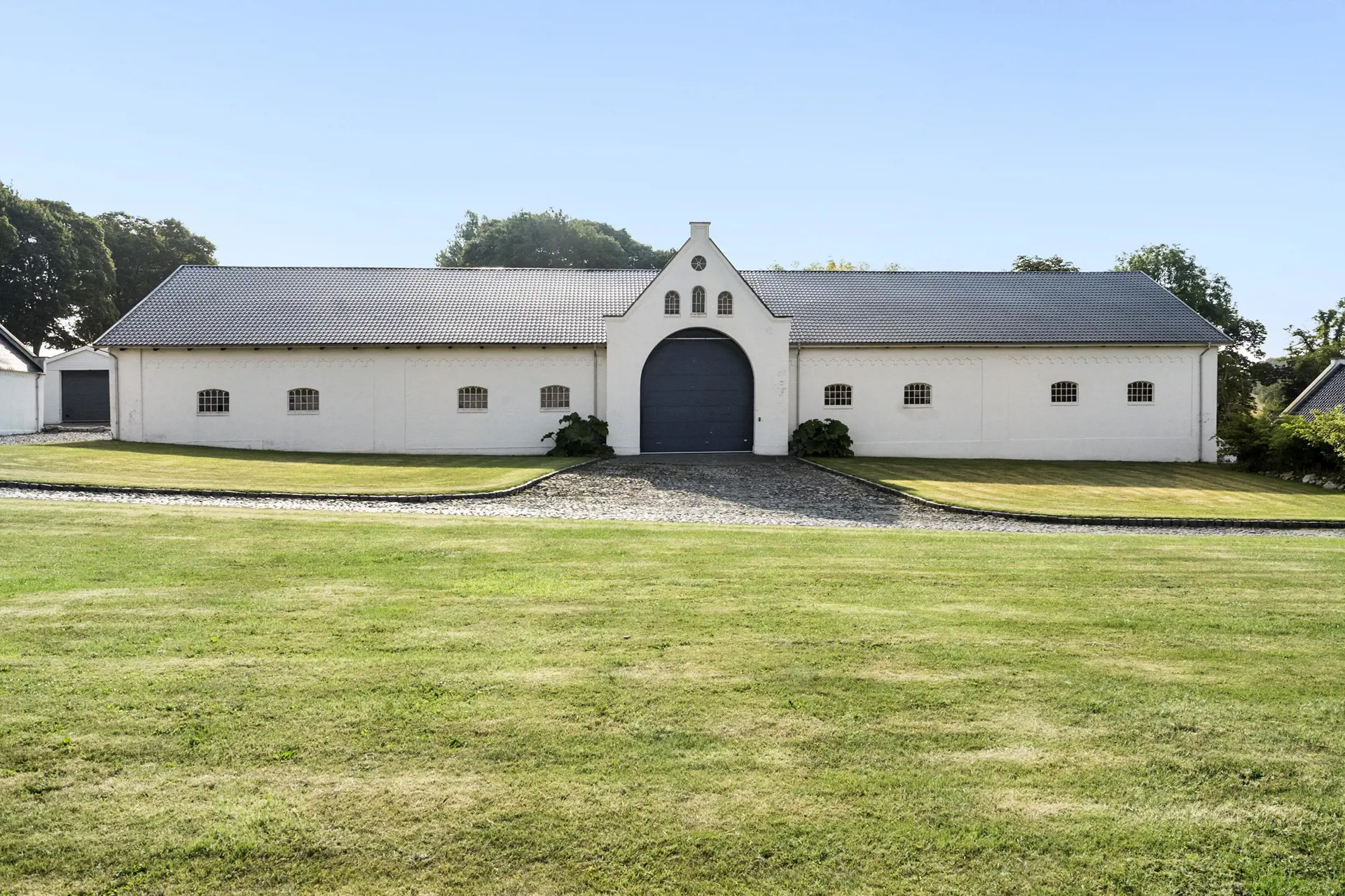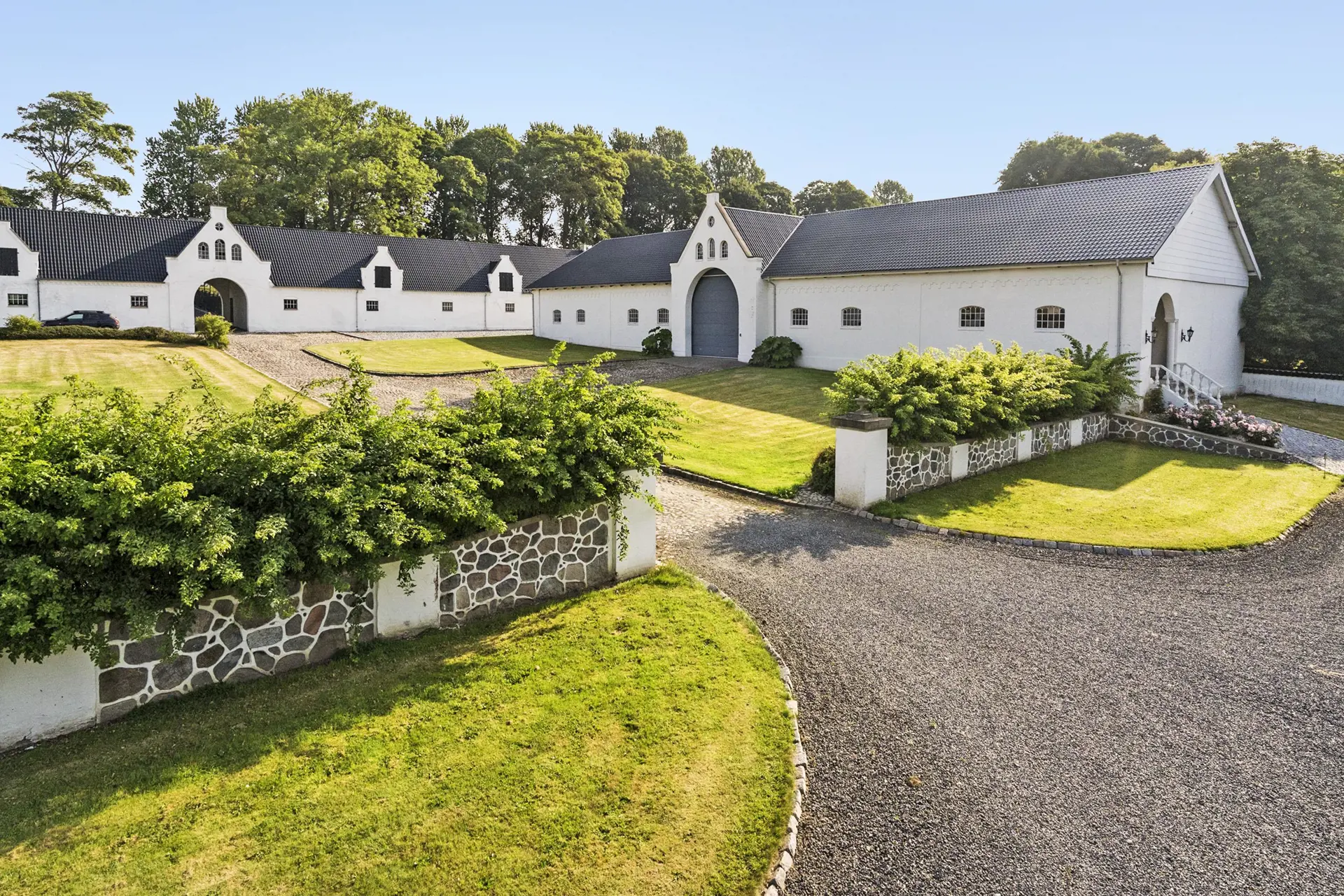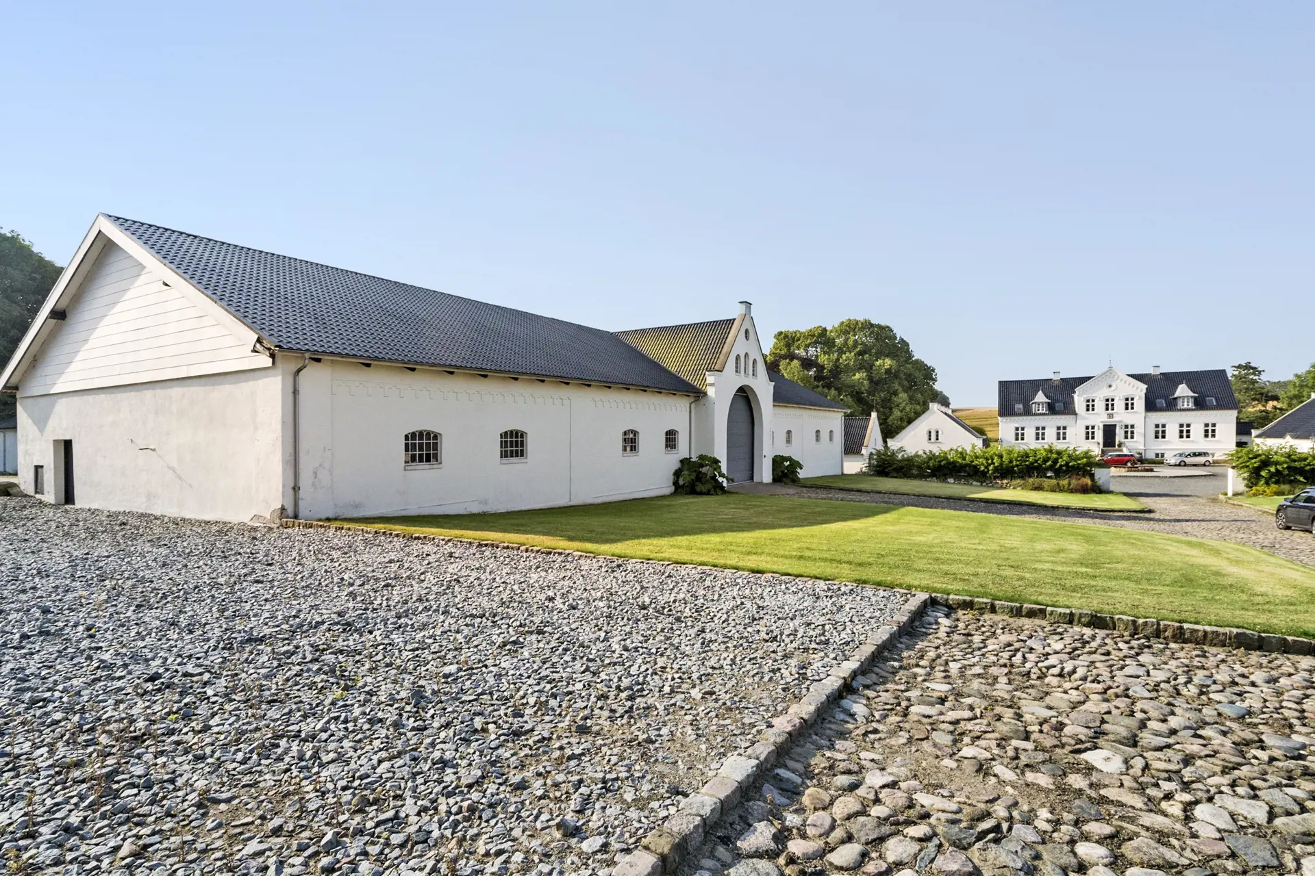 Der weiß gekalkte Hvolgaard Hovedgaard ruht hübsch platziert auf einem kleinen Hügel im Ølholm Ådal. Der heutige Drei-Flügel-Hof ist von reizvoller dänischer Landschaft umgeben. Die schönen Details der Gebäude und die helle Fassade verleihen dem Gutshof ein herrschaftliches, klassisches und elegantes Erscheinungsbild.
