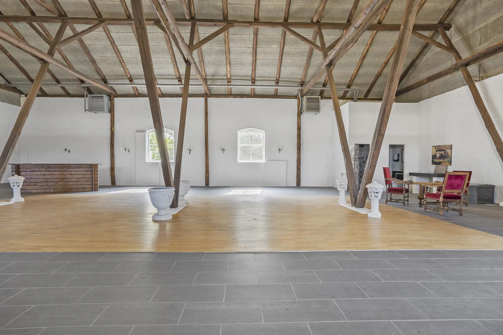 Der Festsaal mit Platz für rund 120 Gäste eignet sich hervorragend für Firmenarrangements und Feierlichkeiten. Beachten Sie bitte, dass das Urlaubsdomizil lediglich 32 Schlafplätze bietet. Die Nutzung des Festsaals ist bereits im Mietpreis inbegriffen. Im Festsaal stehen Ihnen Tische, Stühle und Porzellan für 120 Personen zur Verfügung. Die anschließende Reinigung ist im Preis inbegriffen. Wir stellen für Sie gerne den Kontakt zu Caterern und anderen Partnern her.