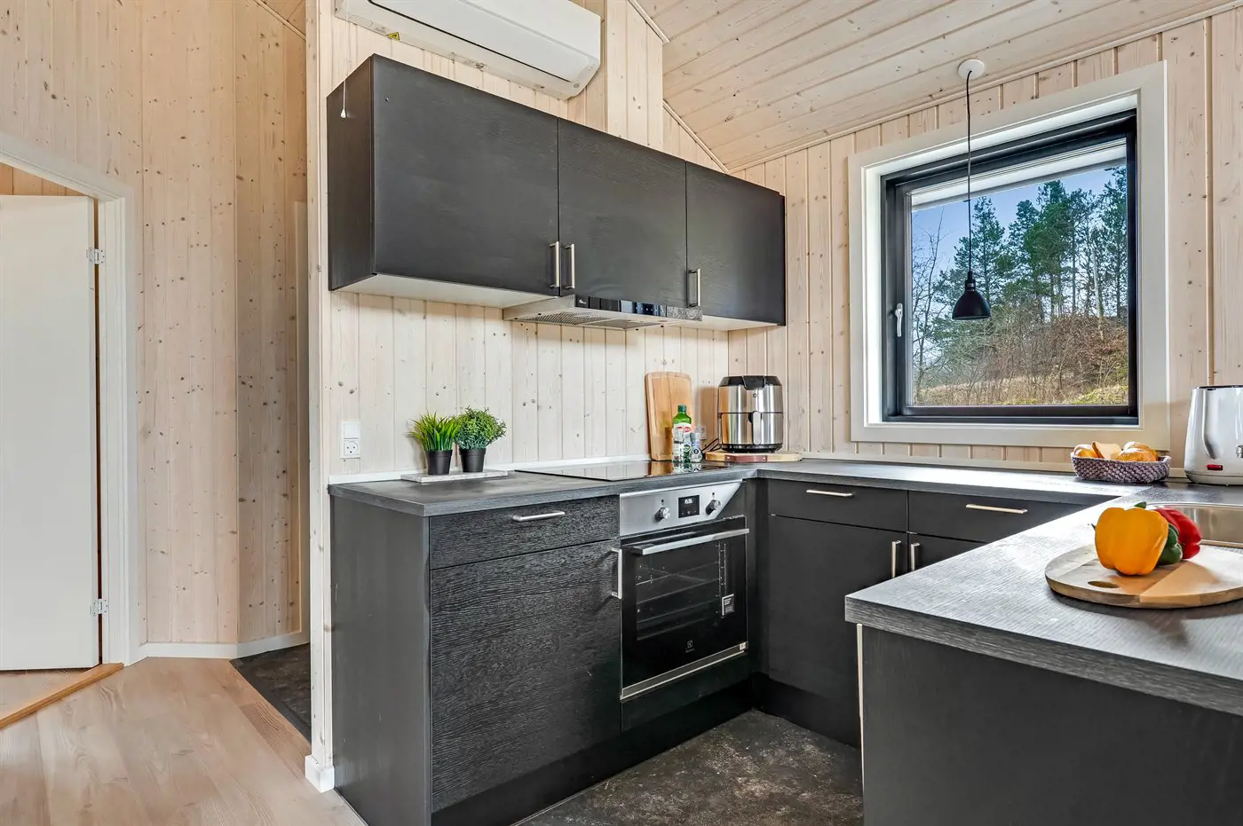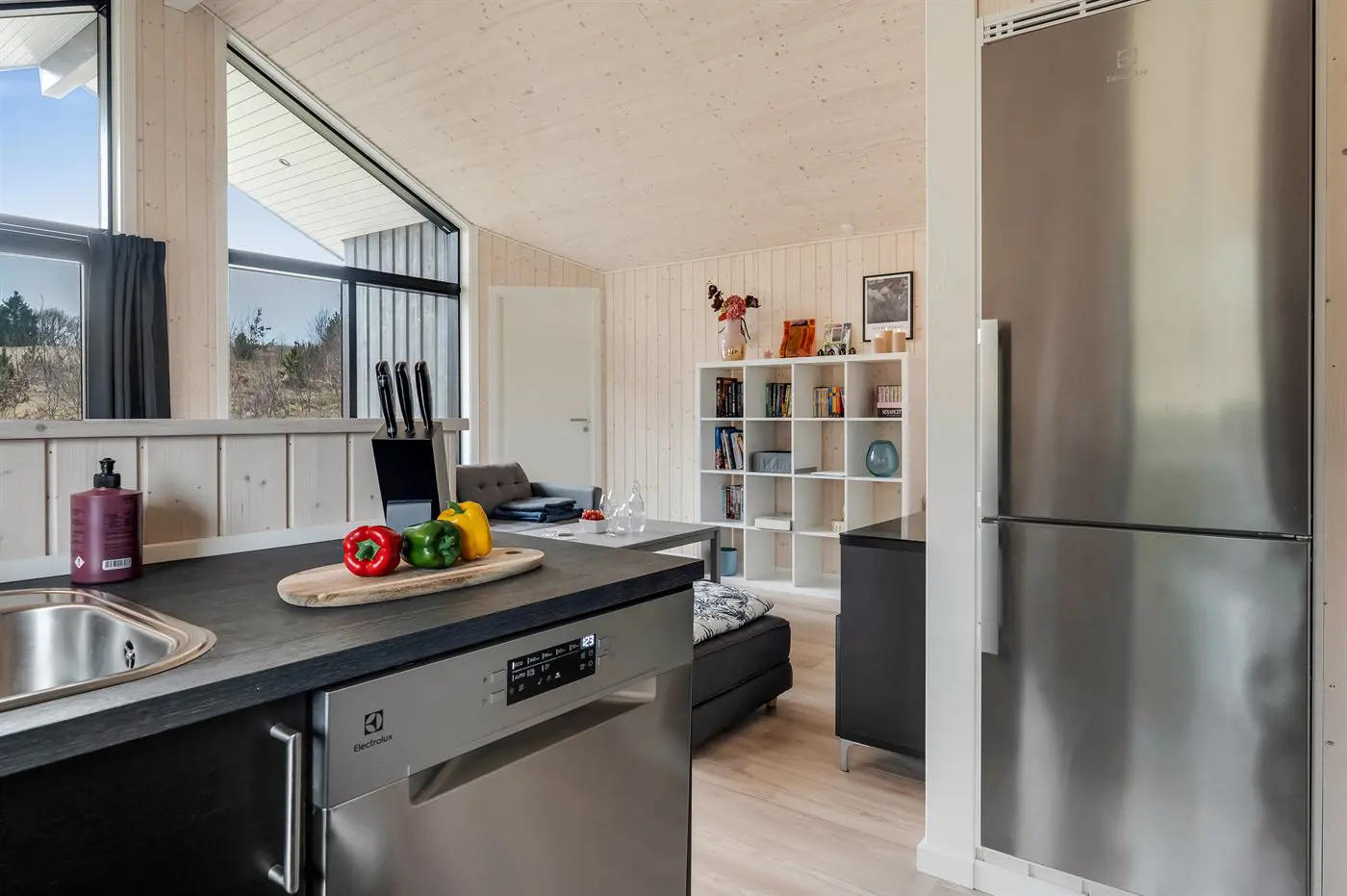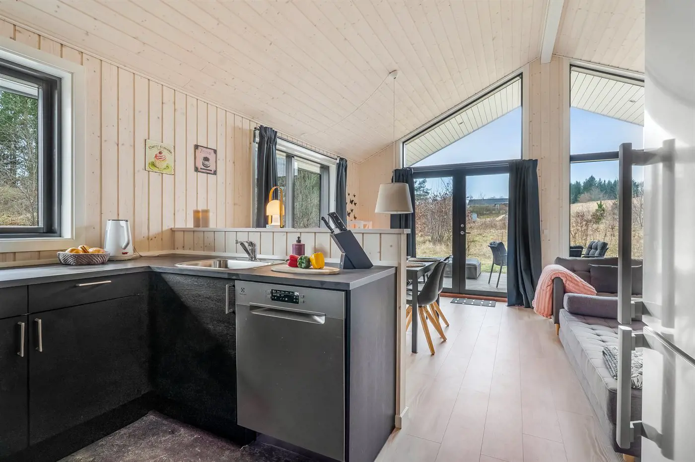 Die Küche ist mit Kühlschrank ausgestattet. Außerdem gibt es 4 Induktions-Kochzonen, Umluftofen, Airfryer sowie Geschirrspüler.