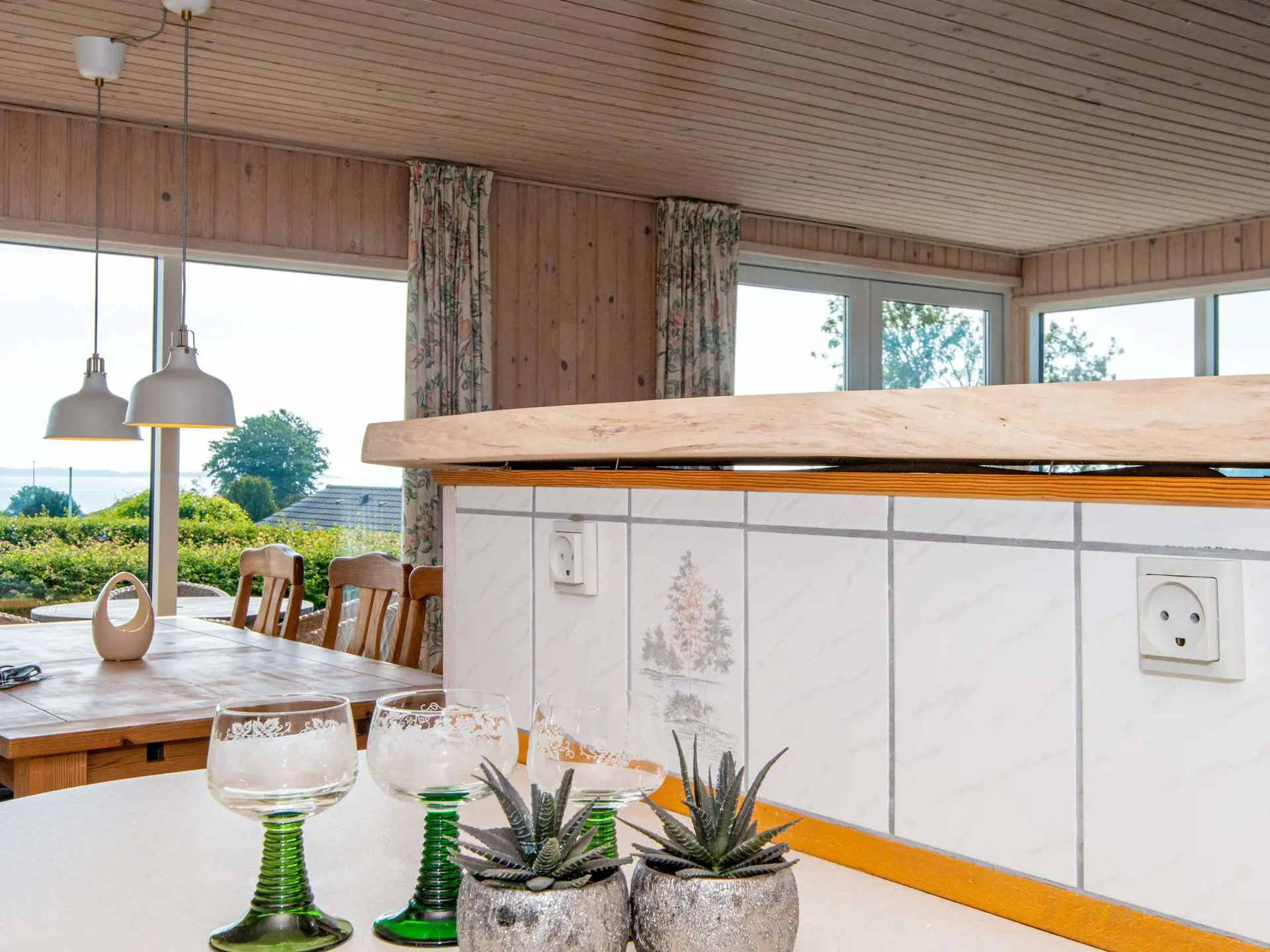 Den Mittelpunkt des Hauses bildet der Küchen-/Wohnbereich mit Ess- und Sitzecke sowie Ausblick zur nahen Küste. In der Küche wurde ein praktischer Wasserhahn installiert, der unmittelbar kochendes Wasser für z.B. den Kaffee oder Tee bereitstellt. Für kühlere Jahreszeiten steht im Haus ein Holzofen bereit. Außerdem wurde zum Heizen des Hauses eine energieeffiziente und somit klimafreundliche Wärmepumpe installiert, auch um die Nebenkosten zu reduzieren. An heißen Sommertagen kann diese Pumpe sogar als Klimaanlage genutzt werden.