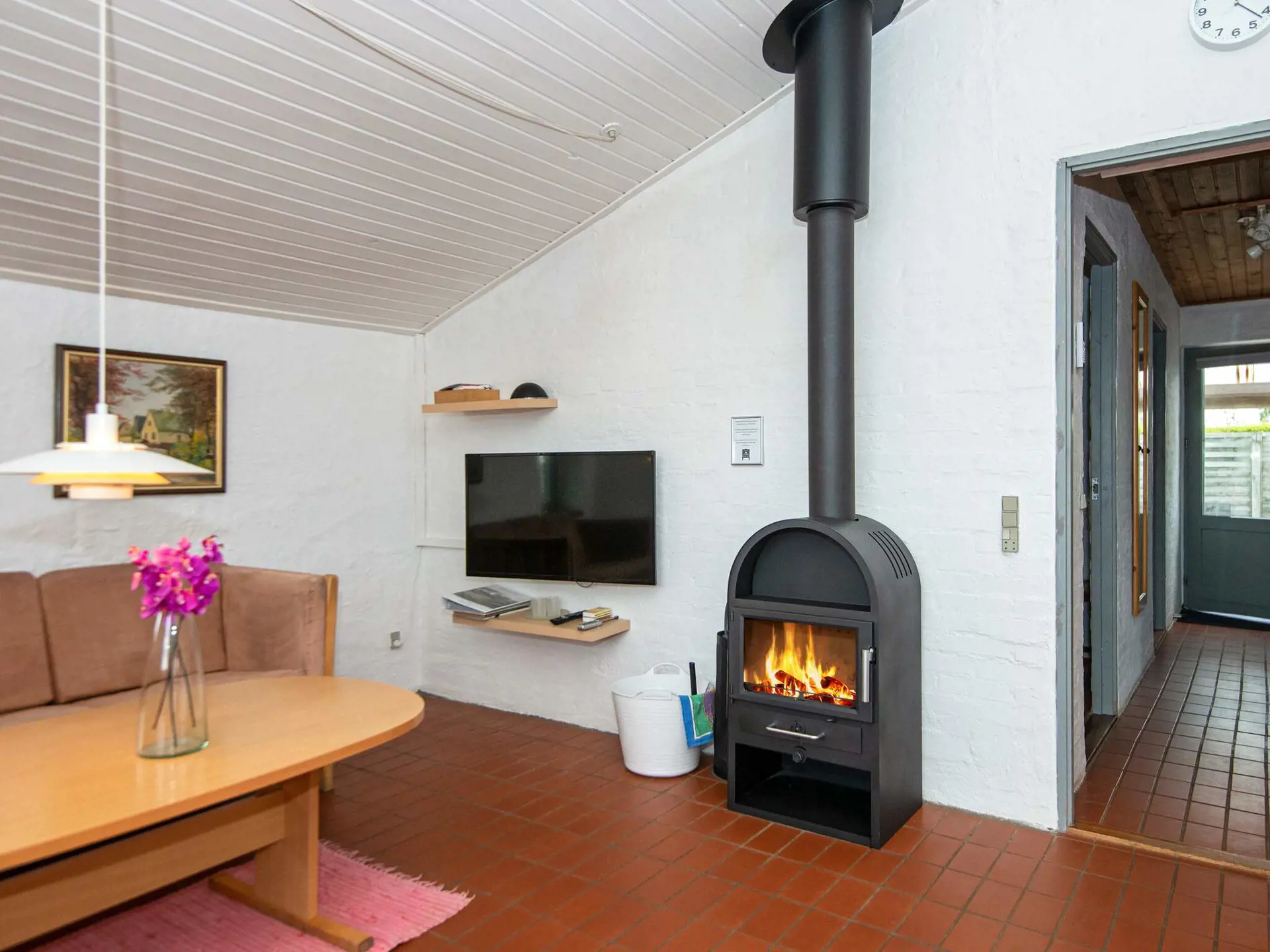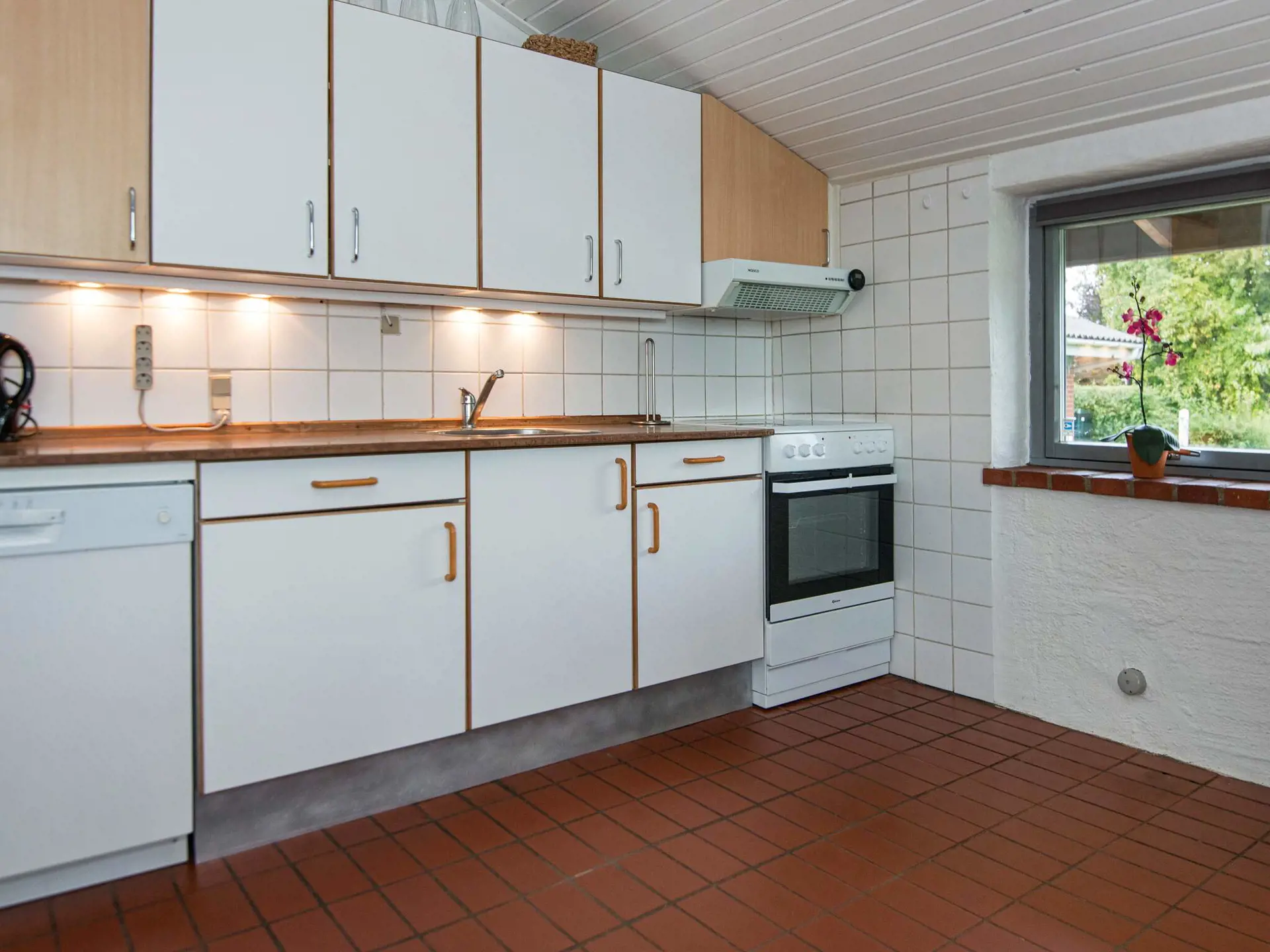 Das Haus liegt auf einem schön geschützten Rasengrundstück und hat einen großen Wintergarten, in den man sich bei kühlerem oder windigem Wetter zurückziehen kann. Im Anschluss daran liegt der offene Küchen-/Wohnbereich inkusive Essecke und Holzofen für kühlere Tage. Die Erwärmung des Hauses übernimmt ansonsten auch die energieeffiziente Wärmepumpe. Außerdem drei Schlafzimmer und ein Bad mit Dusche/WC im Haus. Die Waschmaschine ist ein einem Nebengebäude untergebracht.