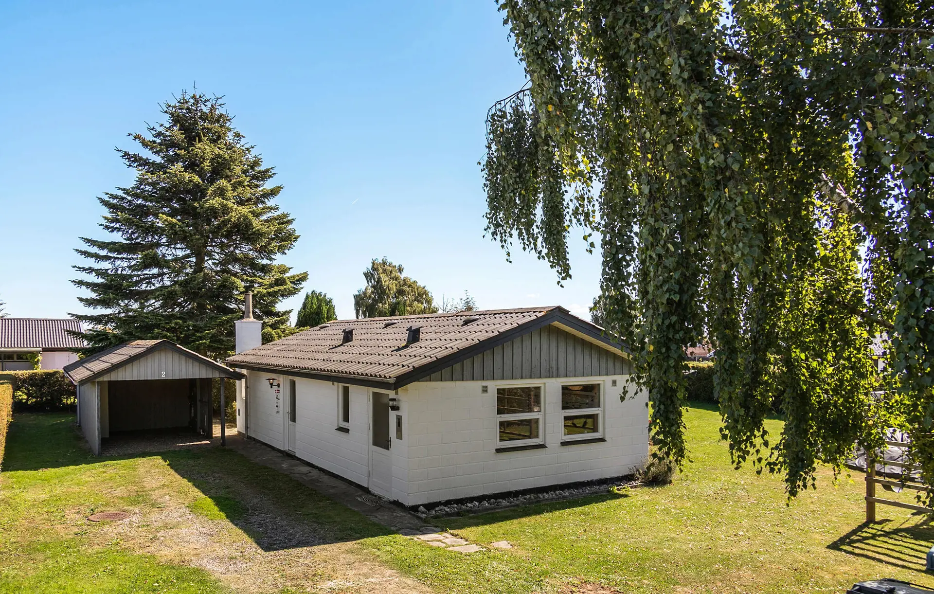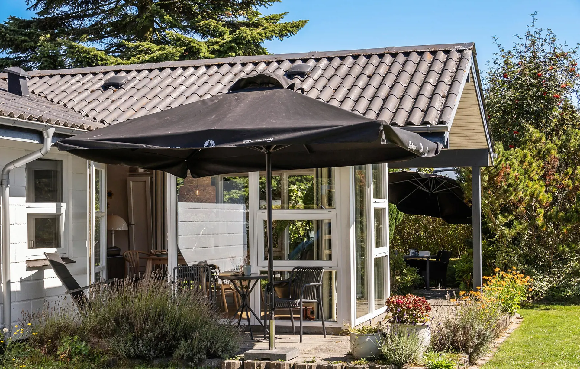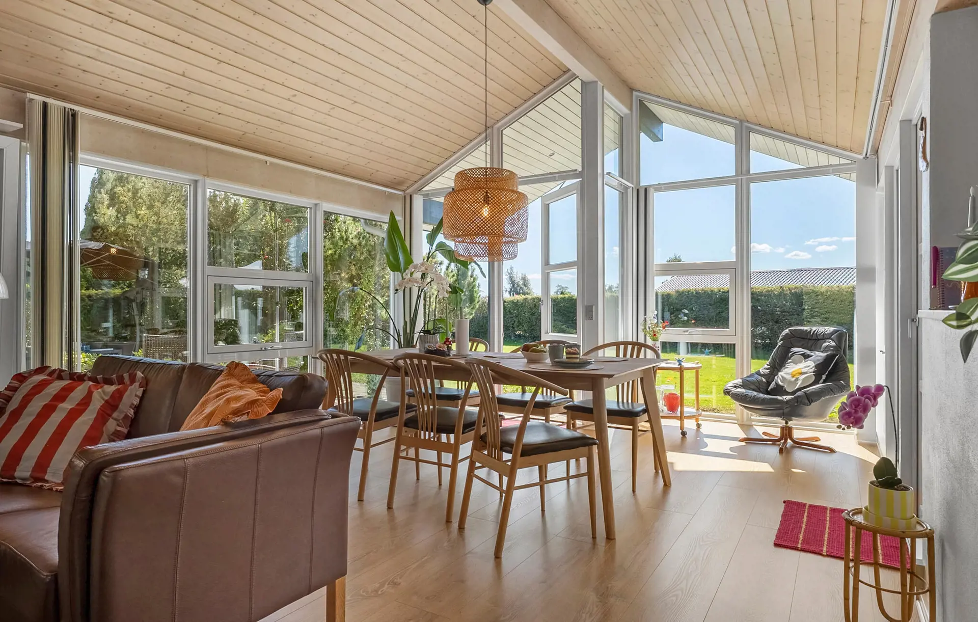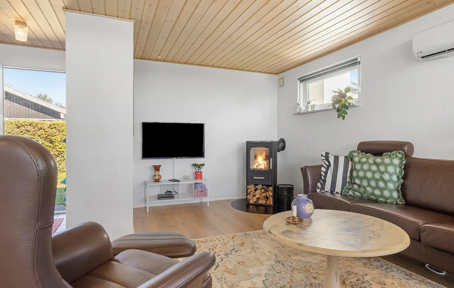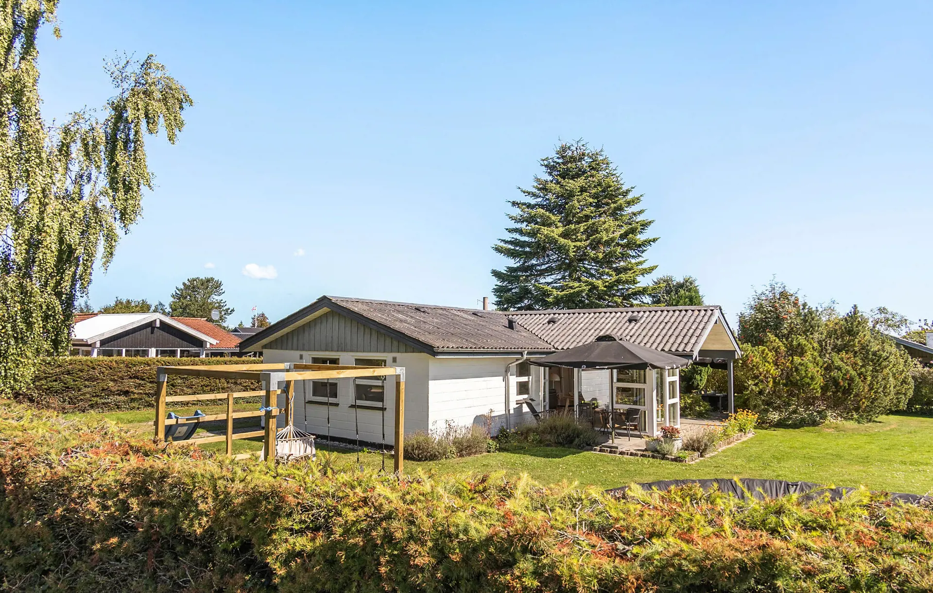 Dieses großzügige Haus ist wie geschaffen für eine erholsame Auszeit vom Alltag. Durch große Fensterfronten fällt viel warmes Tageslicht ins Innere, wo Sie gemütlich bei einer duftenden Tasse Kaffee entspannen können. Streamen Sie Ihre Lieblingsserie, zaubern Sie eine köstliche Mahlzeit in der modernen Küche oder entzünden Sie an kühleren Tagen den Kaminofen für besonders wohlige Wärme.