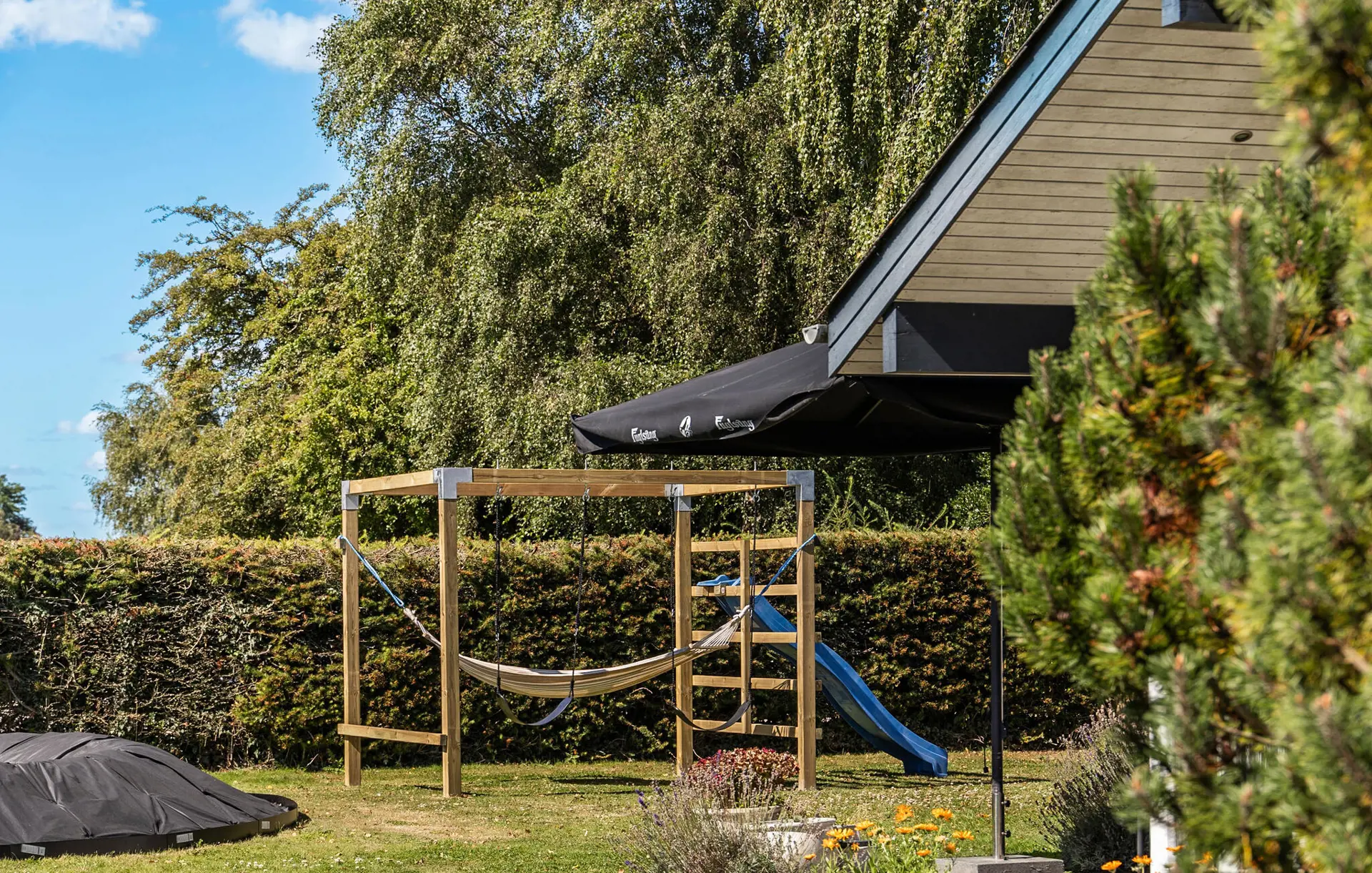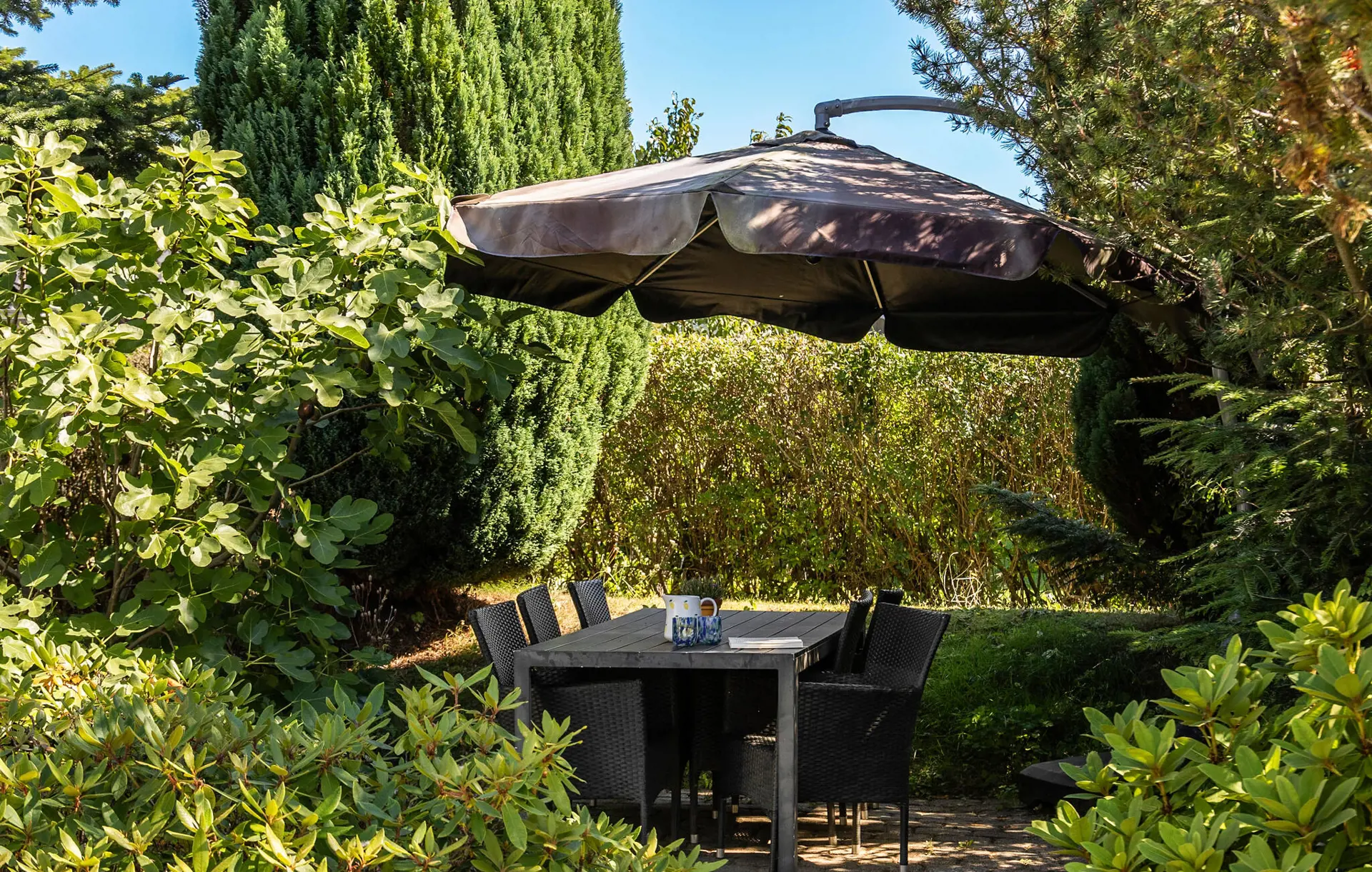Der große Garten lädt zu jeder Tageszeit zum Verweilen ein: Genießen Sie schon morgens beim Frühstück die Ruhe der Natur und vertiefen Sie sich anschließend in Ihre Urlaubslektüre. Die Jüngsten können nach Herzenslust schaukeln oder das Trampolin in Beschlag nehmen. Abends können Sie die Feuerstelle entzünden und den Tag entspannt beim Stockbrotbacken ausklingen lassen.