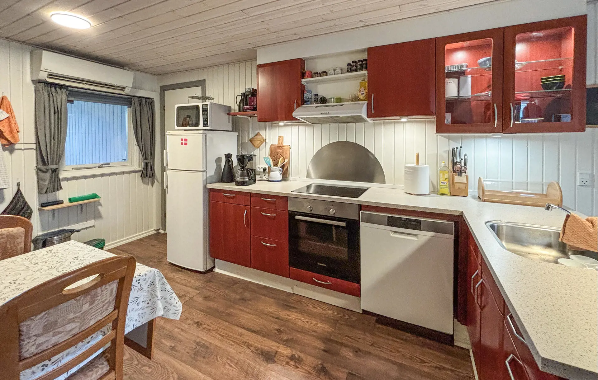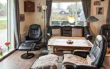 Lassen Sie sich im wohnlichen Wohnzimmer mit bequemen Sesseln und Sofa nieder und genießen Sie entspannte Stunden vor dem Kaminofen. Verbringen Sie gemeinsame Abende am großen Esstisch, der viel Platz für leckere Mahlzeiten, anregende Gespräche und lustige Spiele bietet. Nutzen Sie die praktische Küche mit großzügiger Arbeitsfläche, um auch im Urlaub Ihre Lieblingsgerichte zuzubereiten. Entspannen Sie nach einem aktiven Tag und genießen Sie ruhige Momente bei Musik und einem guten Buch.