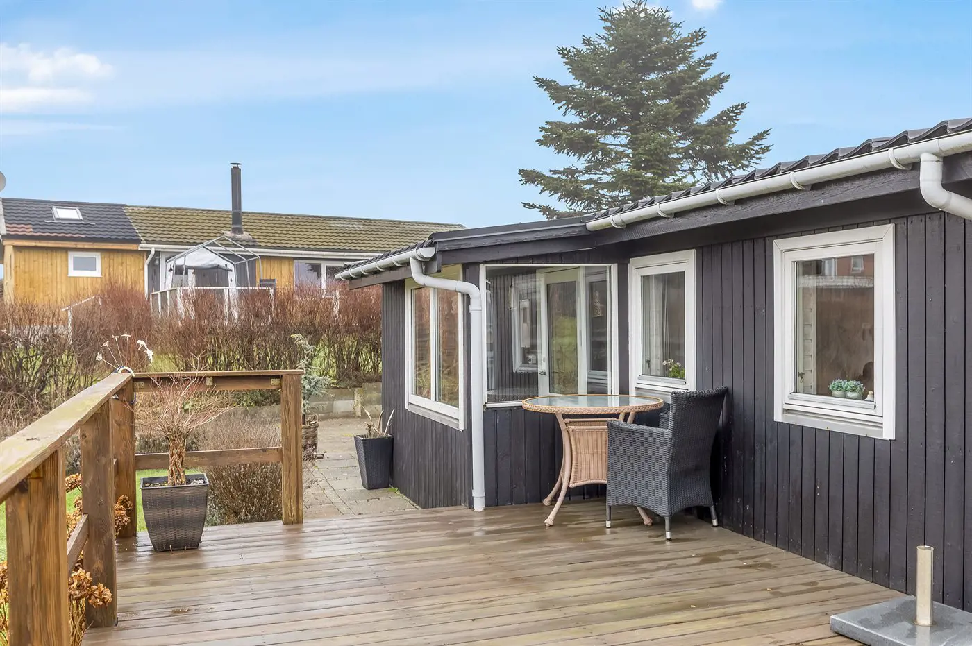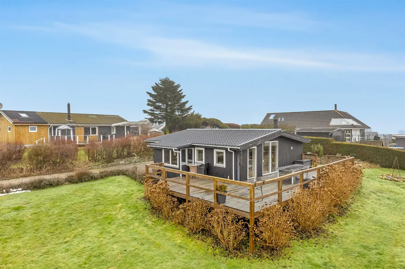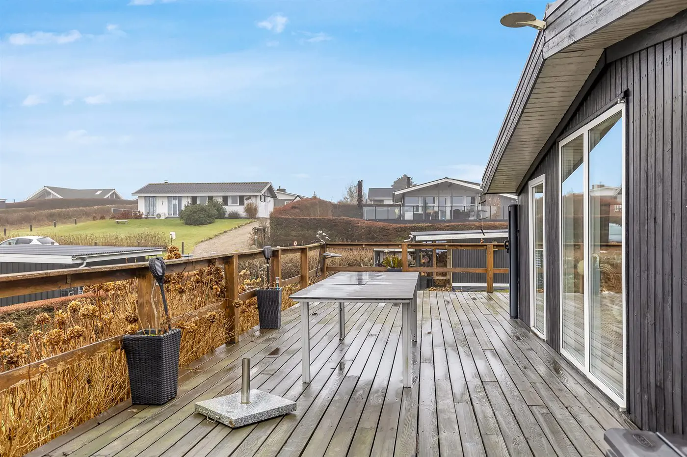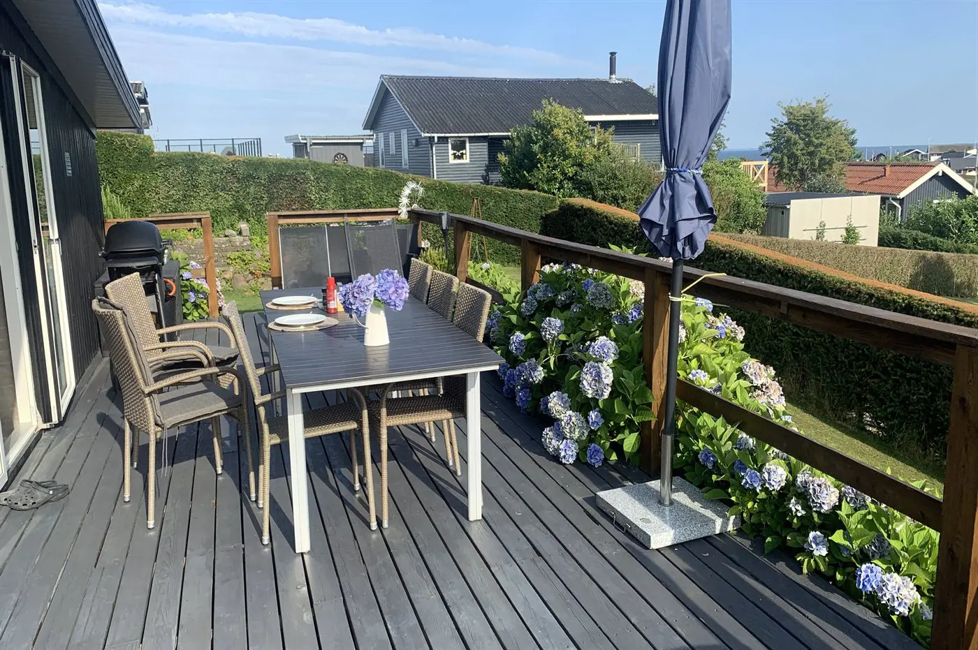 Draußen umgibt die Terrasse das Haus beinahe vollständig und bietet schöne Möglichkeiten, das Leben im Freien von morgens bis abends zu genießen – und das sogar mit Blick auf das Wasser von Hejlsminde.