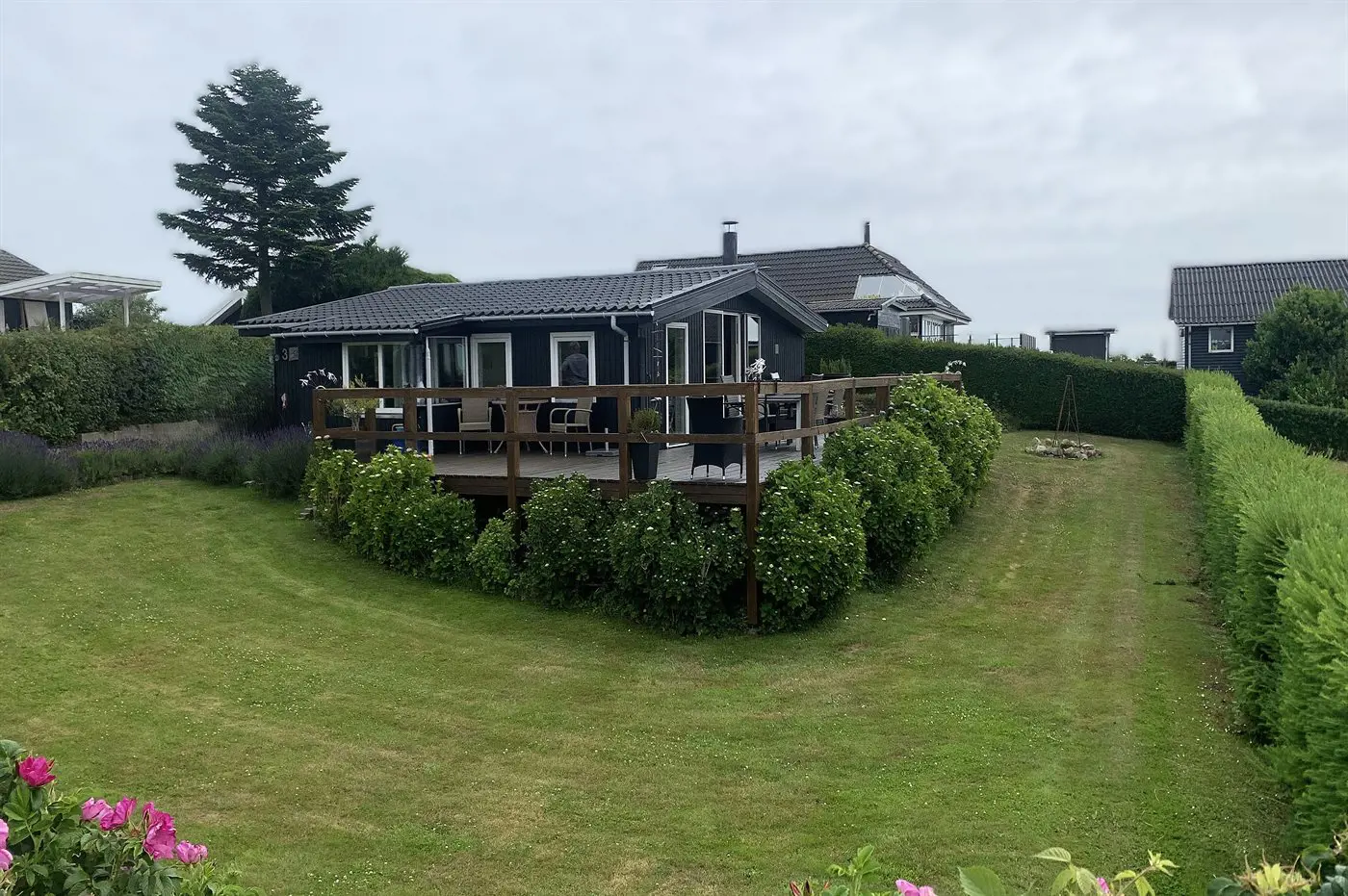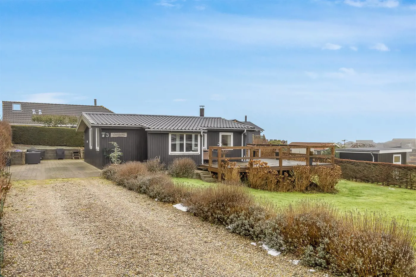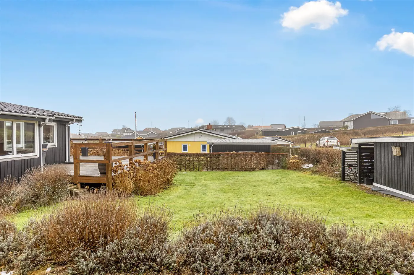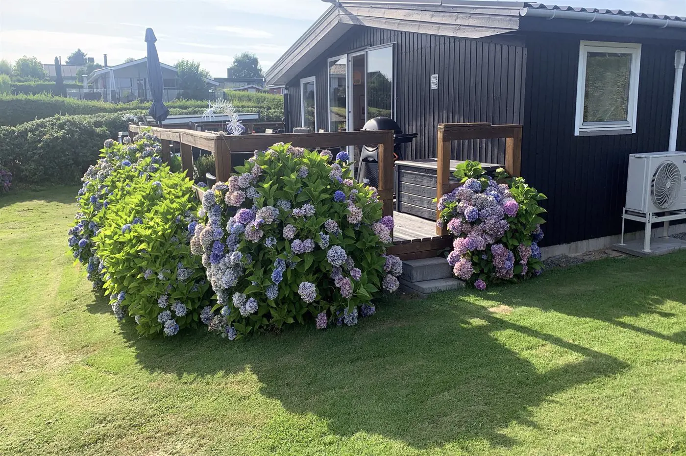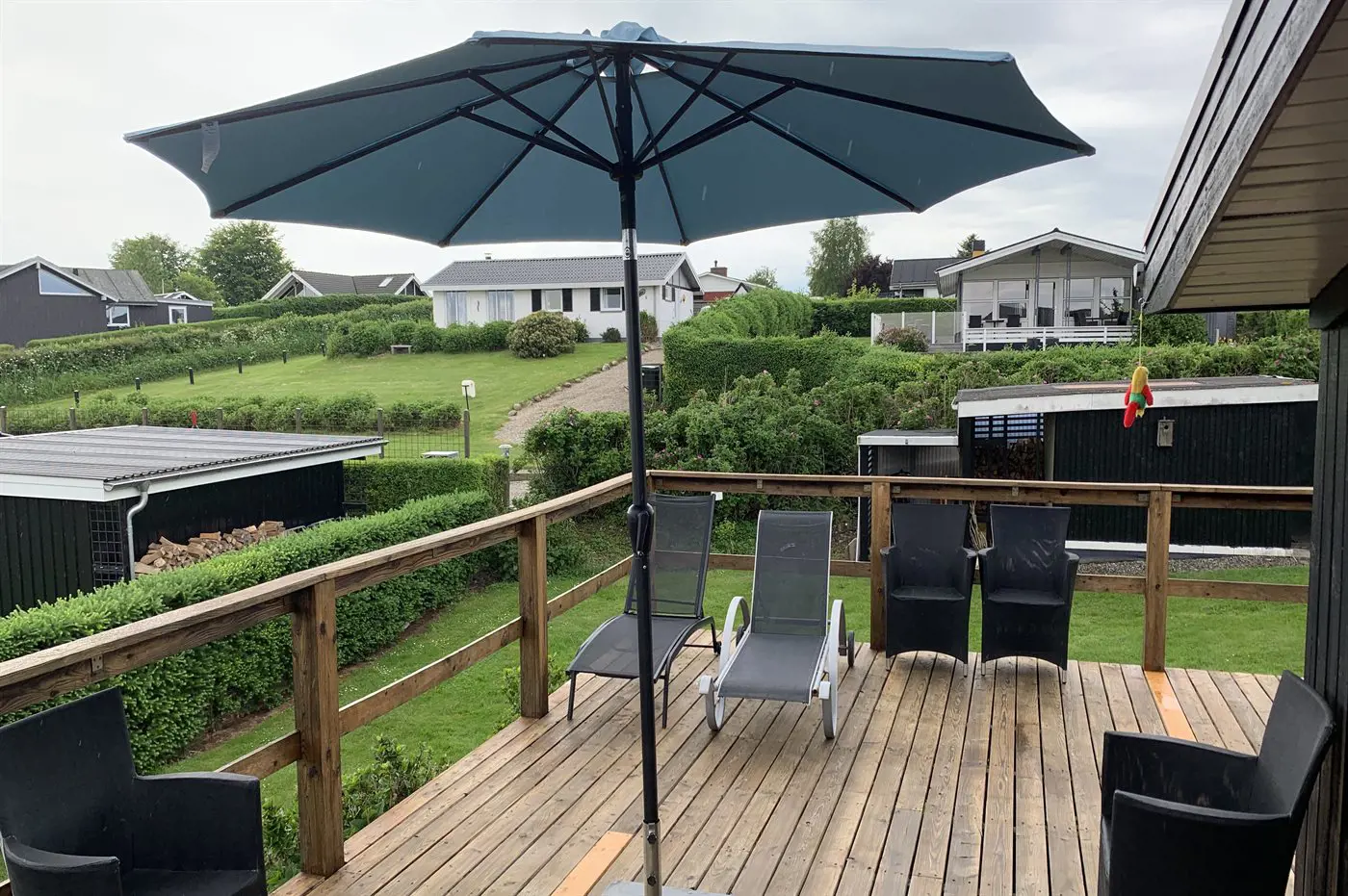 Draußen umgibt die Terrasse das Haus beinahe vollständig und bietet schöne Möglichkeiten, das Leben im Freien von morgens bis abends zu genießen – und das sogar mit Blick auf das Wasser von Hejlsminde.