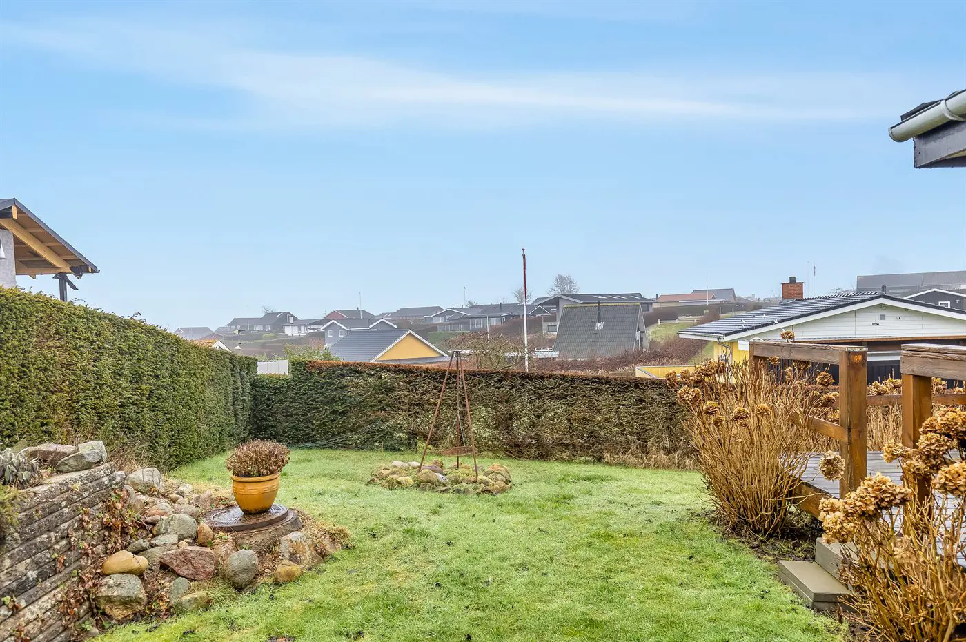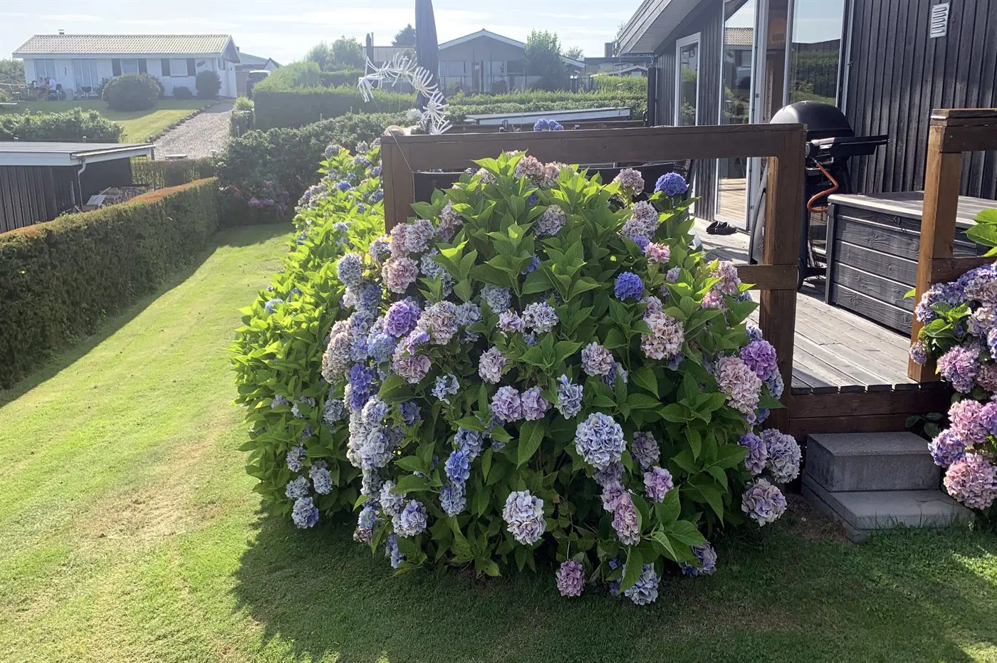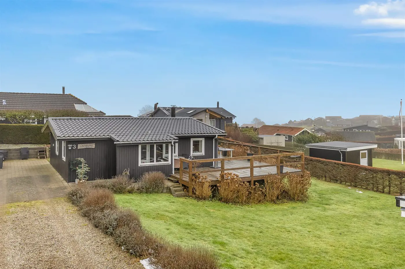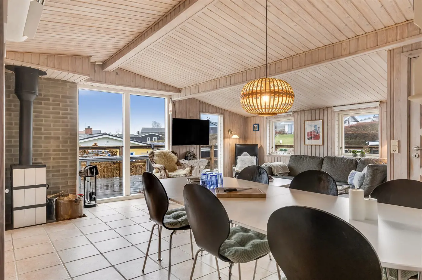 Draußen umgibt die Terrasse das Haus beinahe vollständig und bietet schöne Möglichkeiten, das Leben im Freien von morgens bis abends zu genießen – und das sogar mit Blick auf das Wasser von Hejlsminde.