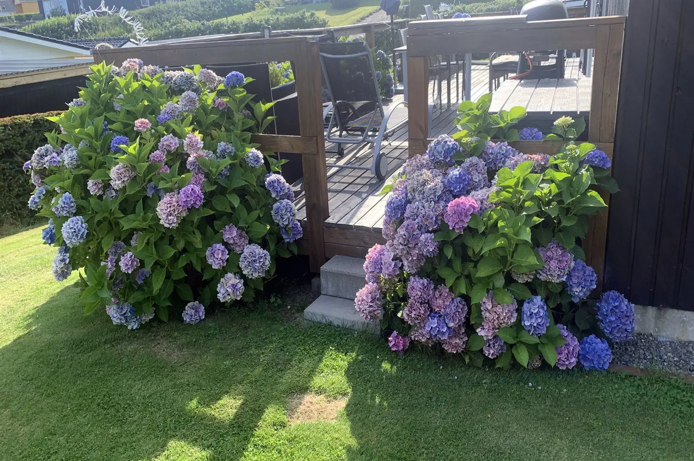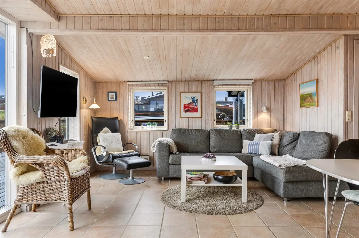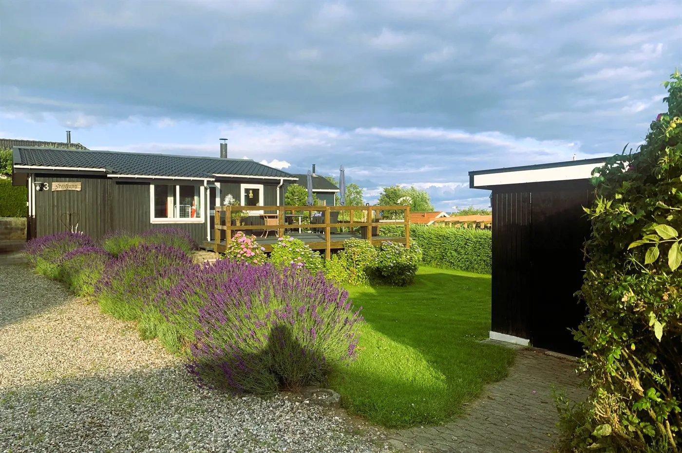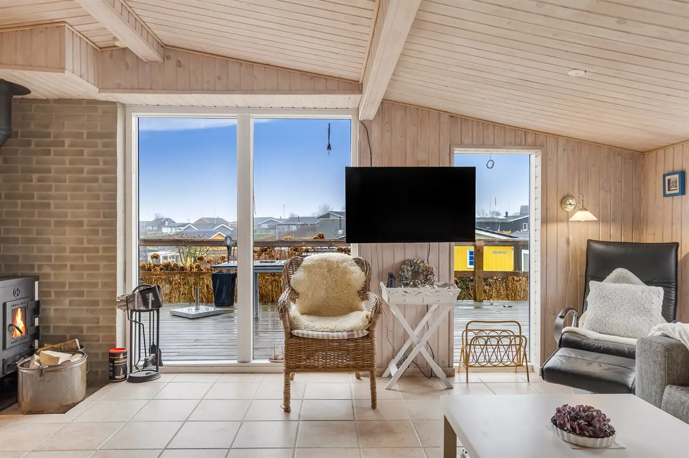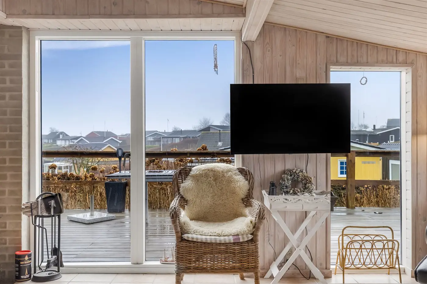 Draußen umgibt die Terrasse das Haus beinahe vollständig und bietet schöne Möglichkeiten, das Leben im Freien von morgens bis abends zu genießen – und das sogar mit Blick auf das Wasser von Hejlsminde.