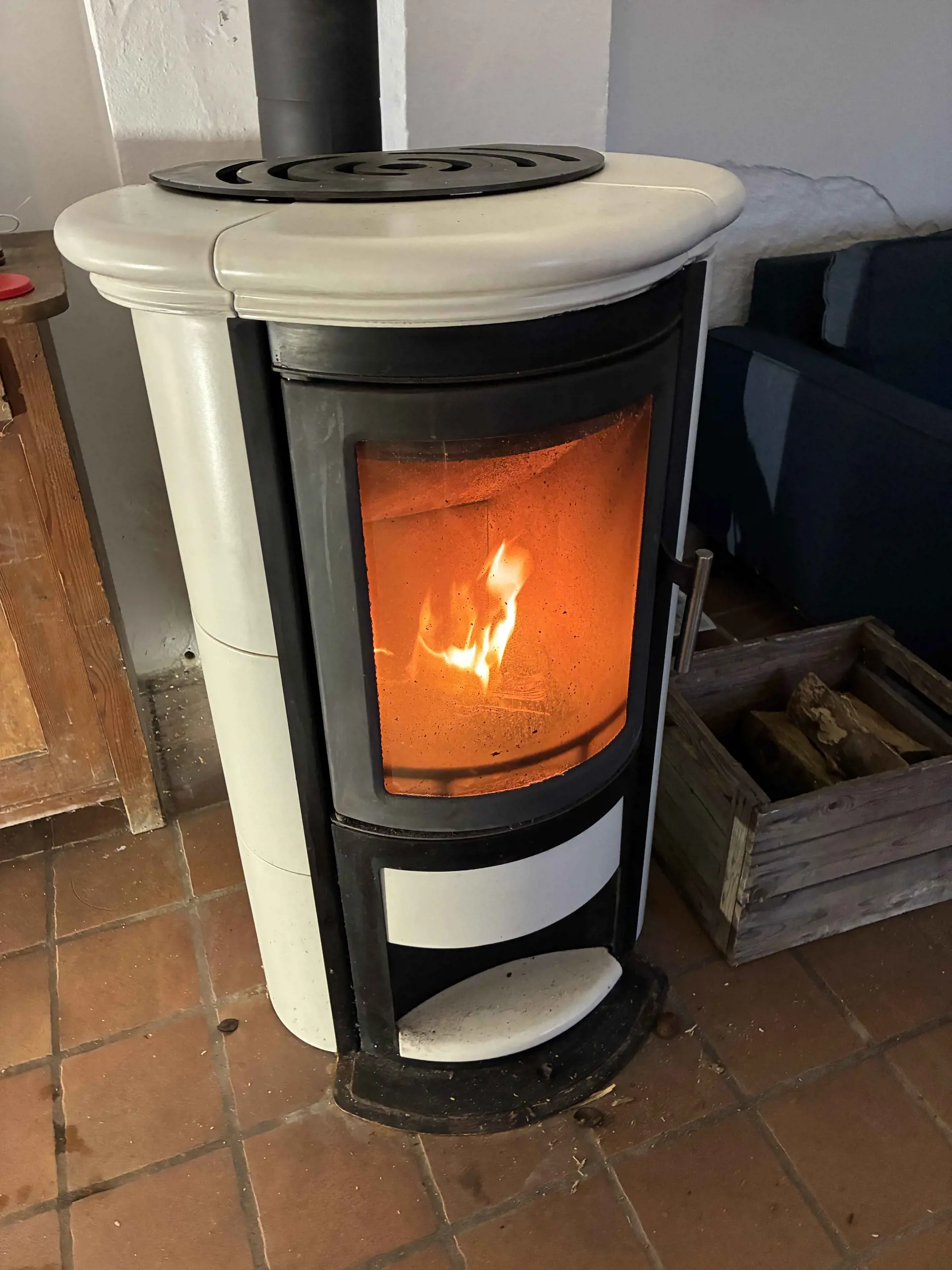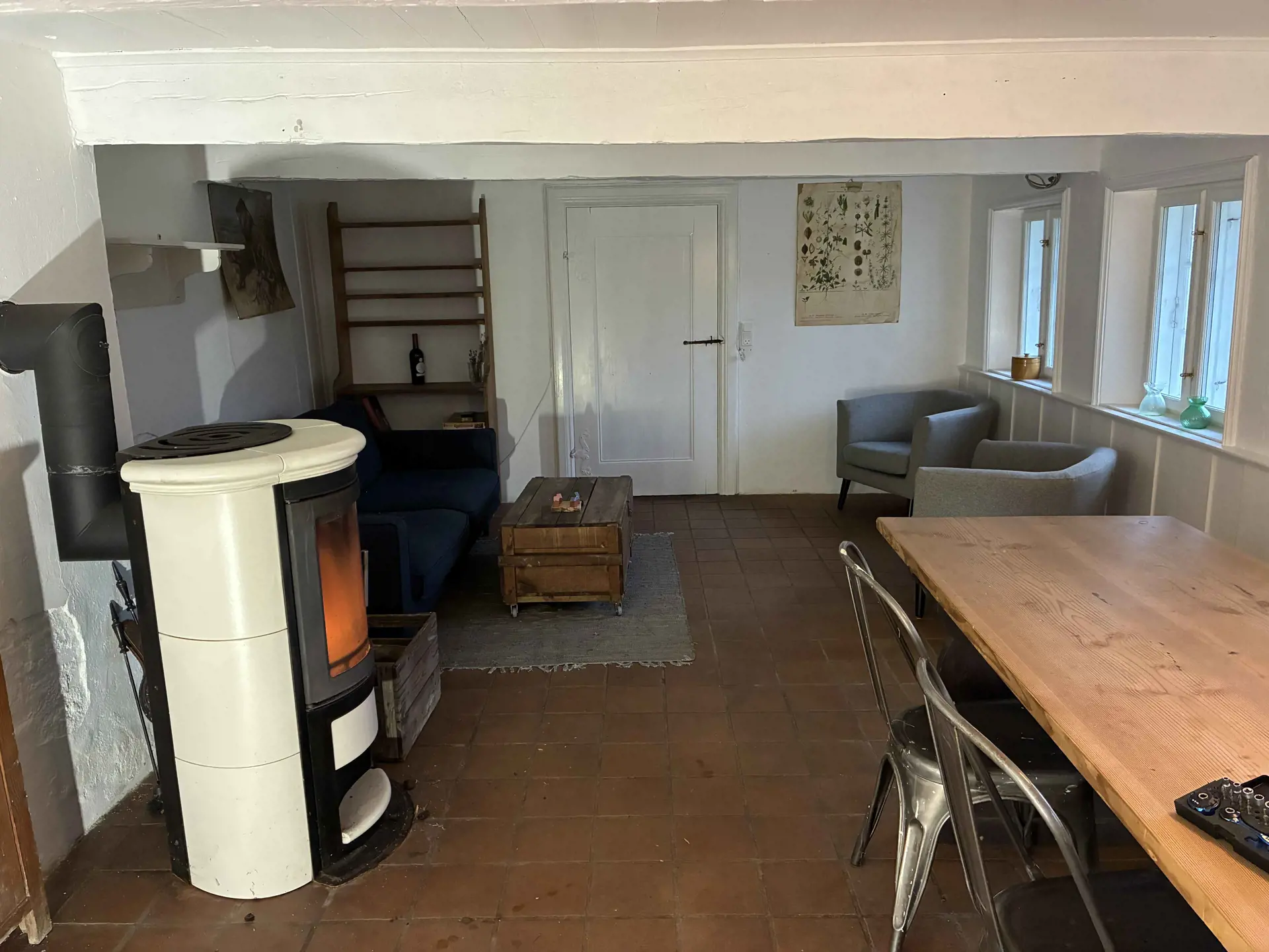 Das Wohnzimmer ist der natürliche Mittelpunkt des Hauses und verfügt über einen Kaminofen sowie eine Luft-Luft-Wärmepumpe für angenehme Temperaturen das ganze Jahr über. Es gibt ausreichend Platz für Entspannung und ruhige Abende, und Internet ist vorhanden.