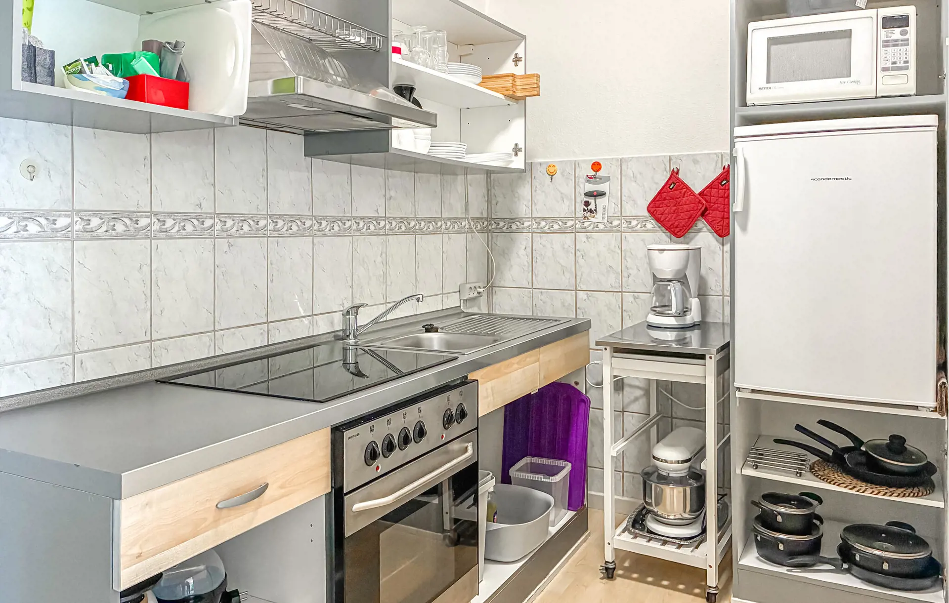 In dieser praktischen Wohnung finden Sie alles, was Sie für erholsame Urlaubstage benötigen. Machen Sie es sich in der Sitzecke bequem, genießen Sie eine Tasse Kaffee oder lesen Sie in aller Ruhe ein gutes Buch. Und in der kleinen Küche können Sie unkompliziert Ihre Lieblingsgerichte zubereiten.
