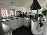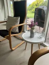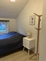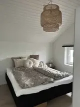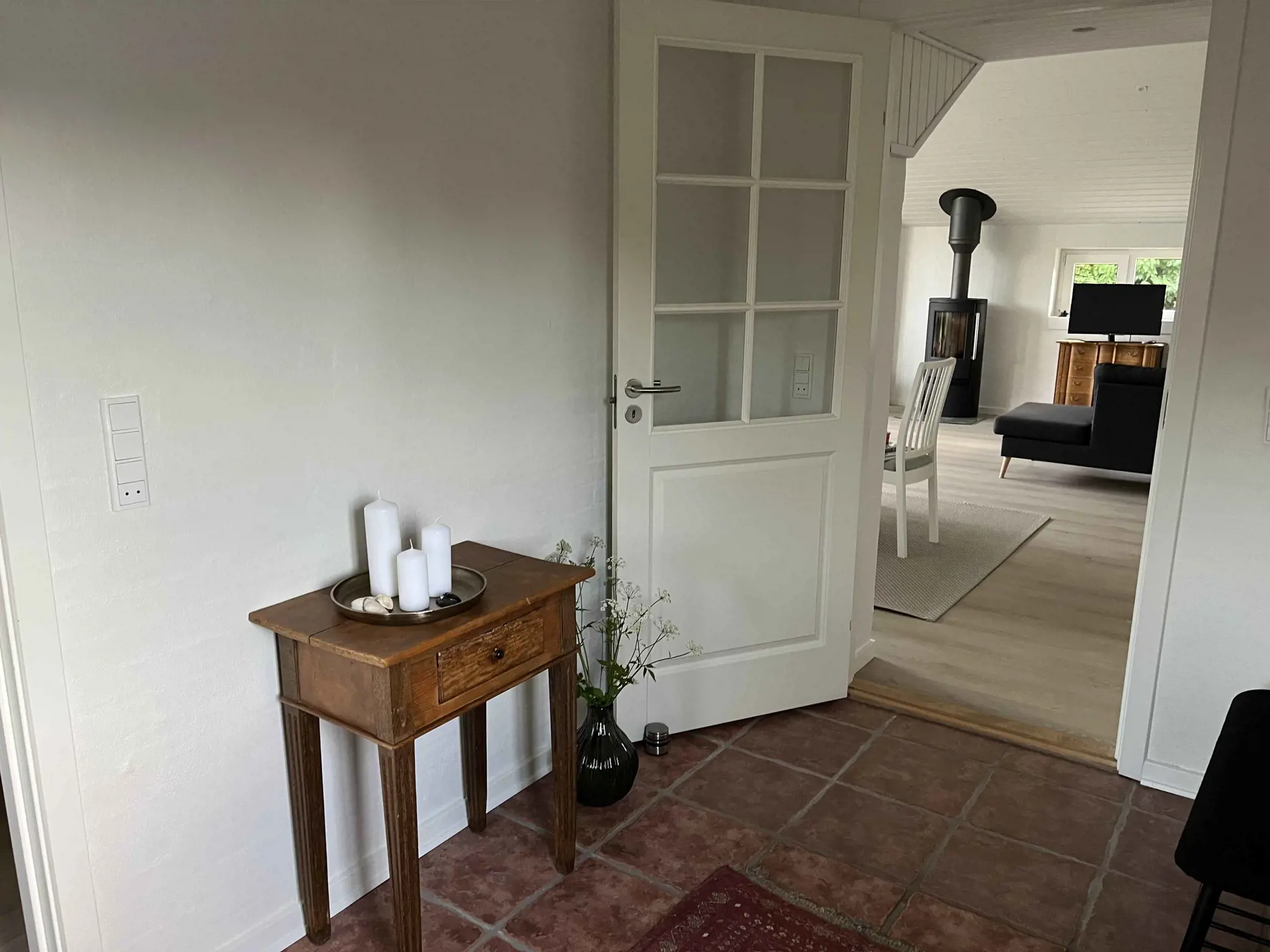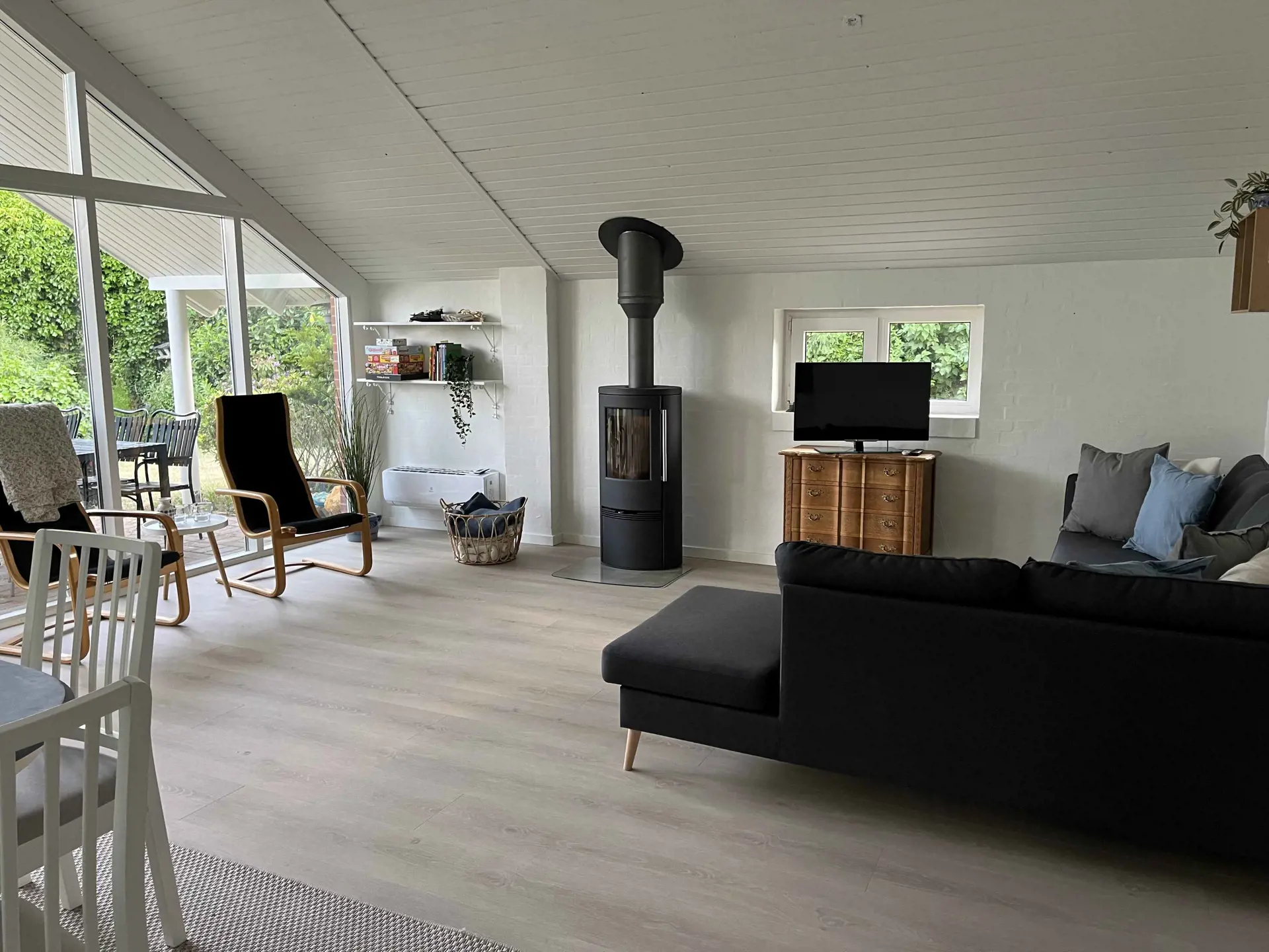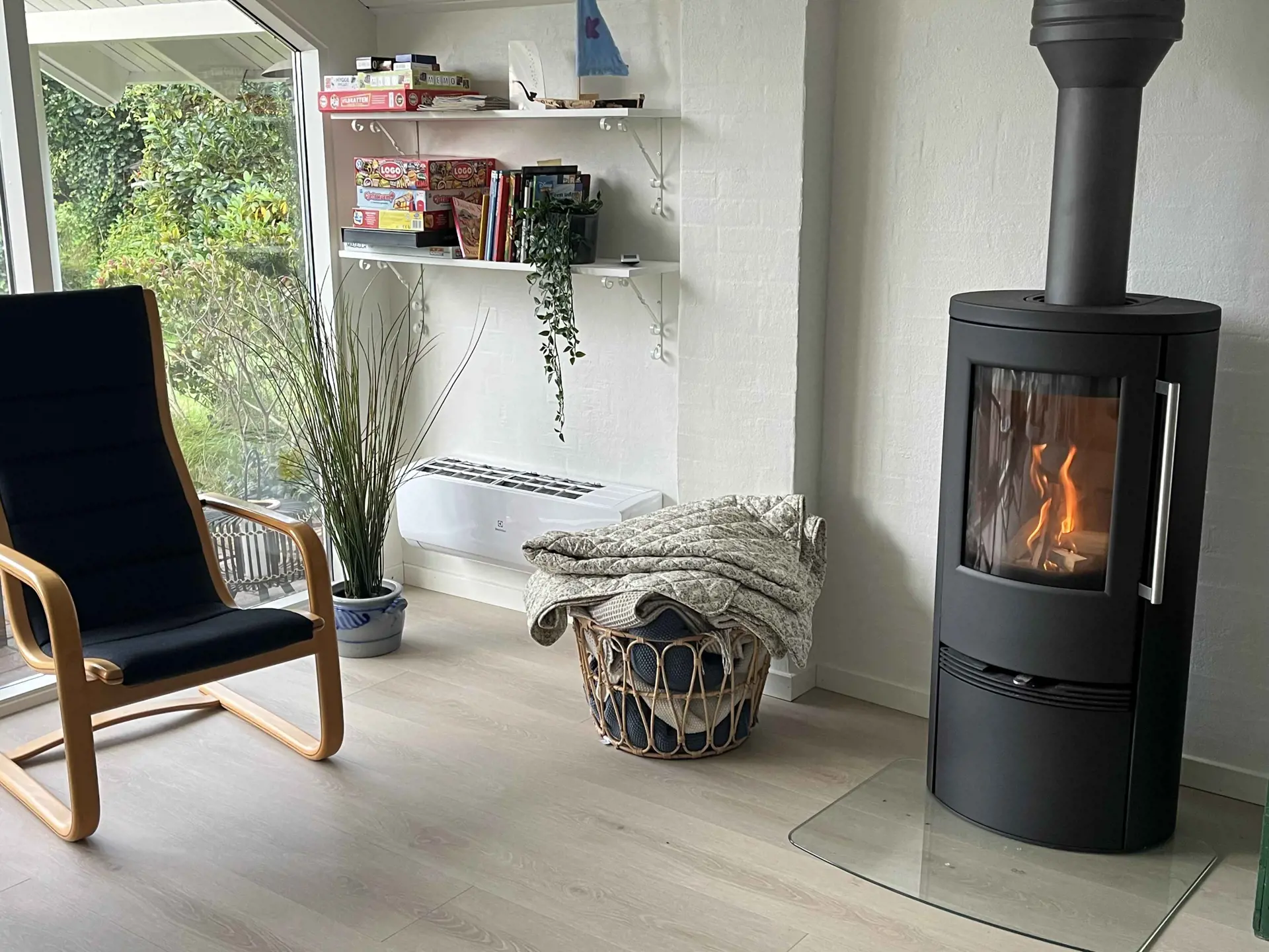 Das Haus verfügt über ein helles, gemütliches Wohnzimmer mit einem neuen Kaminofen, einer Wärmepumpe, einem Essbereich und offenem Zugang zu einer gut ausgestatteten Küche. In der Küche befinden sich unter anderem eine Geschirrspülmaschine und eine Mikrowelle. Außerdem gibt es ein schönes, helles Badezimmer mit Dusche und Fußbodenheizung.