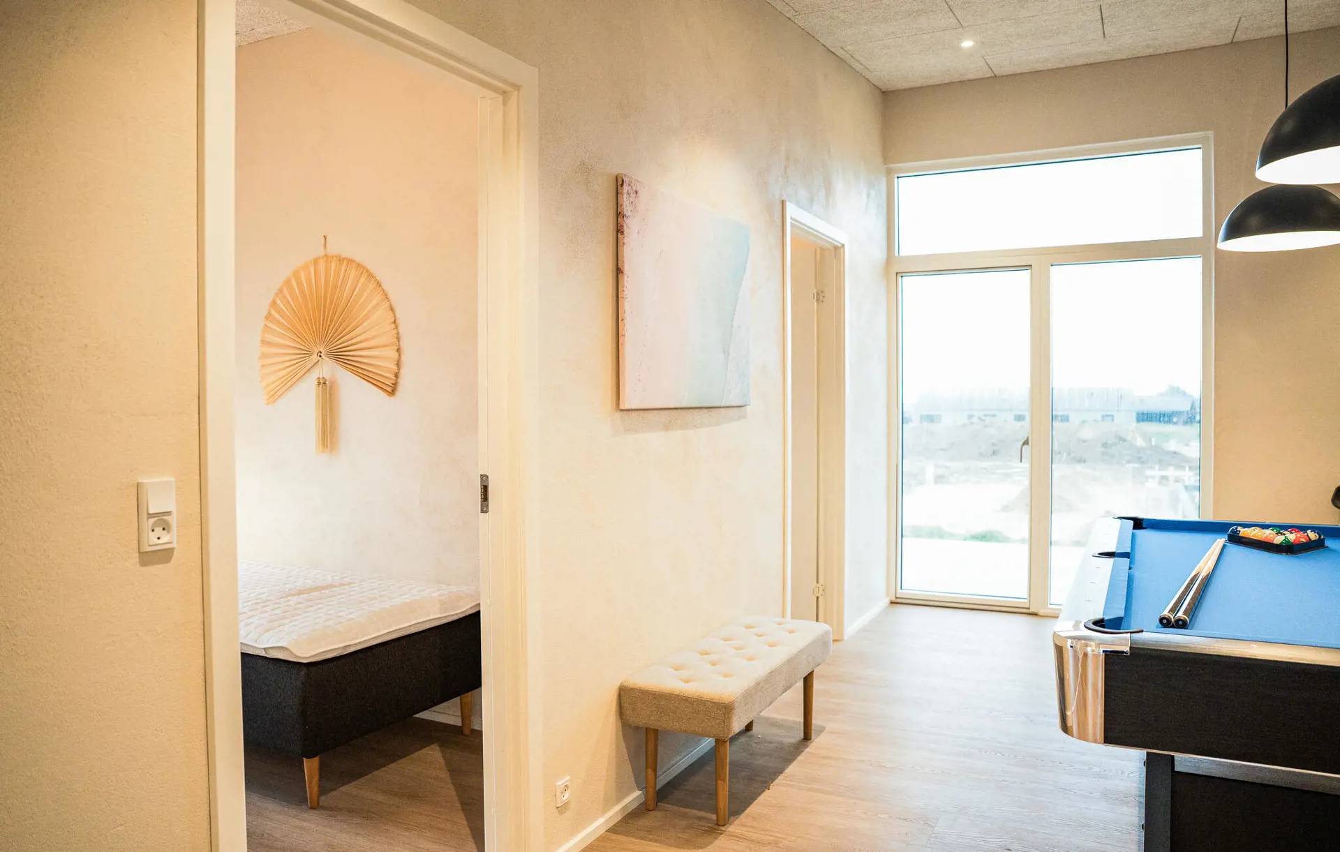 Treten Sie ein und lassen Sie sich von den hell gestalteten Innenräumen empfangen, in denen großzügige Fensterflächen das Tageslicht in alle Räume holen. Nutzen Sie die moderne Küche für gemeinsame Mahlzeiten, während der Esstisch zu langen Abenden einlädt. Machen Sie es sich im Wohnbereich auf dem großen Ecksofa bequem und schalten Sie einen Gang herunter. Fordern Sie sich gegenseitig am Billardtisch oder bei einer Partie Tischtennis heraus und veranstalten Sie kleine Turniere für Groß und Klein.