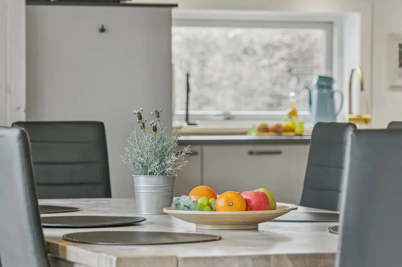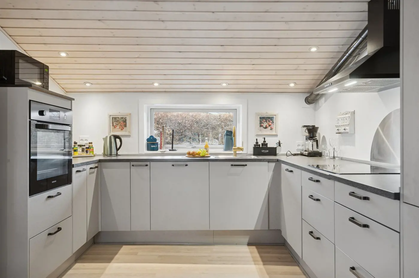 Die Küche ist mit Kühlschrank ausgestattet. Außerdem gibt es 4 Induktions-Kochzonen, Umluftofen sowie Geschirrspüler.