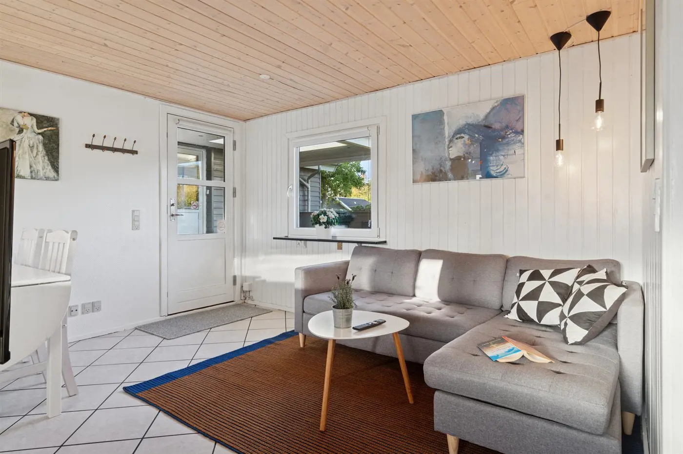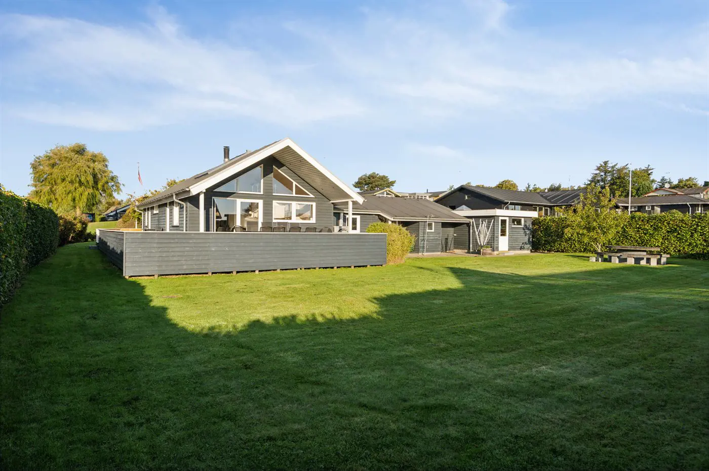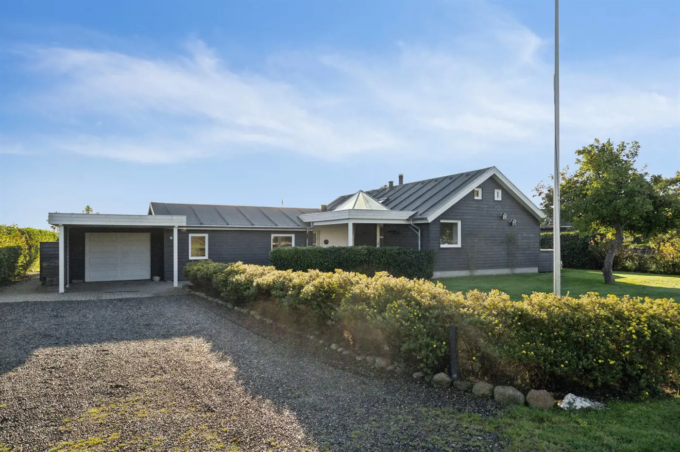 Ein schönes und gepflegtes Ferienhaus im Herzen des Feriengebiets Høll – nur wenige hundert Meter von einem Sandstrand entfernt. Vom Haus aus kann man das Wasser ahnen.