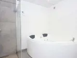 Vom Familienzimmer aus hat man direkten Zugang zum großen Terrassenbereich, der mit mehreren Gartenmöbeln ansprechend ausgestattet ist. Es gibt auch einige Sonnenliegen. Auf der Terrasse haben Sie außerdem Zugang zum großen Whirlpool im Freien, in dem bis zu sieben Personen gleichzeitig in die Sterne blicken können. Im Inneren setzt das Haus seinen Wellnessbereich mit Infrarotsauna und Whirlpool in einem der Badezimmer fort.