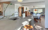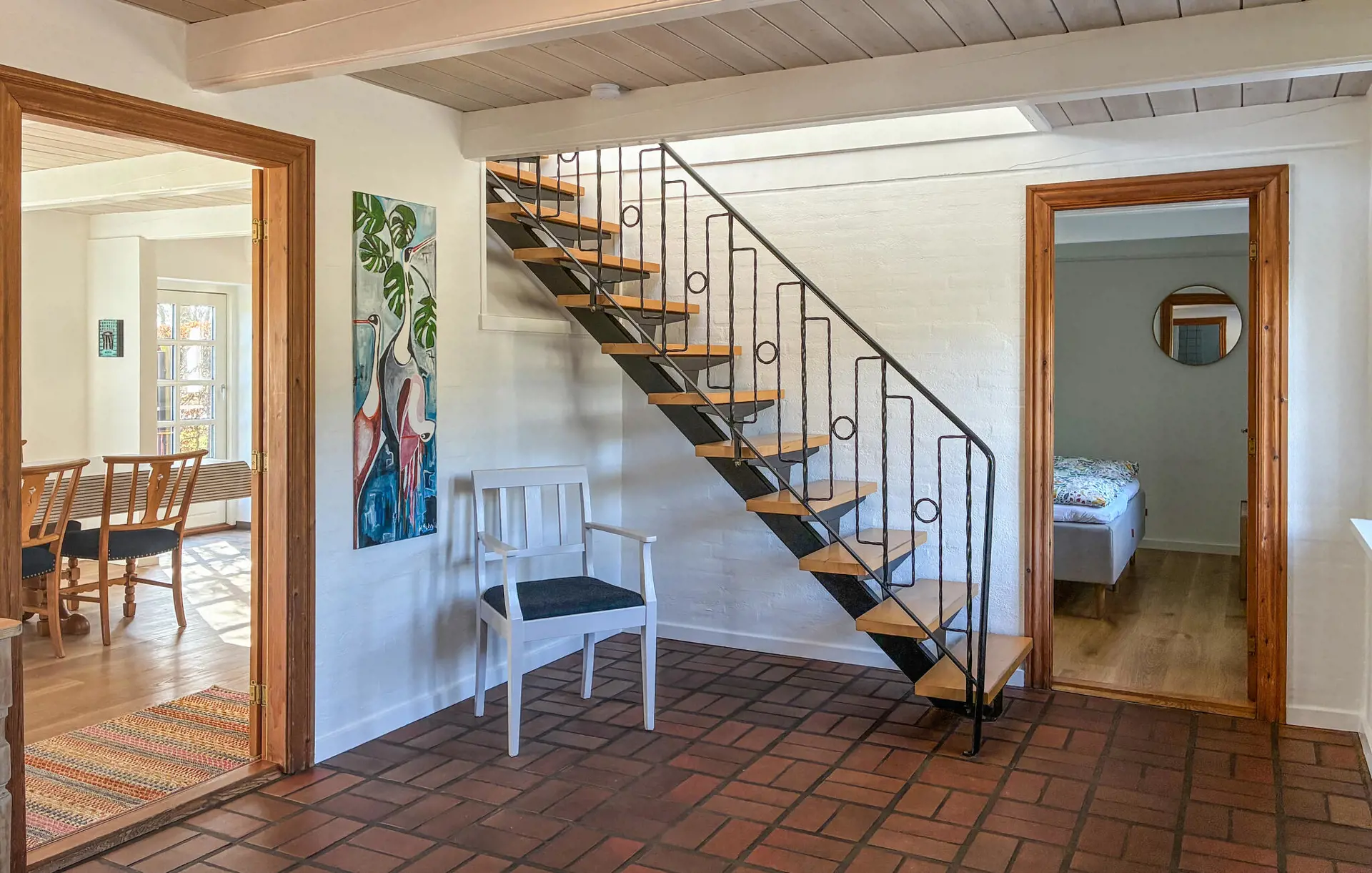 Dieses idyllisch gelegene Haus empfängt Sie mit einem warmen und lichtdurchfluteten Ambiente. Freiliegende Holzbalken, ein Kaminofen und rustikales Mobiliar schaffen eine Atmosphäre, in der Sie schnell abschalten können. Lehnen Sie sich gemütlich mit einer Tasse Kaffee zurück, hören Sie Ihre Lieblingsmusik oder kochen Sie gemeinsam leckere Mahlzeiten in der Küche.