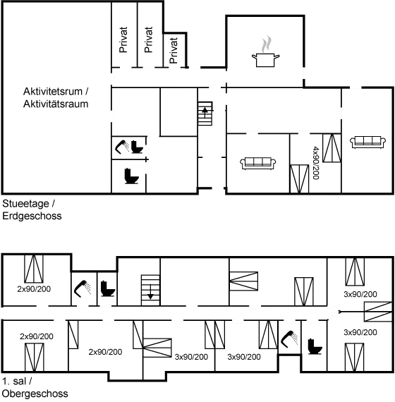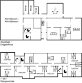 Die Schlafplätze verteilen sich auf 9 Schlafräume. 20 Schlafplätze in Doppelbetten. 6 Schlafplätze in Einzelbetten. Ferner stehen 3 Kinderbetten zur Verfügung.