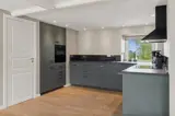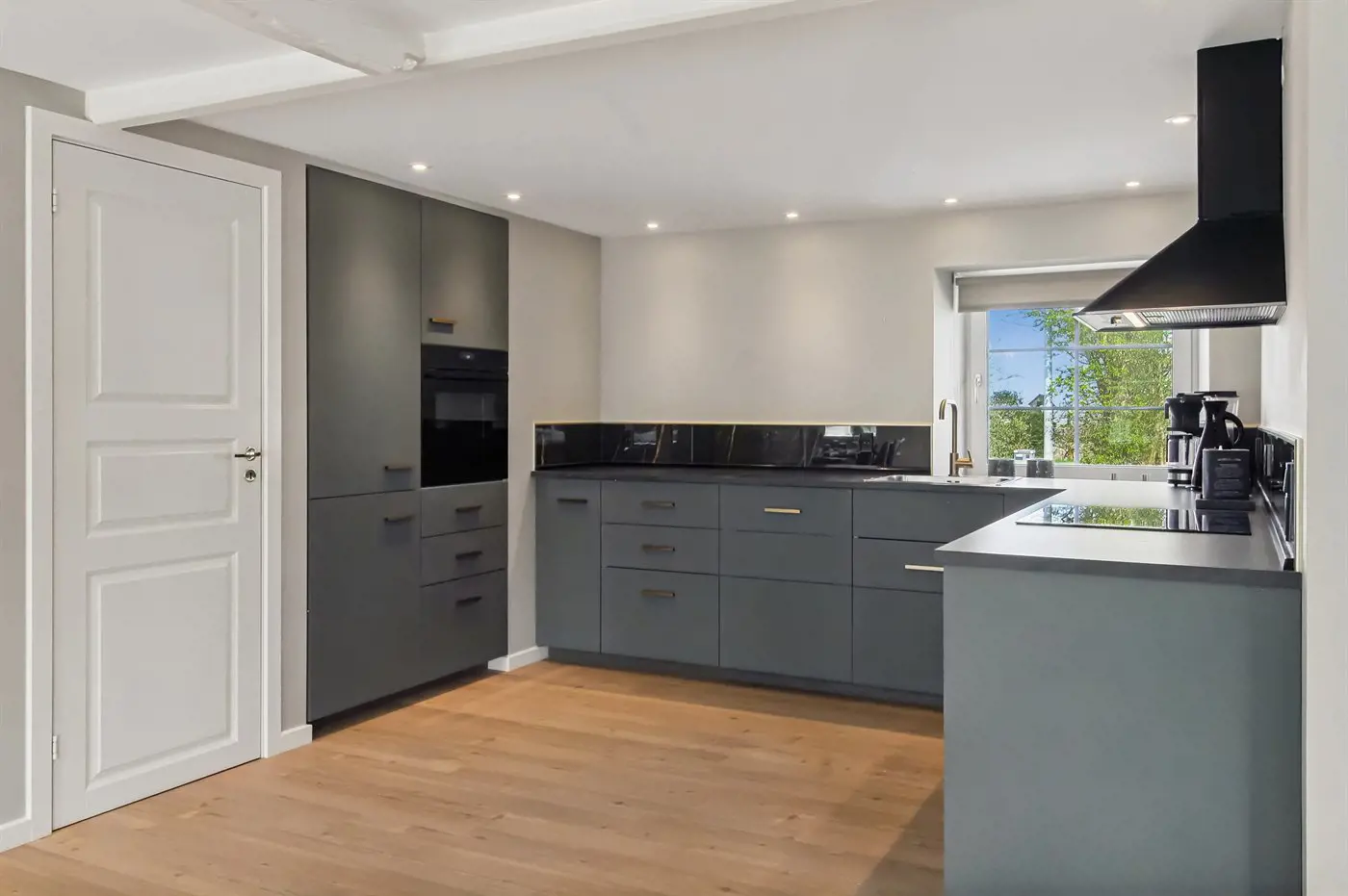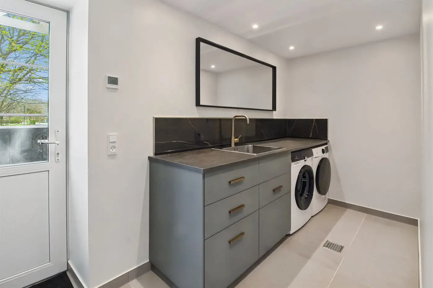 Die Küche ist mit Kühlschrank ausgestattet. Außerdem gibt es 4 Induktions-Kochzonen, Umluftofen, Mikrowelle, Airfryer sowie Geschirrspüler.