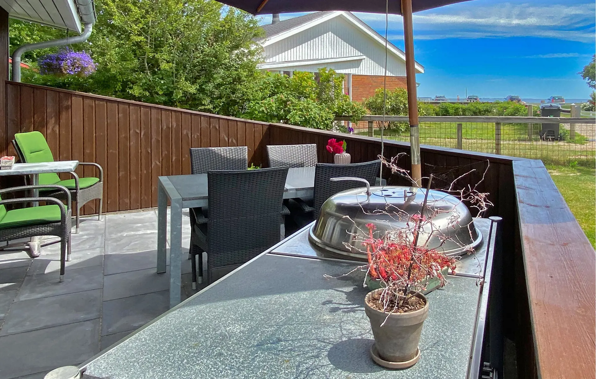 Treten Sie gleich morgens in den schönen Garten und genießen Sie die warmen Sonnenstrahlen. Rund ums Haus finden Sie verschiedene schöne Plätze, um zu frühstücken, sich auszuruhen oder sich in ein gutes Buch zu vertiefen. Entzünden Sie abends den Grill und versammeln Sie Ihre Lieben bei einem leckeren Essen, während die Sonne langsam untergeht.