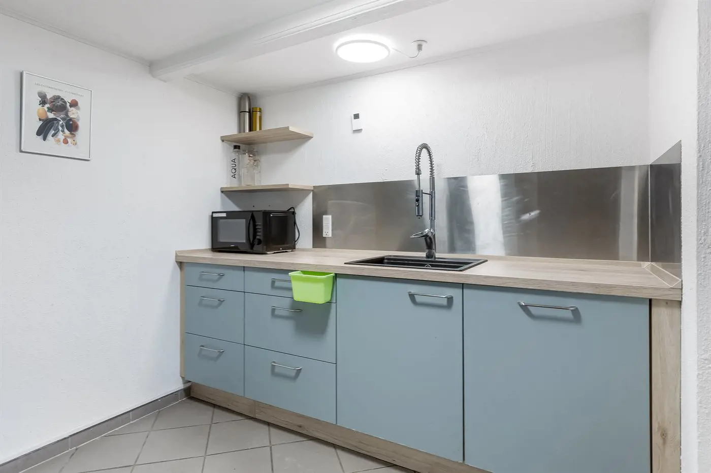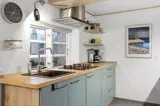 Die Küche ist mit Kühlschrank ausgestattet. Außerdem gibt es ein Gaskochfeld mit 4 Brenner, Umluftofen, Mikrowelle sowie Geschirrspüler. Fußbodenheizung in der Küche.