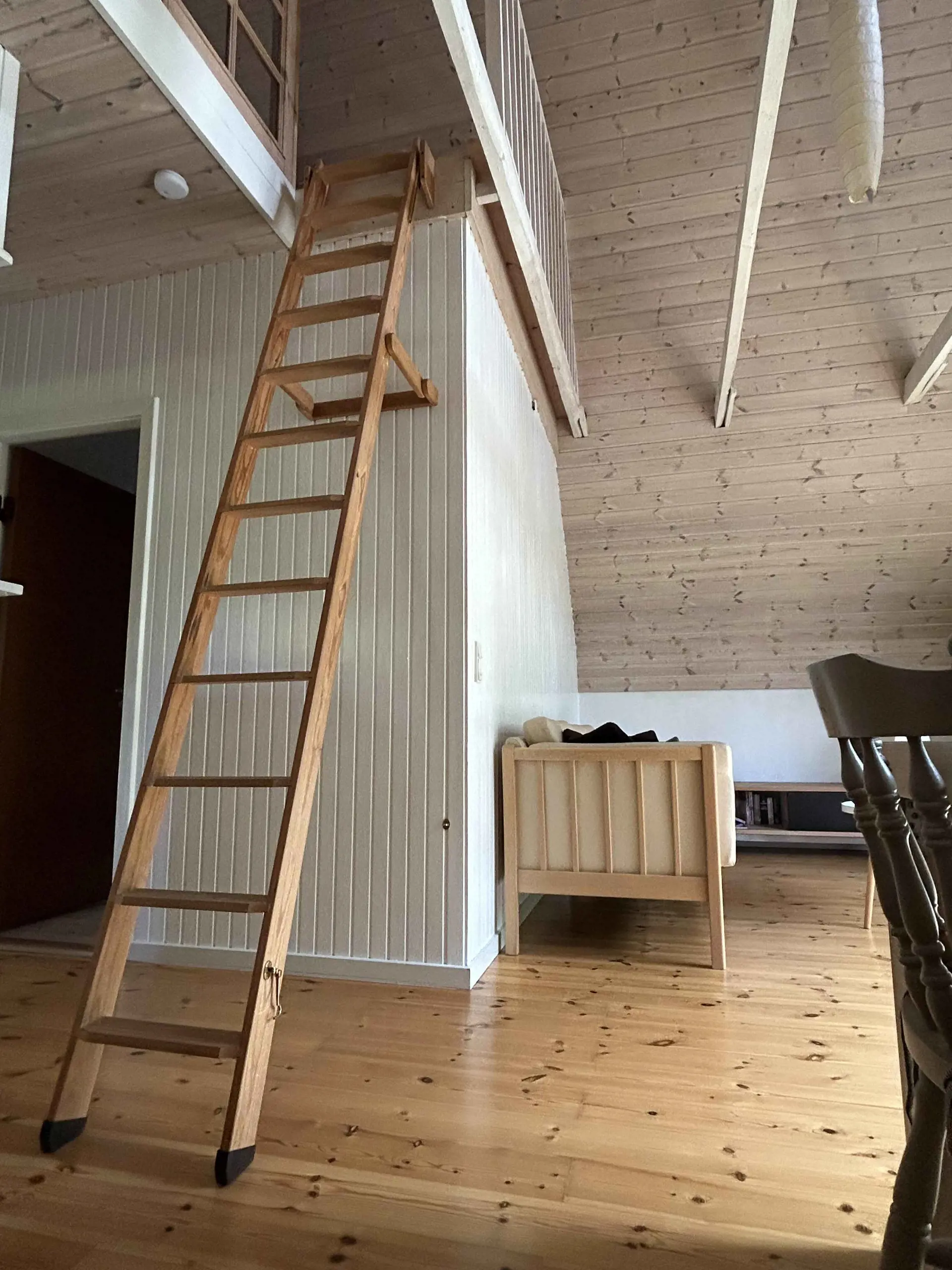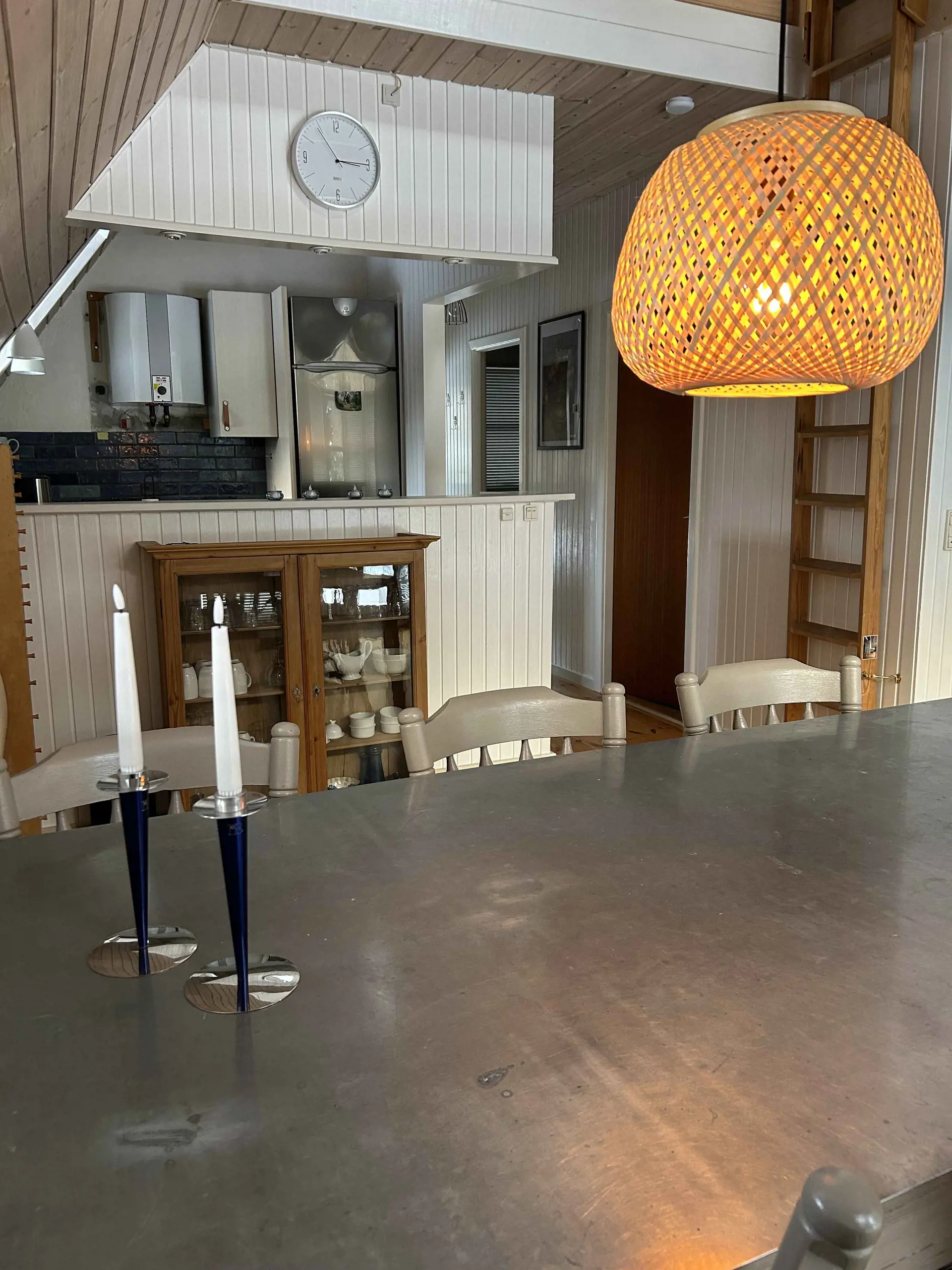 Das Haus bietet ein großes, helles Wohnzimmer mit breiter Fensterfront und zwei Flügeltüren zum grünen Garten. Genießen Sie das Knistern des Kaminofens vom Sofa aus. Am rustikalen Esstisch findet die ganze Familie Platz. Die offene Decke bis in den Giebel sorgt für ein großzügiges Raumgefühl. Die kleine Landküche ist mit allem Nötigen sowie einer Heißluftfritteuse ausgestattet.