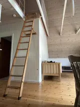 Es gibt ein Schlafzimmer mit Doppelbett, ein kleineres Zimmer mit Einzelbett und zwei Betten auf der offenen Galerie, die mit einer festen Leiter erreichbar ist.