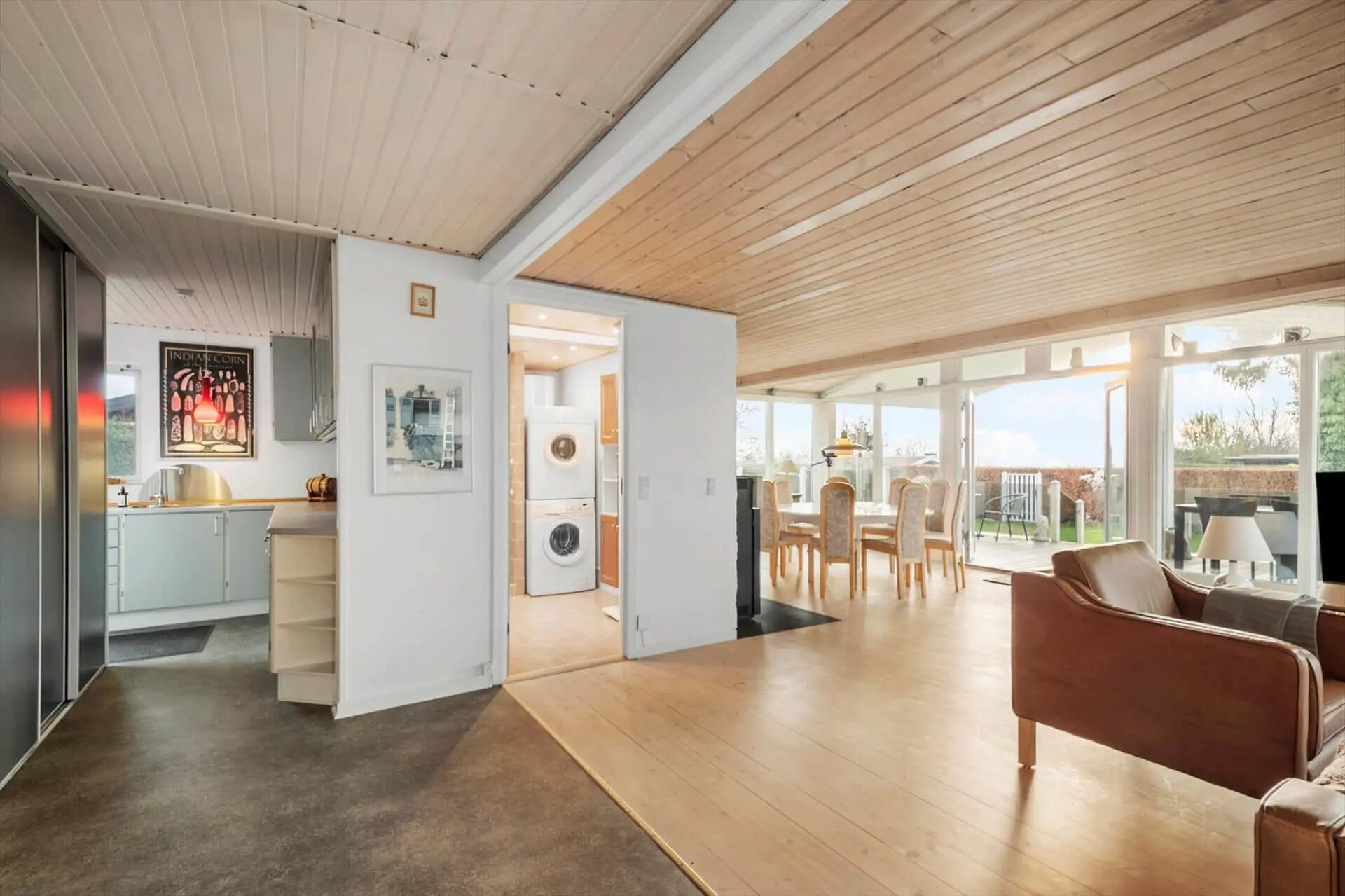 Die gut ausgestattete Küche mit Essbereich lädt zum gemeinsamen Essen ein. Von der Küche führen ein paar Stufen hinunter in ein geräumiges Wohnzimmer mit Fußbodenheizung, einer gemütlichen Sofaecke, einem Fernseher mit Streaming-Diensten und einem einladenden Essbereich. Hier findet jeder seinen Platz und kann die gemeinsame Zeit genießen. An kalten Tagen sorgt der Kaminofen für wohlige Wärme, und Sie können es sich drinnen mit einem Brettspiel und selbstgebackenen Brötchen gemütlich machen, während der Pelletofen knistert. Vom Wohnzimmer aus gelangen Sie auf die große, teilweise überdachte Terrasse. Das Haus verfügt über zwei Schlafzimmer, ein Badezimmer mit WC, Waschbecken und Dusche sowie eine Waschmaschine und einen Trockner. In diesem Haus haben Sie die Möglichkeit, sich zurückzuziehen, ein Nickerchen zu machen oder ein Buch zu lesen.