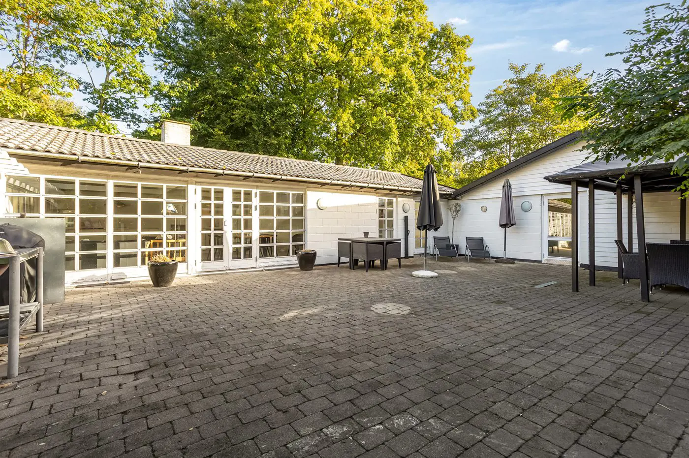 Das Haus hat eine Wohnfläche von 124 m² sowie ein dazugehöriges Gästehaus und einen Aktivitätsraum. Das Sommerhaus ist mit einer schönen Küche in offener Verbindung mit dem Essbereich und dem Wohnzimmer eingerichtet. Von hier hast du direkten Zugang zum Innenhof und zur Sonnenterrasse. Außerdem gibt es einen Eingangsbereich, ein Badezimmer und zwei Schlafzimmer – beide mit Doppelbetten.