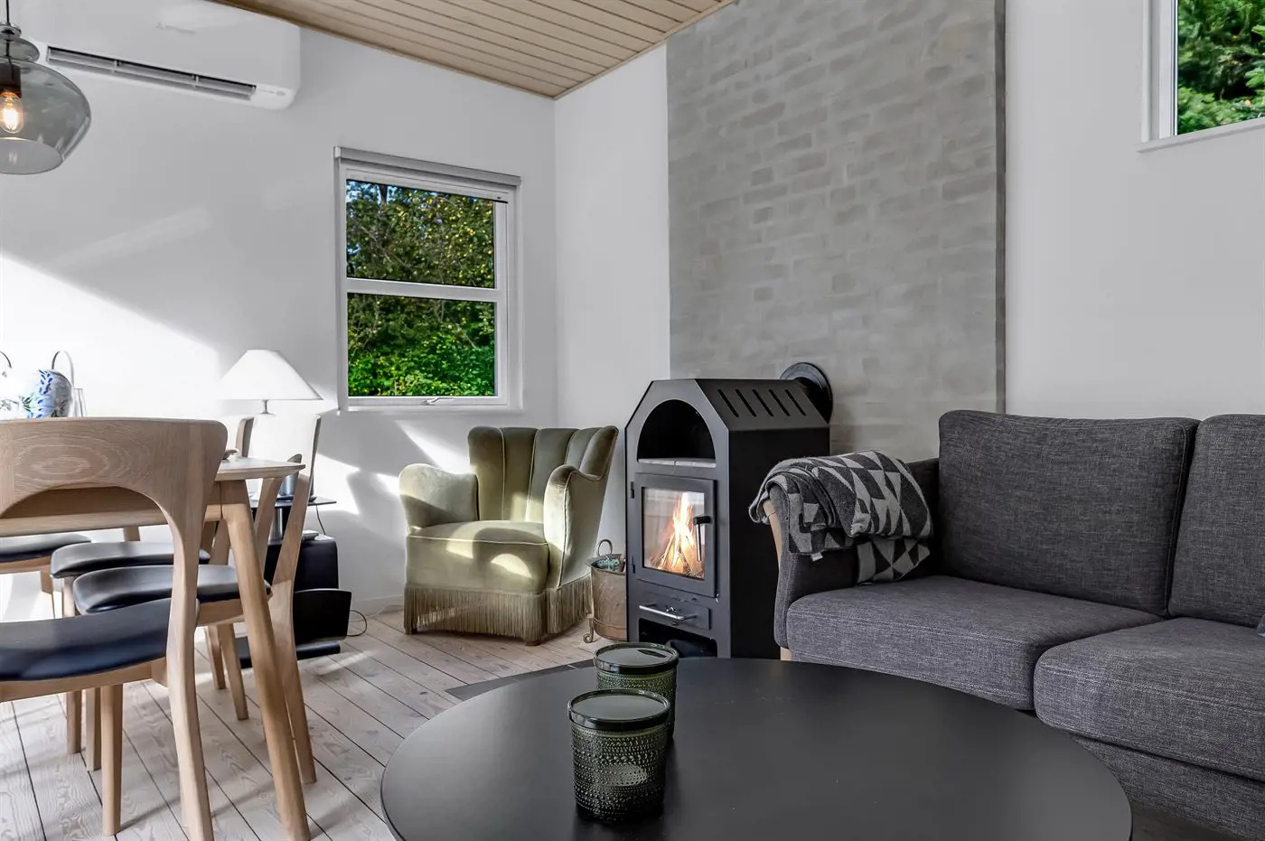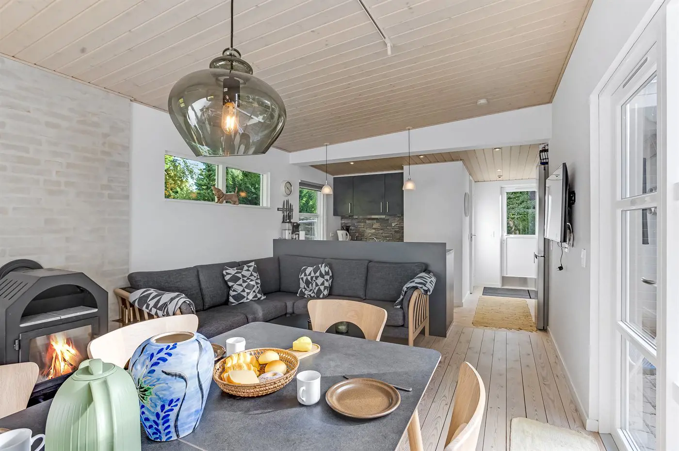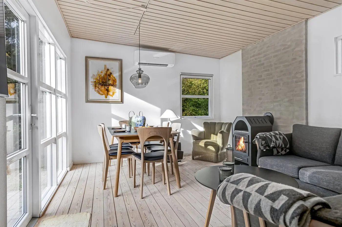 Dieses gemütliche Ferienhaus, das 2022 komplett renoviert wurde, liegt in Strøby. Helles Wohn-Esszimmer mit schöner Holzofen, der sich an kalten Tagen ideal anheizen lässt.