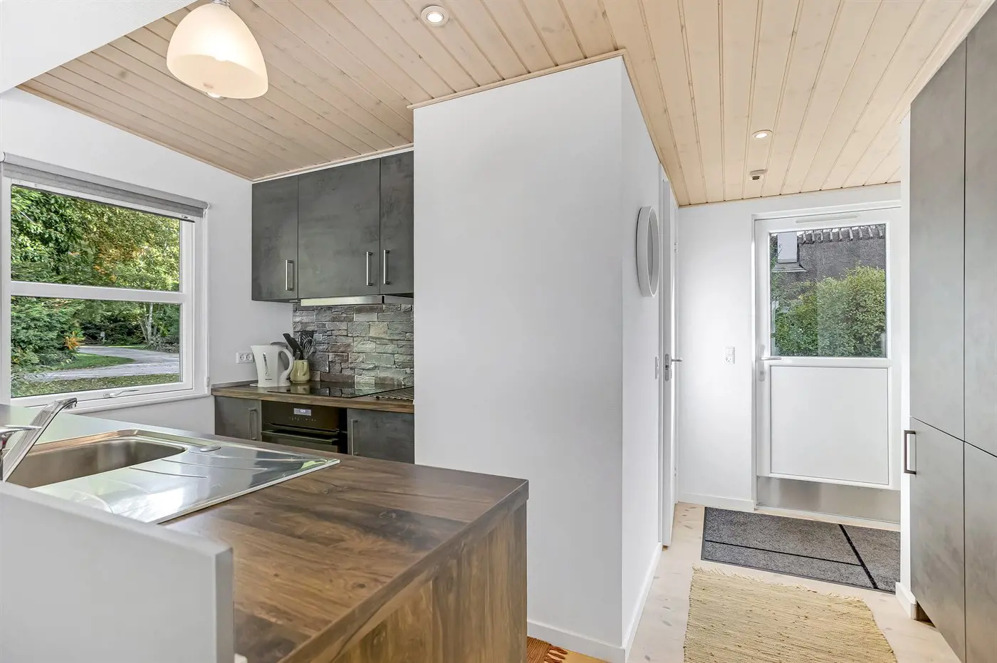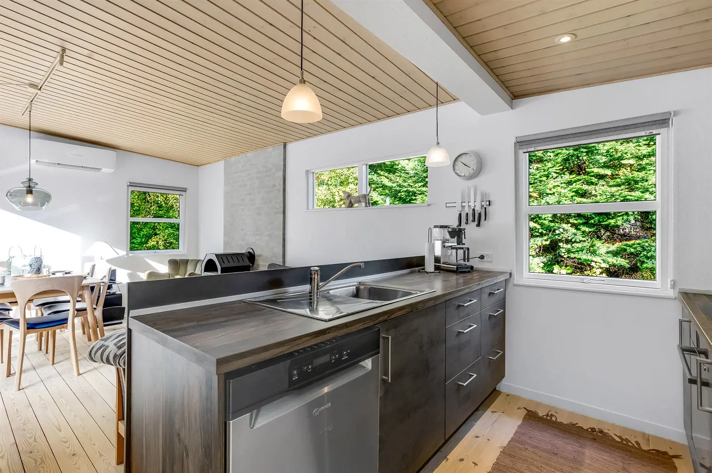 Die Küche ist mit Kühlschrank ausgestattet. Außerdem gibt es 4 Induktions-Kochzonen, Umluftofen sowie Geschirrspüler.