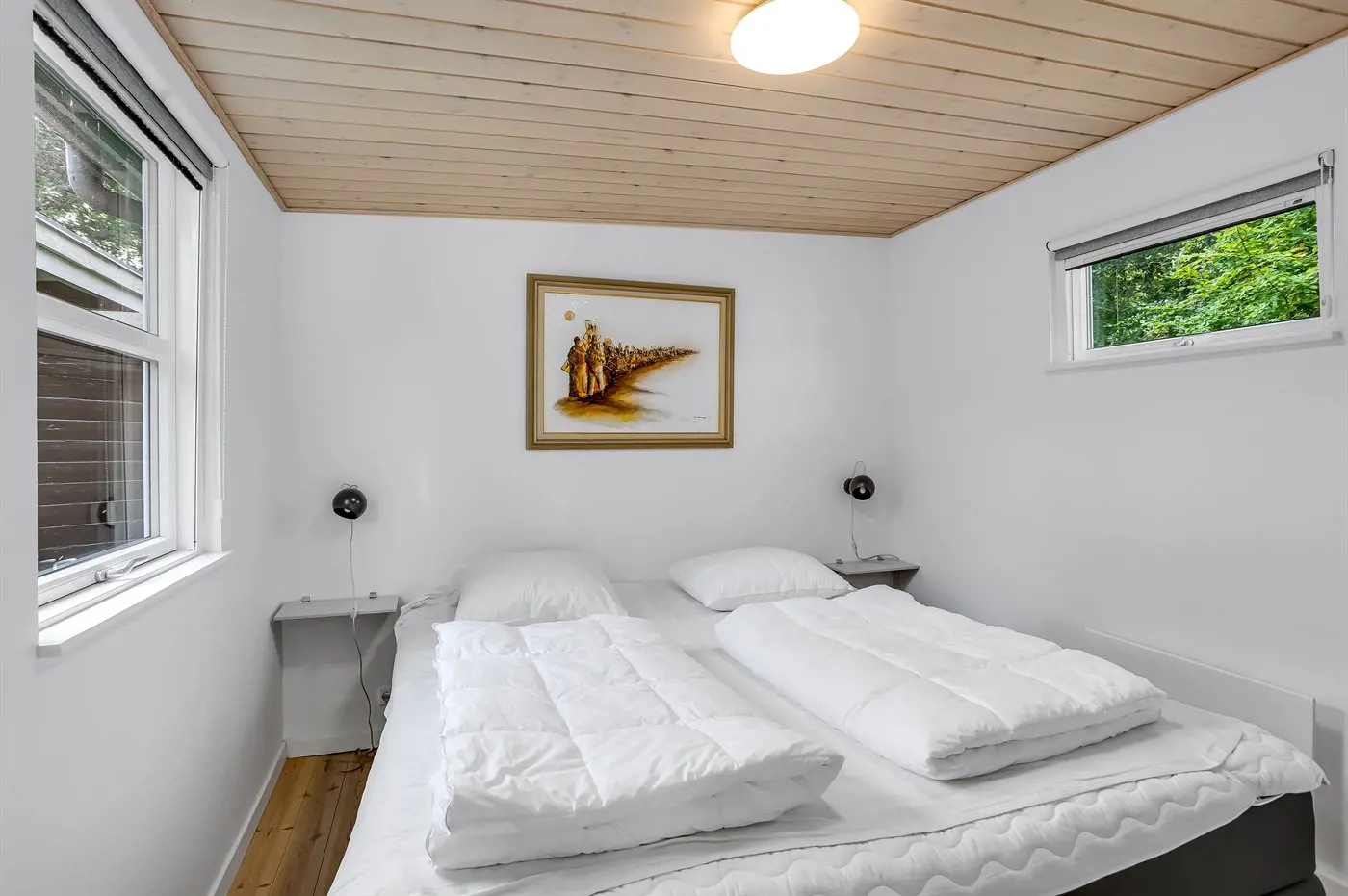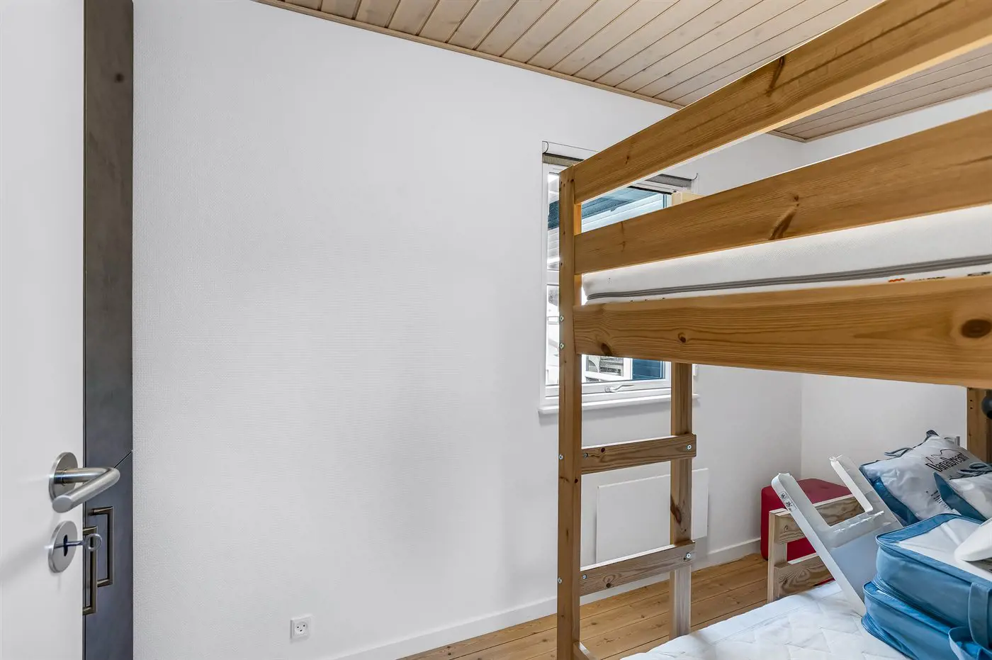 Die Schlafplätze verteilen sich auf 2 Schlafräume. 2 Schlafplätze in einem Doppelbett. 2 Schlafplätze in einem Etagenbett.