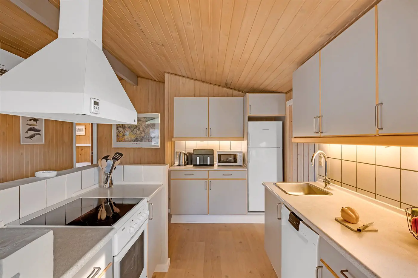 Die Küche ist mit Kühlschrank ausgestattet. Außerdem gibt es 4 Keramik-Kochfelder, Umluftofen, Mikrowelle, Airfryer sowie Geschirrspüler.