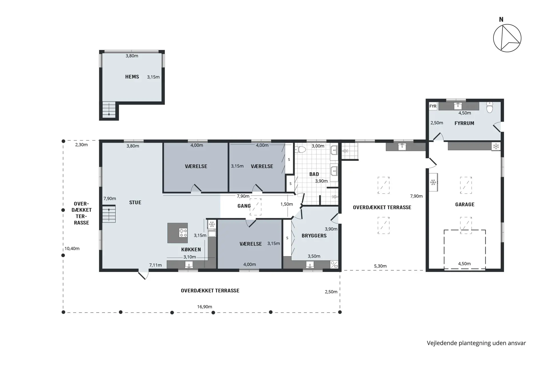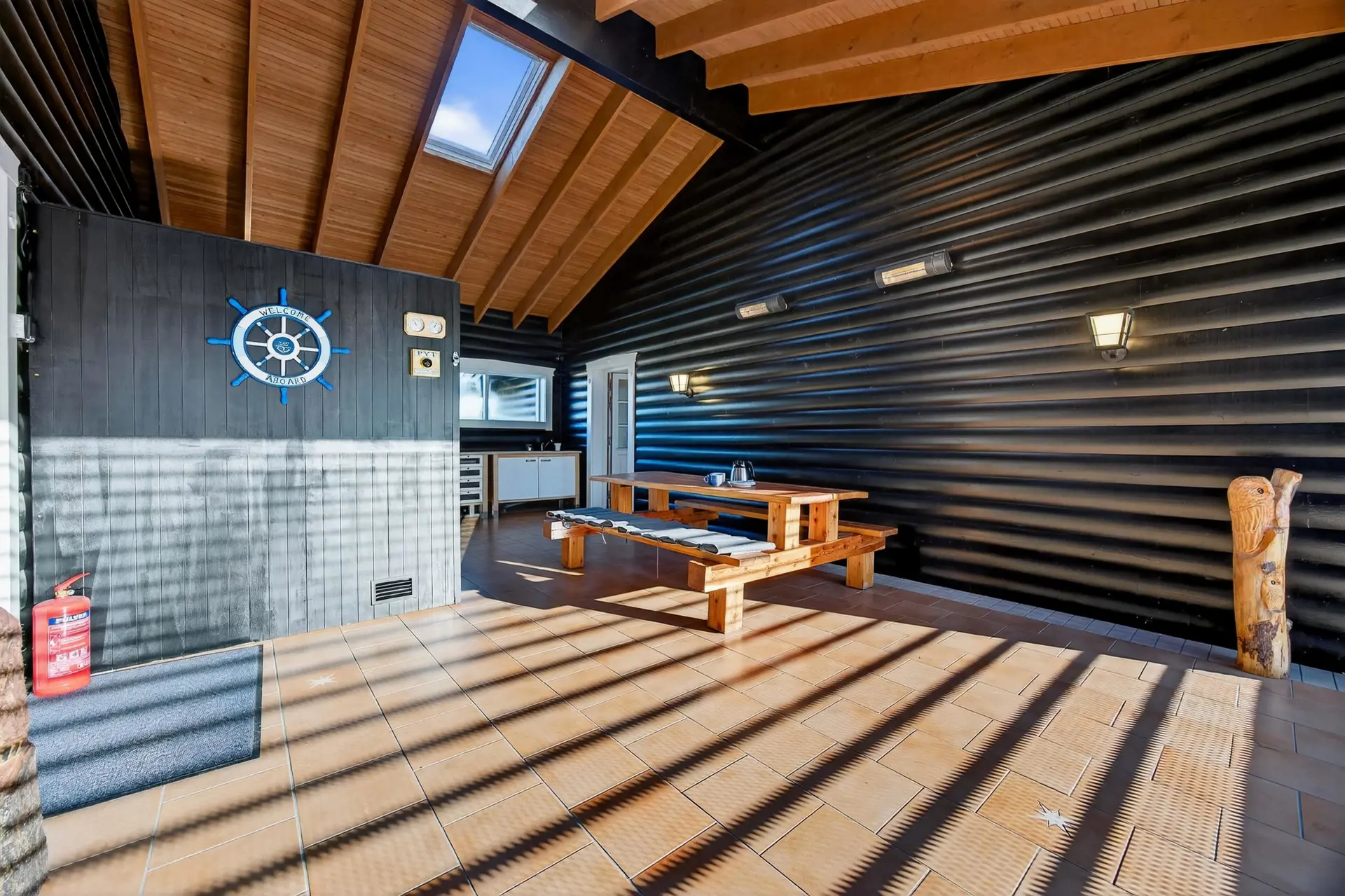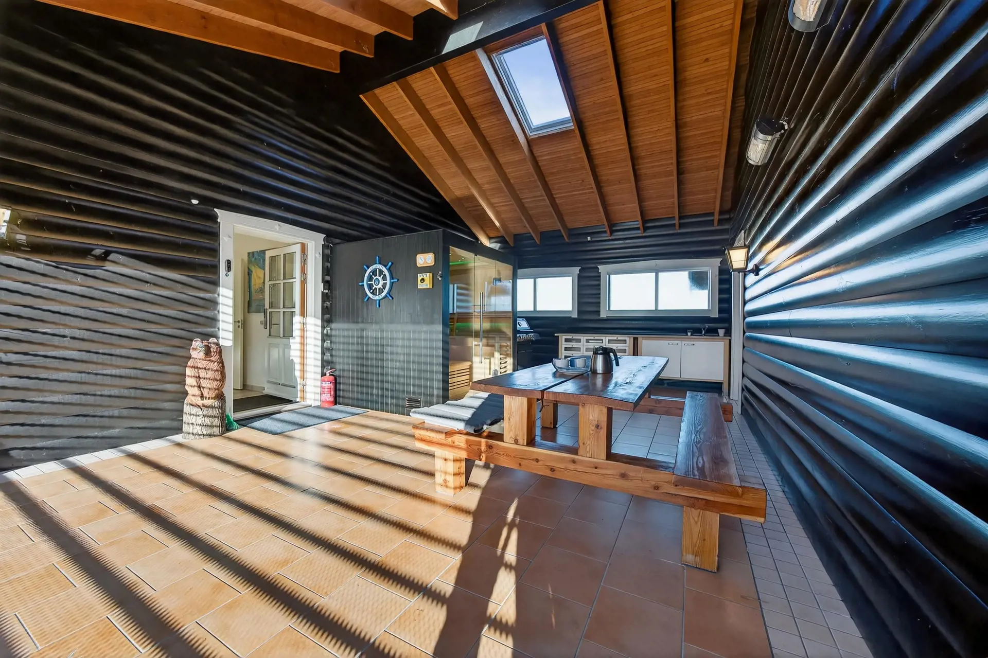 Das Ferienhaus verfügt zudem über drei geräumige Schlafzimmer, die alle mit großzügigem Stauraum ausgestattet sind. Die große Garage bietet ein zusätzliches Badezimmer mit Toilette und Waschbecken und ist über eine großzügige, überdachte Terrasse vom Haupthaus getrennt.
