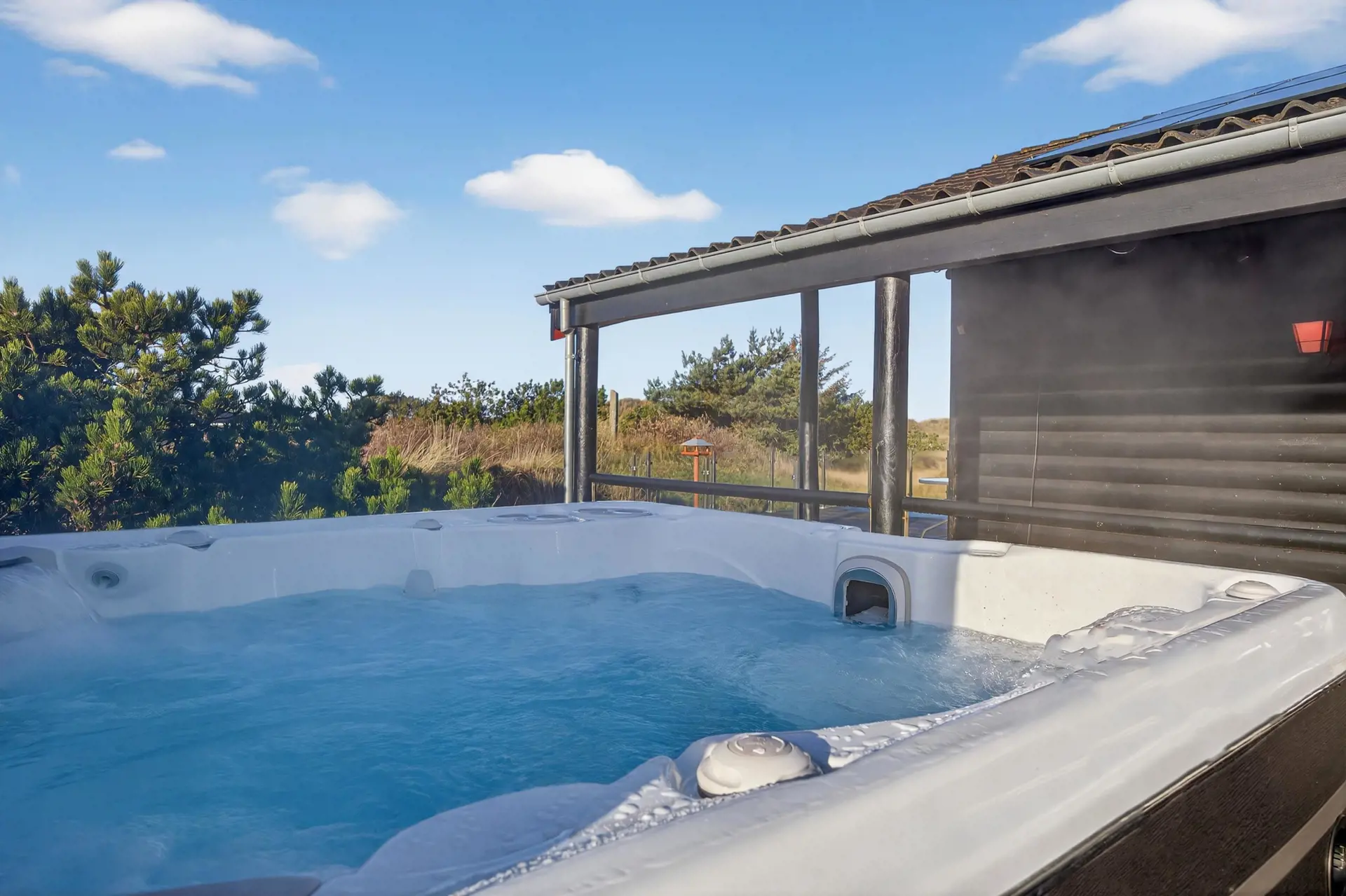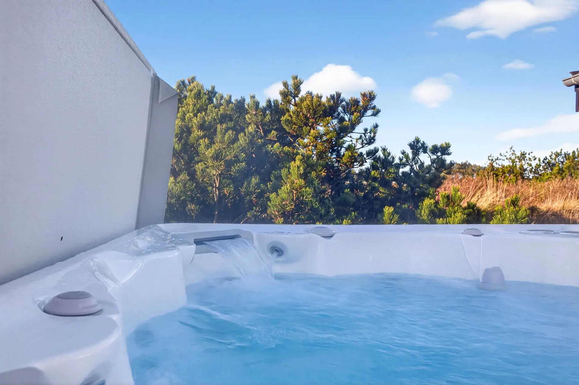 Auf der neugebauten Terrasse befindet sich ein luxuriöser Outdoor-Whirlpool, in dem Sie sich im warmen Wasser zurücklehnen, den Sternenhimmel genießen und dem Meeresrauschen im Hintergrund lauschen können.