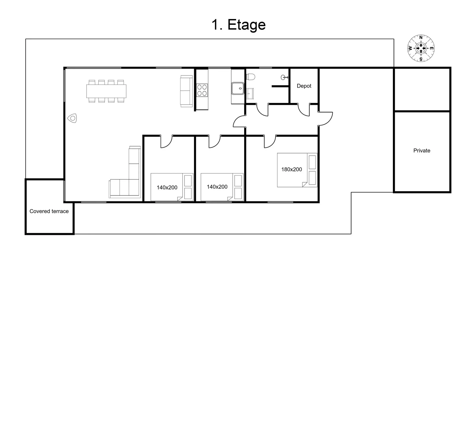 Das Ferienhaus ist von einer großen Terrasse umgeben, die es Ihnen ermöglicht, die Sonne den ganzen Tag über zu genießen. Finden Sie einen geschützten Platz, entspannen Sie sich auf der überdachten Terrasse, oder nehmen Sie den idyllischen Pfad, den "Dschungelpfad", direkt hinunter zum Strand. Das abgeschiedene Naturgrundstück lädt zu Ruhe und Naturerlebnissen in friedlicher Umgebung ein. Von hier aus können Sie den Blick über die grüne Landschaft schweifen lassen und das Meer erblicken.