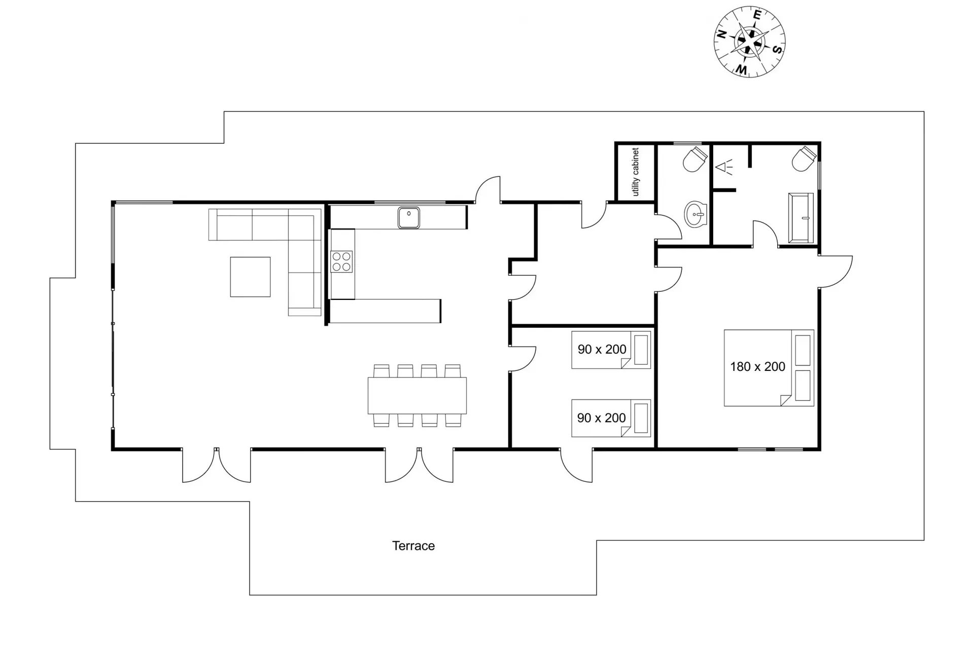 Das Haus bietet Platz für 6 Übernachtungsgäste. Die beiden geräumigen und hellen Schlafzimmer haben jeweils direkten Zugang zum Garten. Zusätzlich gibt es zwei weitere Schlafmöglichkeiten auf dem komfortablen Schlafsofa im Wohnzimmer. Die Badezimmerausstattung umfasst ein großes Bad sowie ein zusätzliches WC, was das Haus ideal für Familien und kleine Gruppen macht.