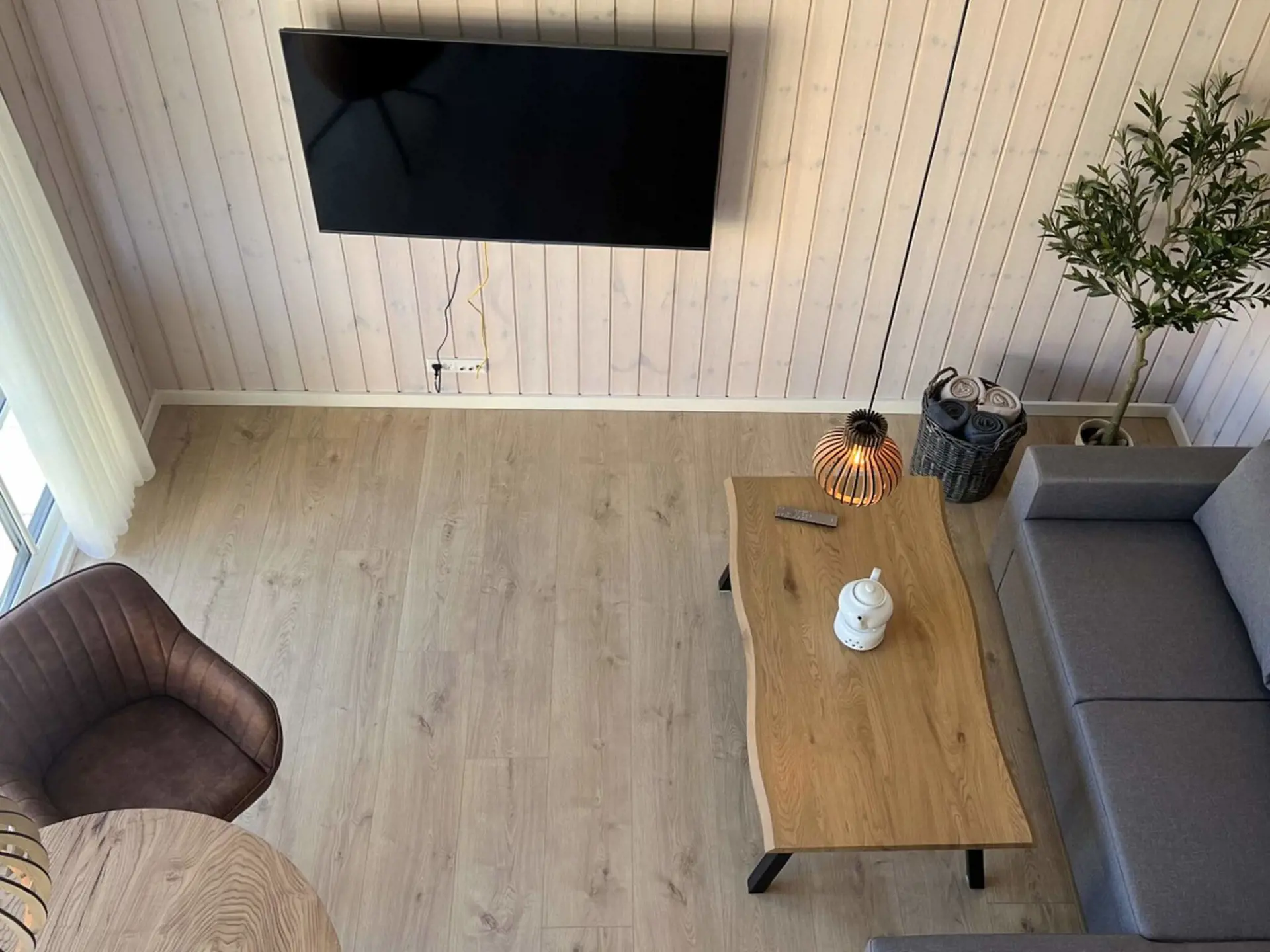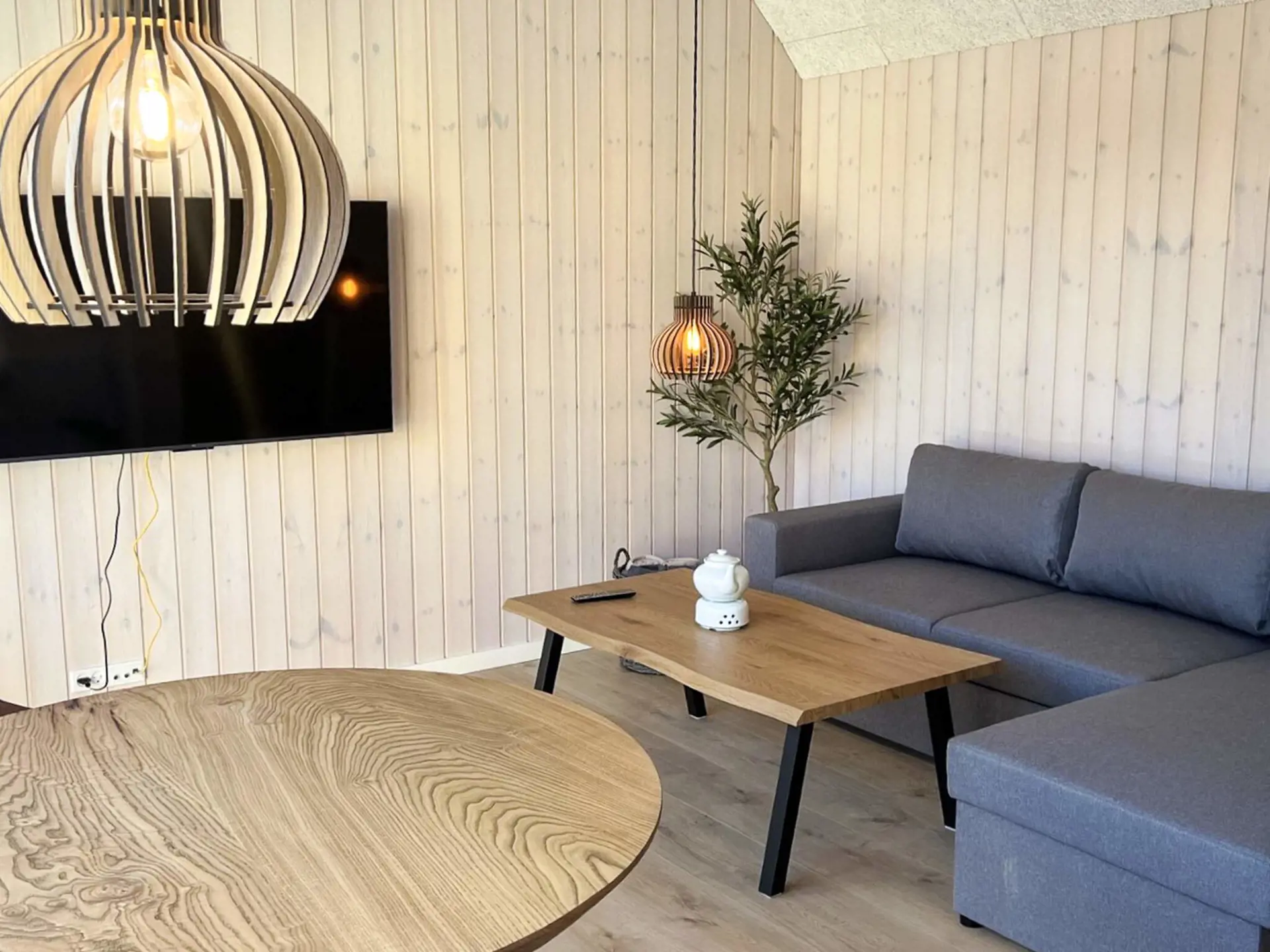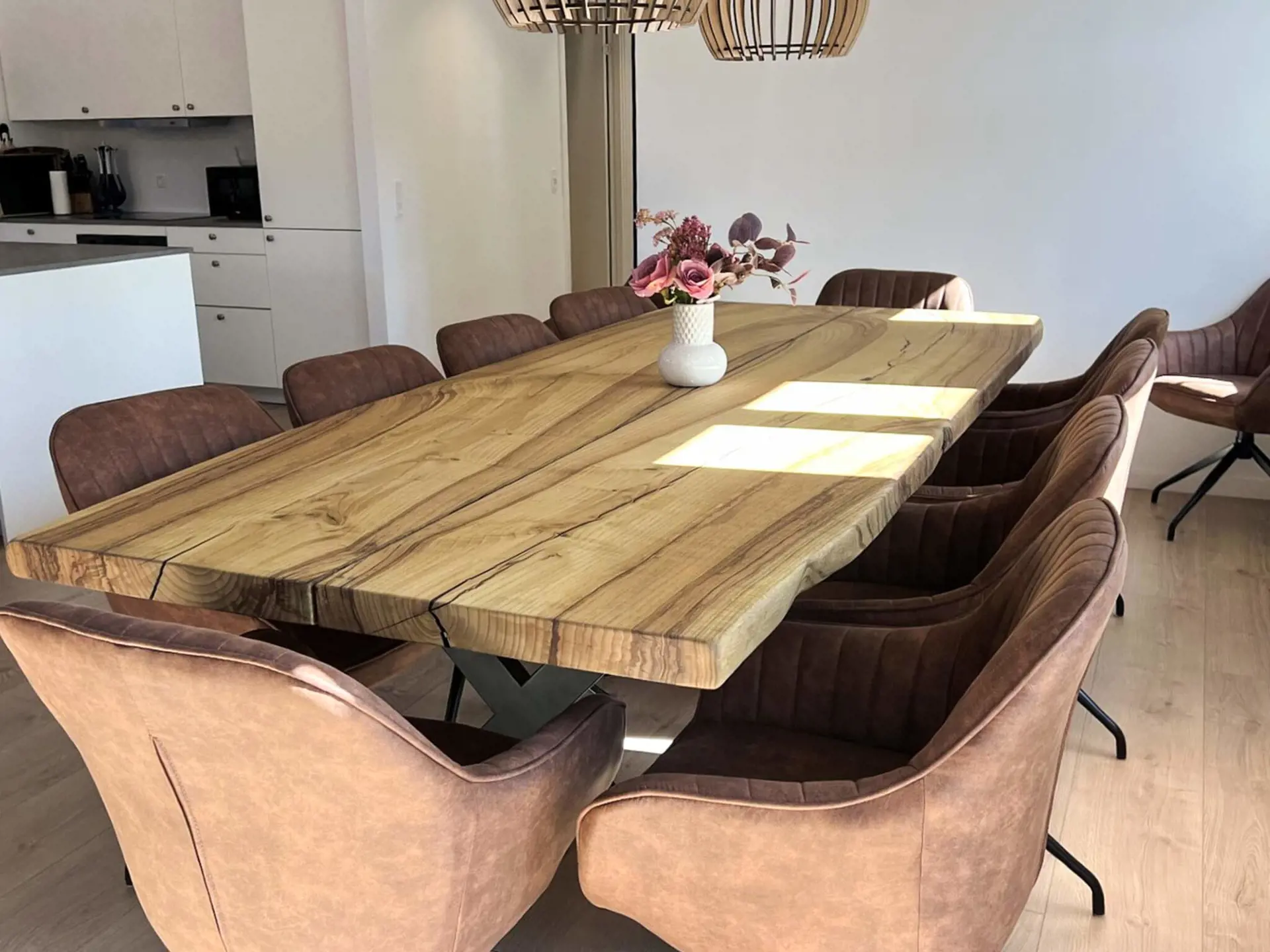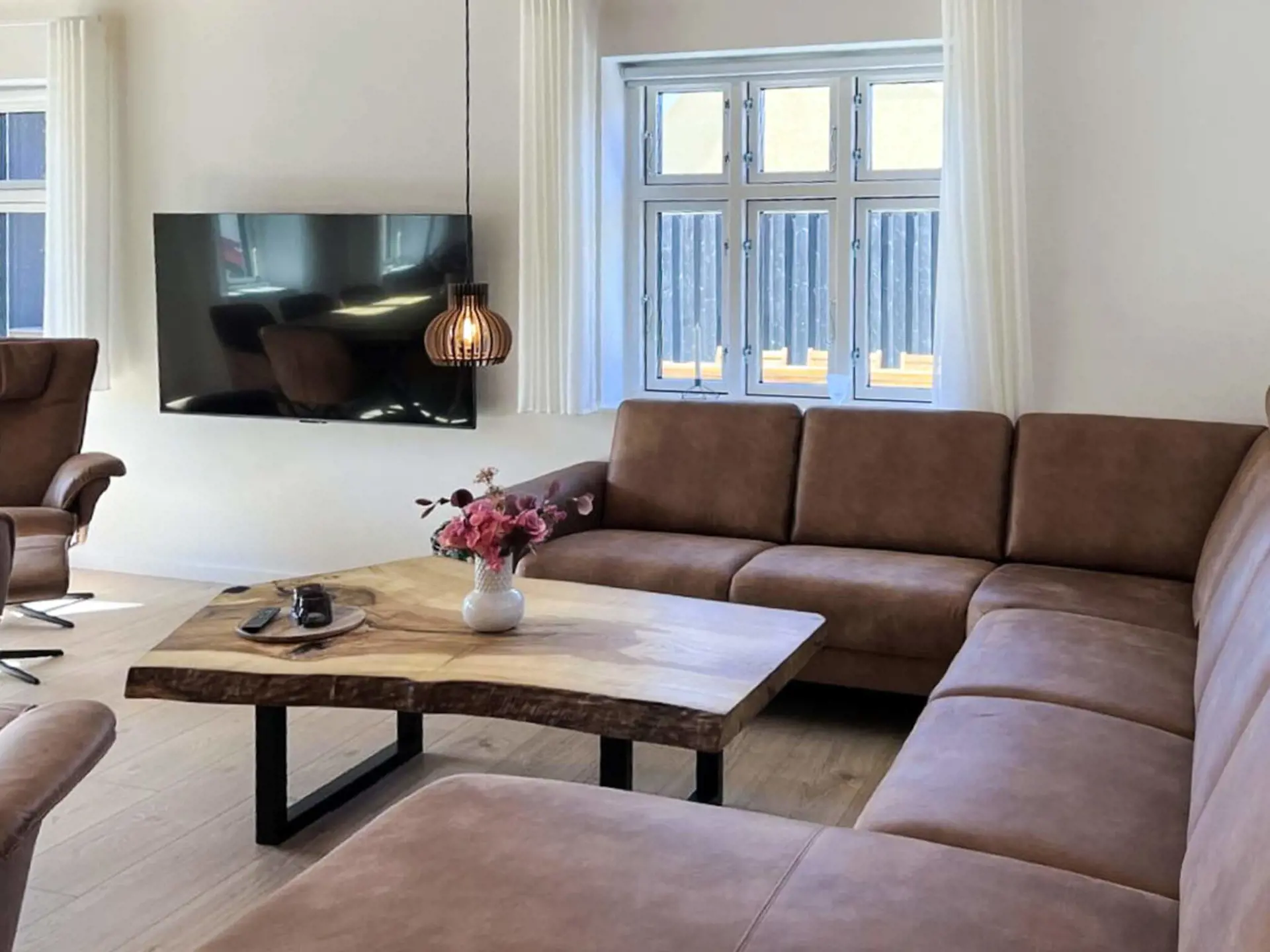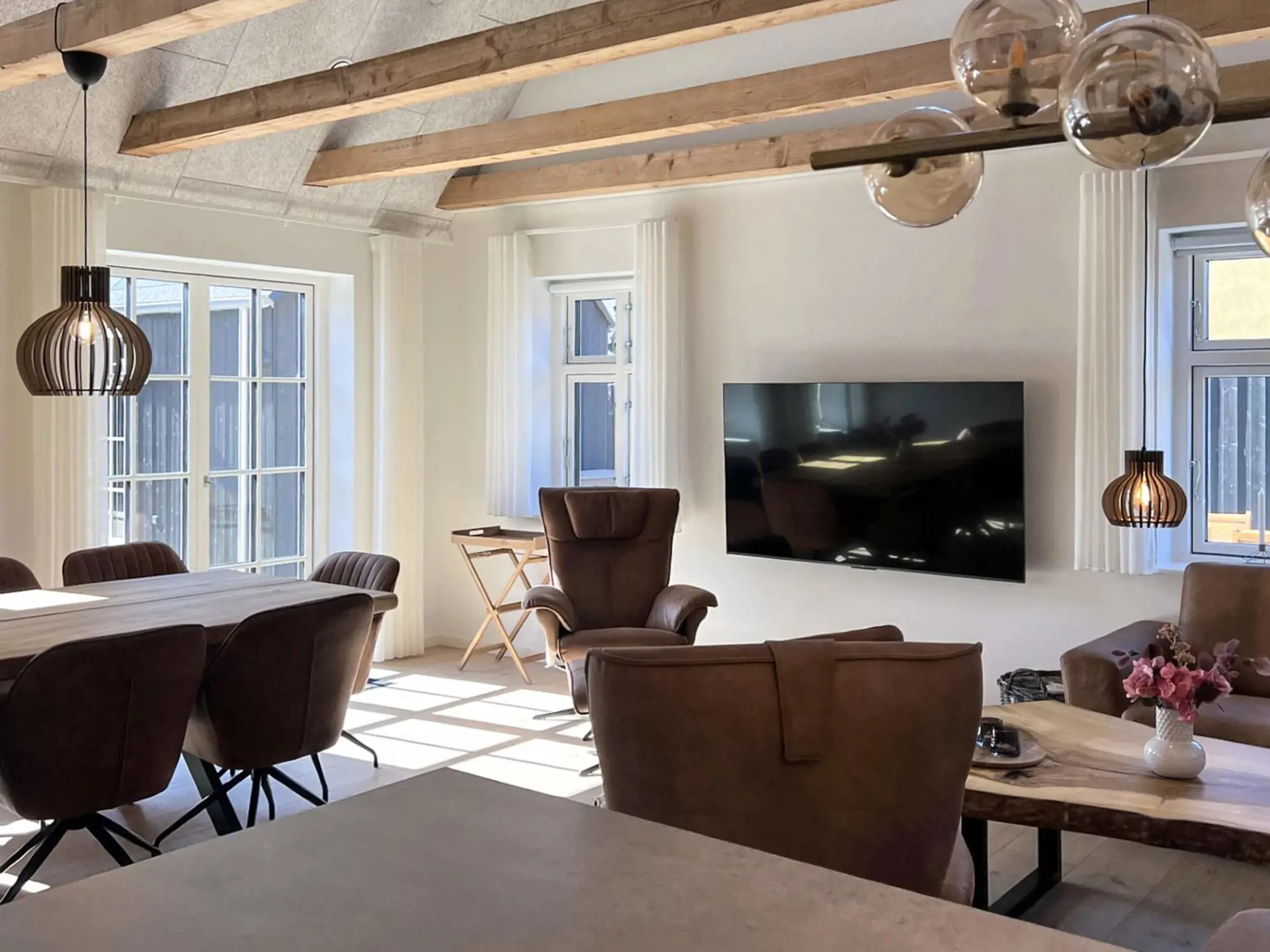 Von dort gelangt man in den großen Wohn-/Küchenbereich, wo in einer brandneuen, bestens ausgestatteten Küche die Mahlzeiten des Hauses zubereitet werden. Das Wohnzimmer ist sehr geräumig und bietet mit seinem maßgefertigten 125 x 273 x 6 cm großen Holztisch für 12 Personen ausreichend Platz für 12–13 Gäste. Eine große Sitzgruppe lädt zum Entspannen ein und ein 65-Zoll-Fernseher mit App-Steuerung lässt sich in alle Richtungen drehen. Überall hängen wunderschöne, handgefertigte dänische Kuppellampen.