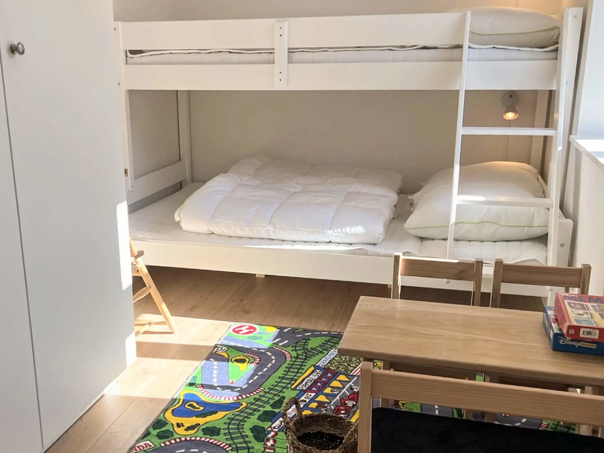 Im Erdgeschoss des Hauptgebäudes befinden sich der Eingang und Zugang zu den weiteren Räumen. Hier fällt sofort der Blick auf ein besonders gemütliches Kinderzimmer, in dem auch an die kleinen Urlauber gedacht wurde. Es verfügt über ein 2 Meter langes Etagenbett für drei Kinder, eine handgefertigte Tisch- und Bankgruppe sowie Spiele.