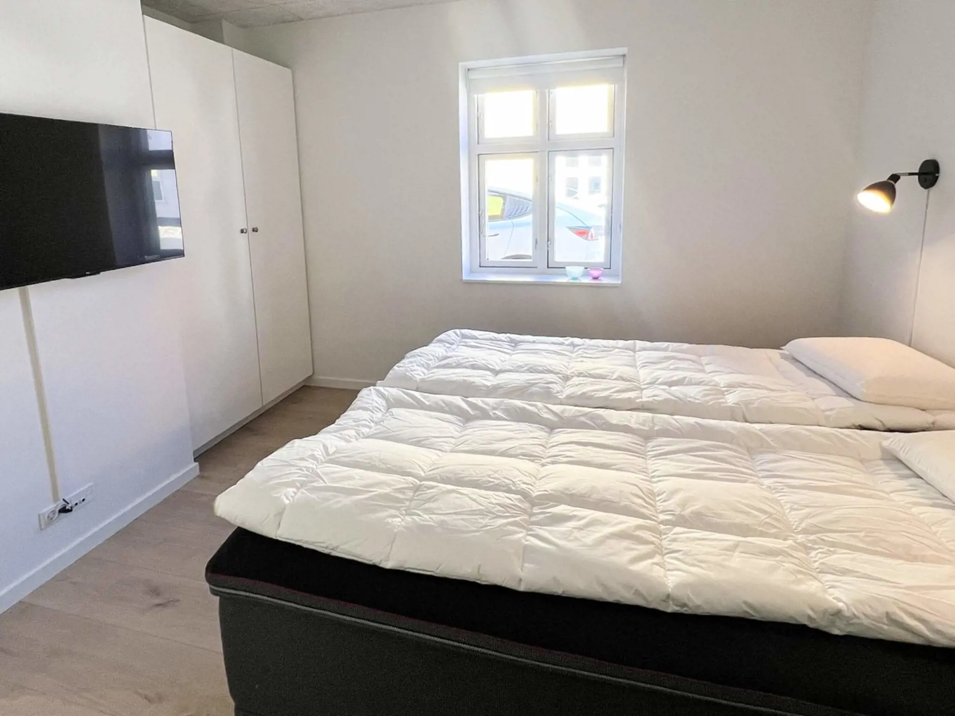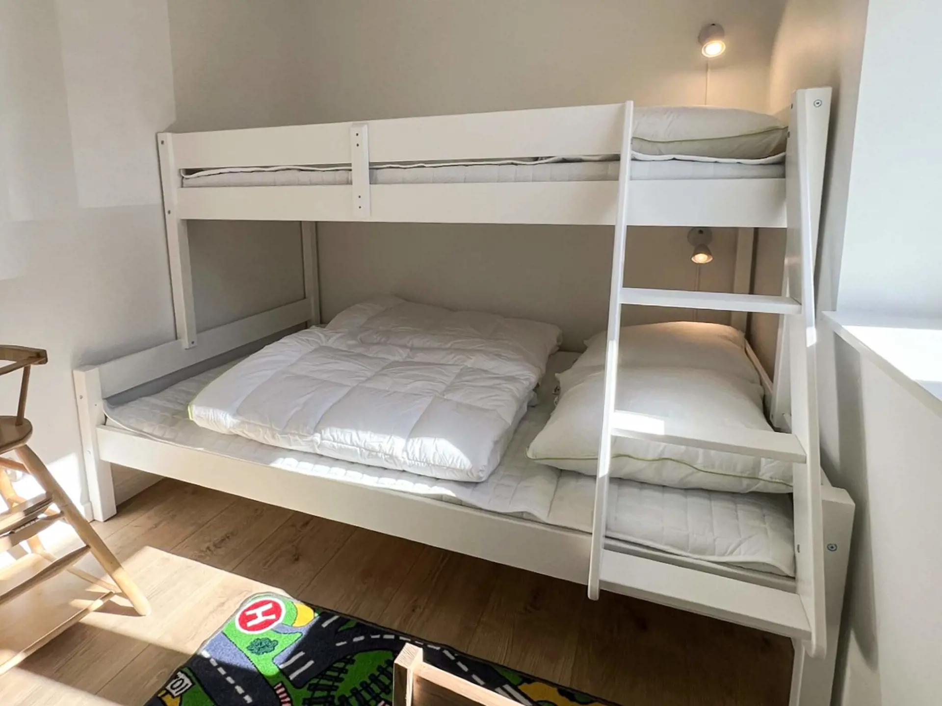 Anschließend gelangen Sie zu einem der beiden Hauptschlafzimmer mit neuen Hochbetten und einem Babybett für Ihr Kind. Reichlich Stauraum in den Kleiderschränken ist ebenfalls vorhanden. Es gibt einen neuen 43-Zoll-Fernseher und zahlreiche Apps.