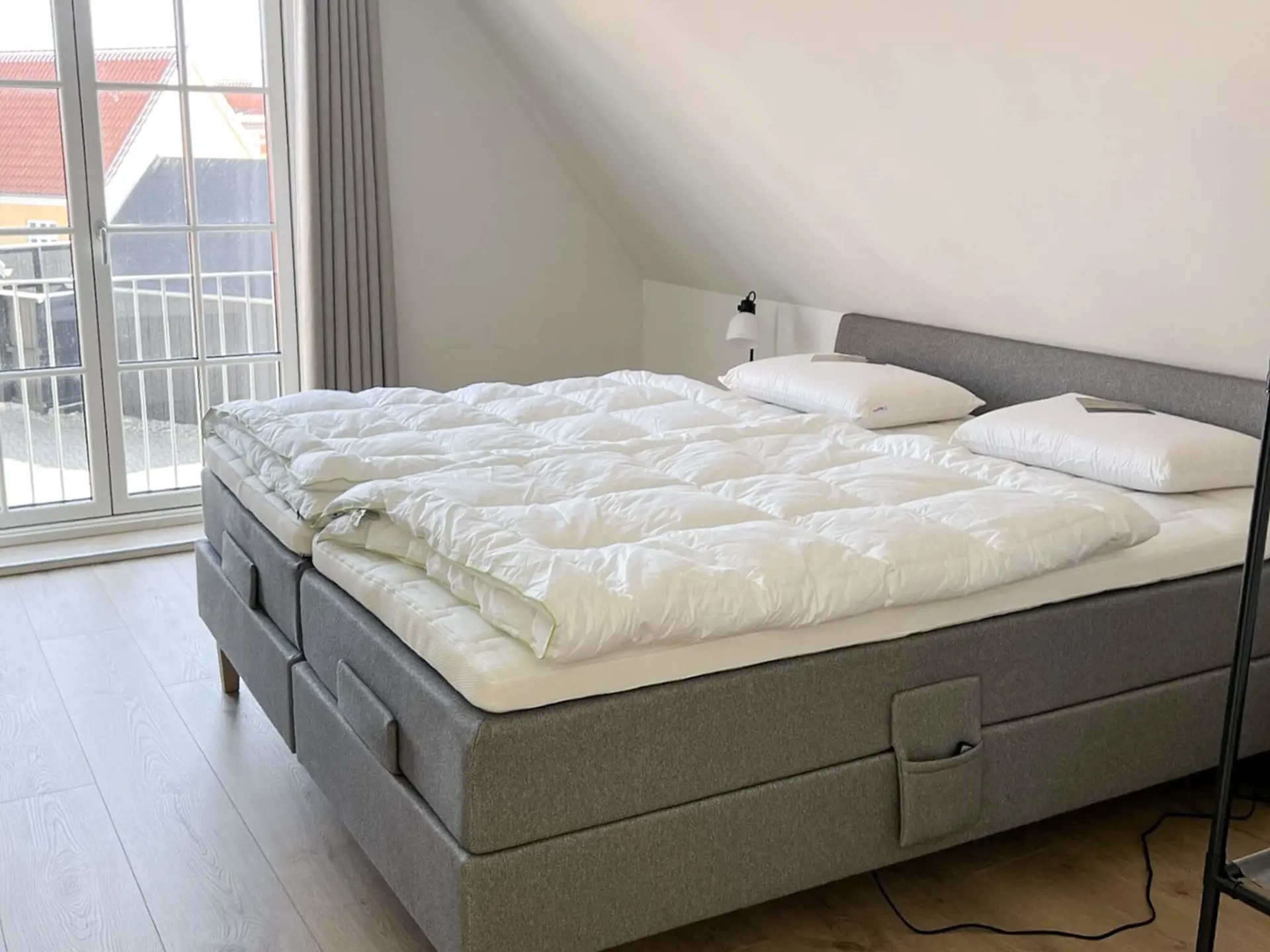 Im Obergeschoss befindet sich ein komplettes Badezimmer. Das Hauptschlafzimmer dort oben ist mit neuen Doppelbetten mit Höhenverstellung und einem großen Fernseher ausgestattet. Genießen Sie den Sonnenuntergang von einem schönen französischen Balkon.