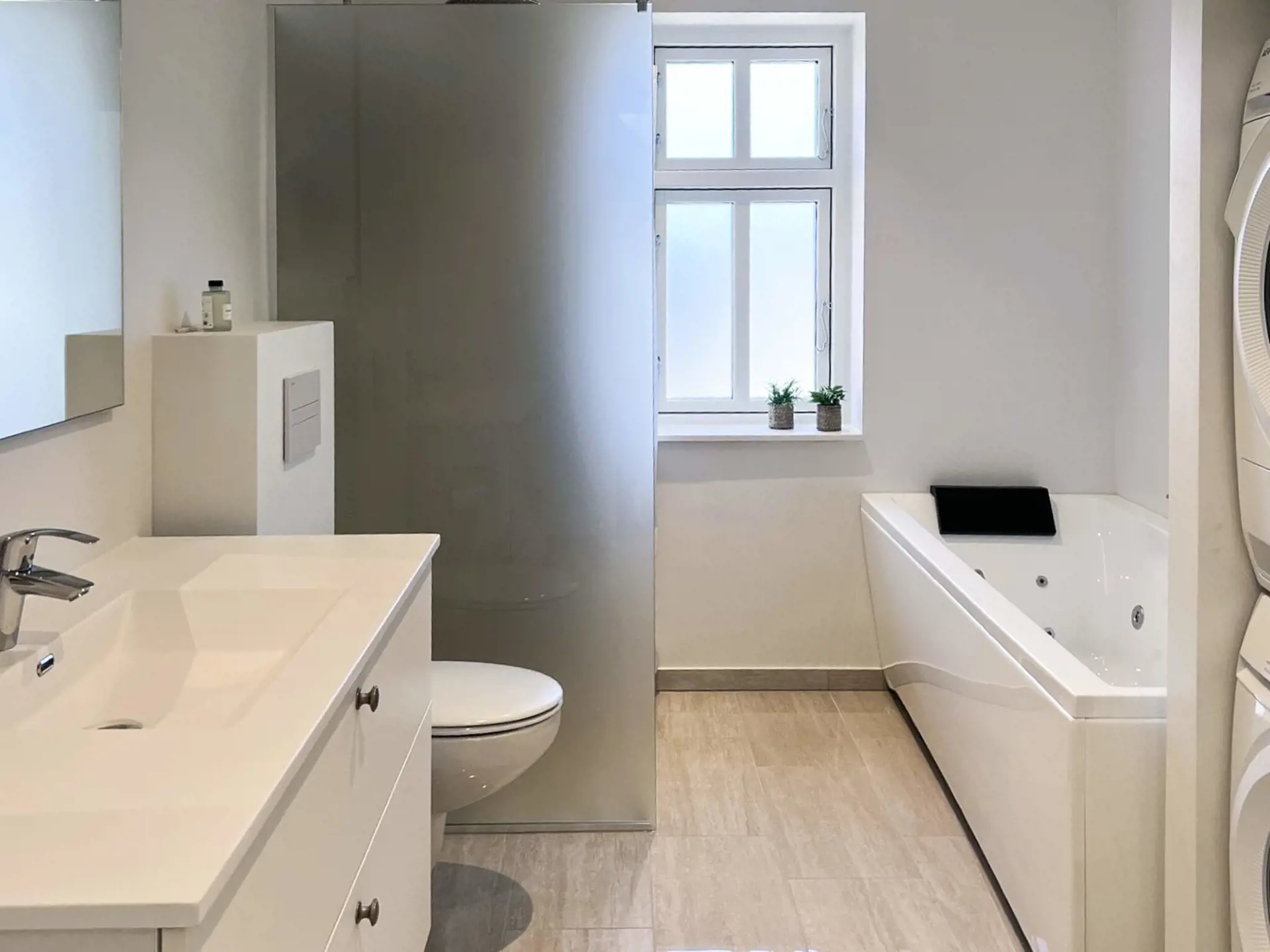 Das Badezimmer ist mit Waschbecken, WC, Dusche und einem großen Whirlpool mit allen erdenklichen Annehmlichkeiten ausgestattet. Waschmaschine und Trockner sind ebenfalls vorhanden.