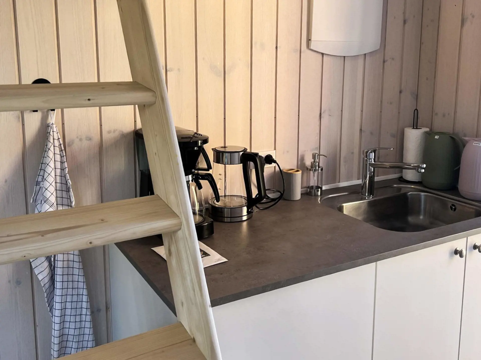 Hier befinden sich die Küche, ein großes Wohnzimmer mit Doppeltüren zur Terrasse, ein 55-Zoll-Smart-TV und ein Schlafsofa. Außerdem gibt es einen Schlafboden, auf dem man übernachten kann.