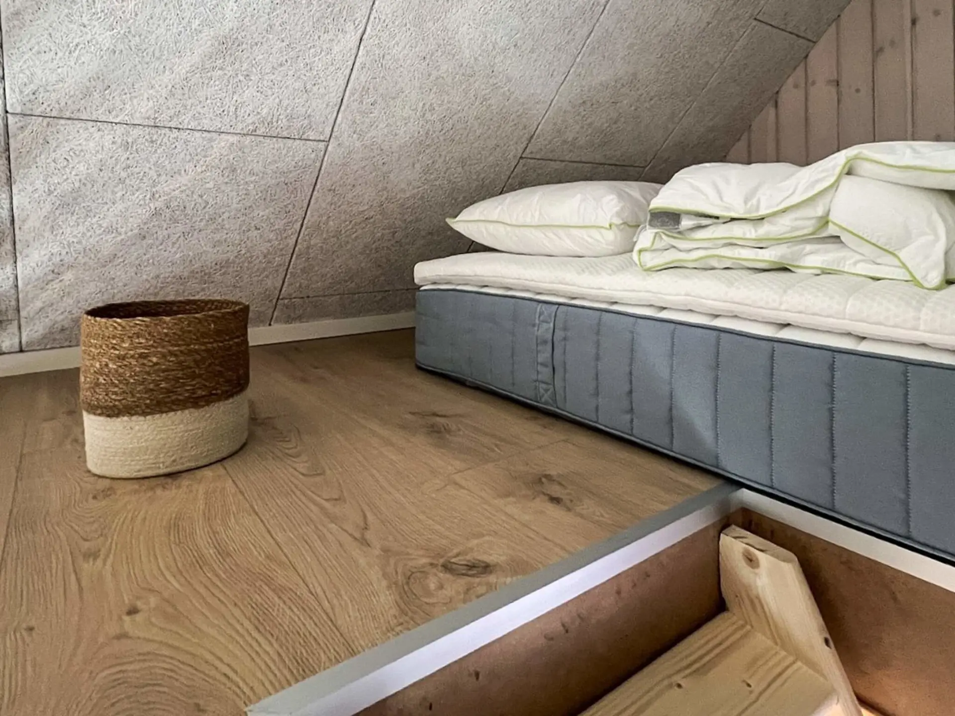 Außerdem gibt es ein Schlafzimmer mit einem 140 cm breiten Bett und viel Stauraum.