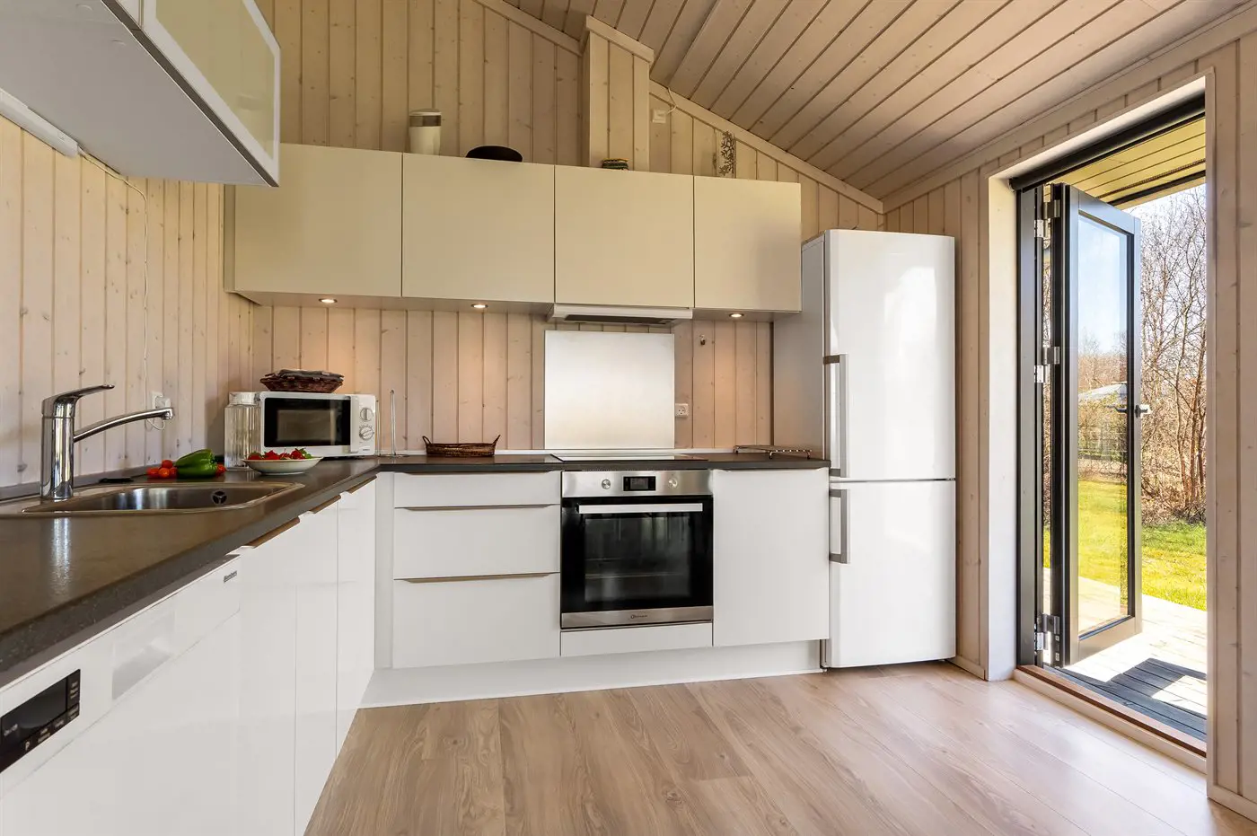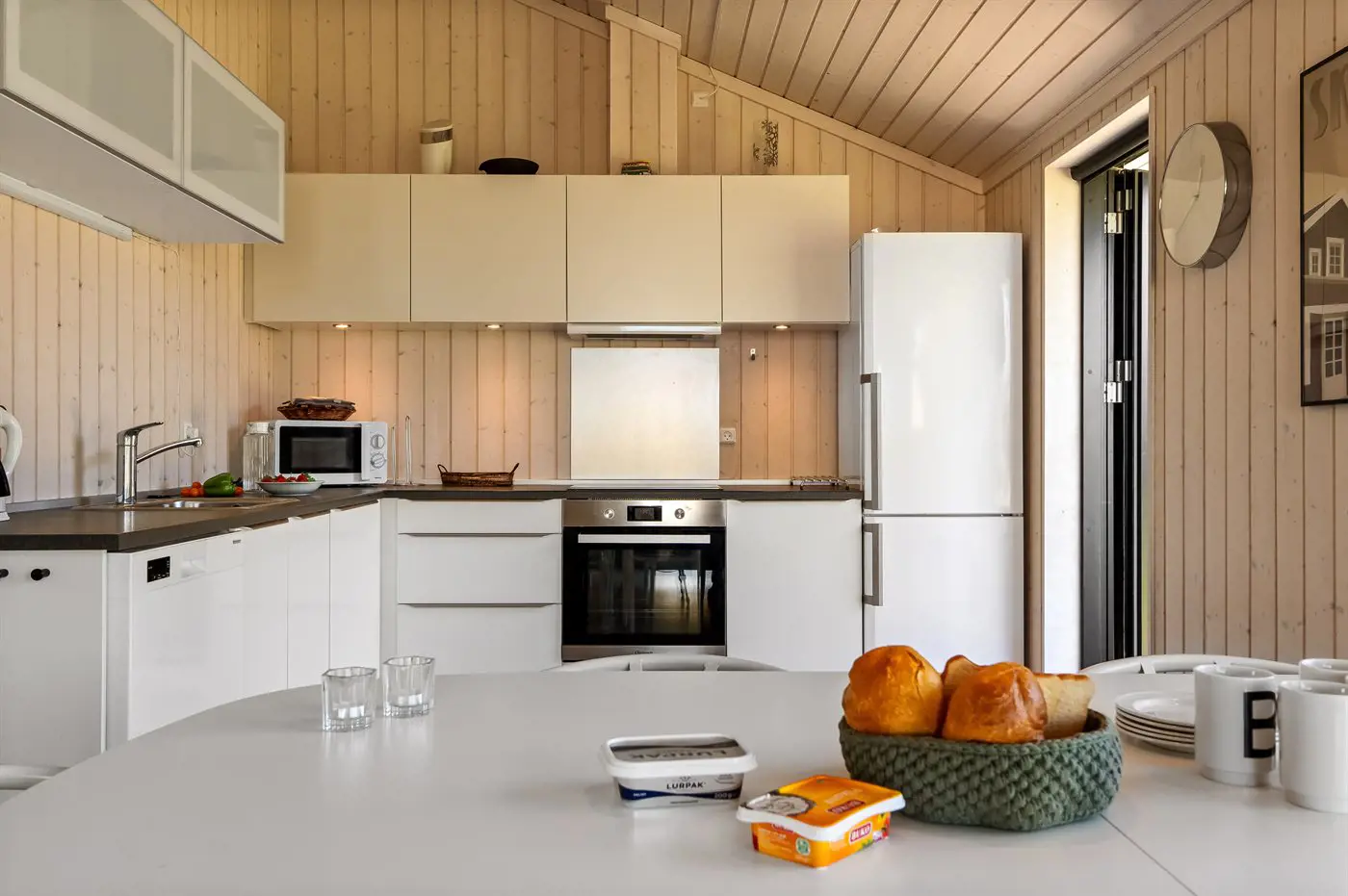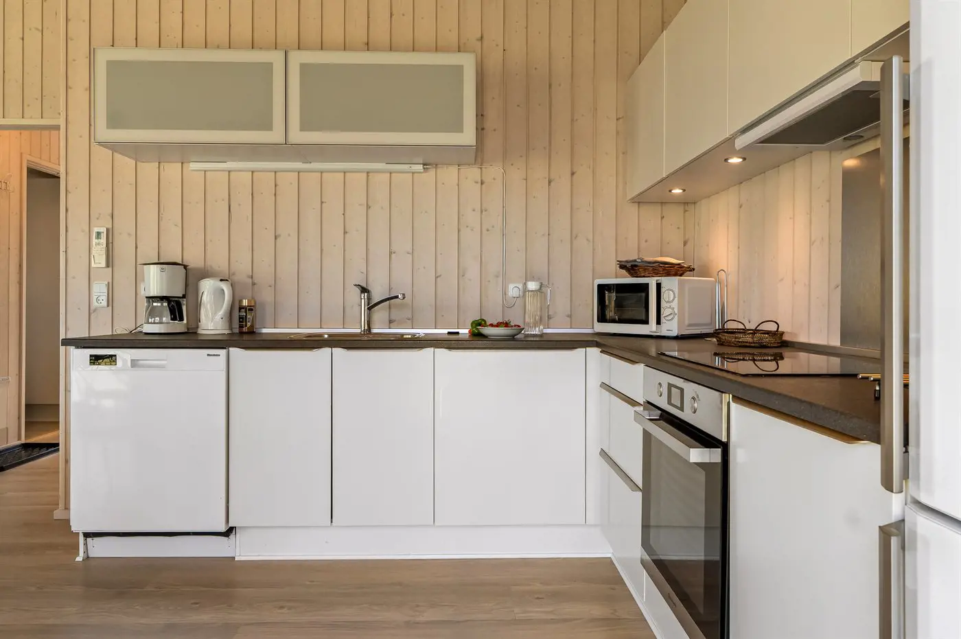 Die Küche ist mit Kühlschrank ausgestattet. Außerdem gibt es 4 Induktions-Kochzonen, Umluftofen, Mikrowelle sowie Geschirrspüler.