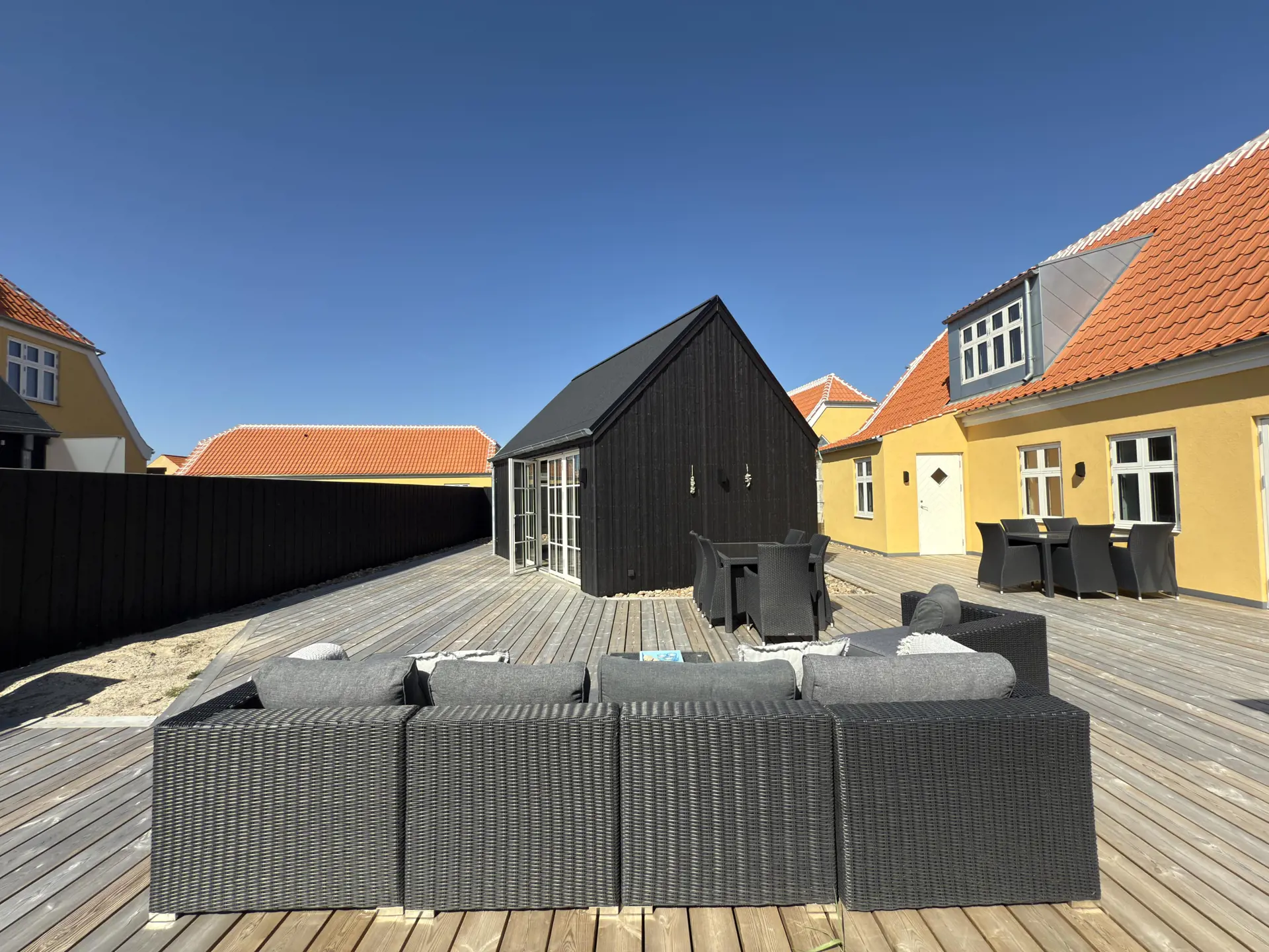 Die großzügige, sonnige Terrasse mit eleganten Loungemöbeln, Essbereich und Holzkohlegrill bildet den perfekten Rahmen für lange Sommerabende und unvergessliche Urlaubsmomente.
