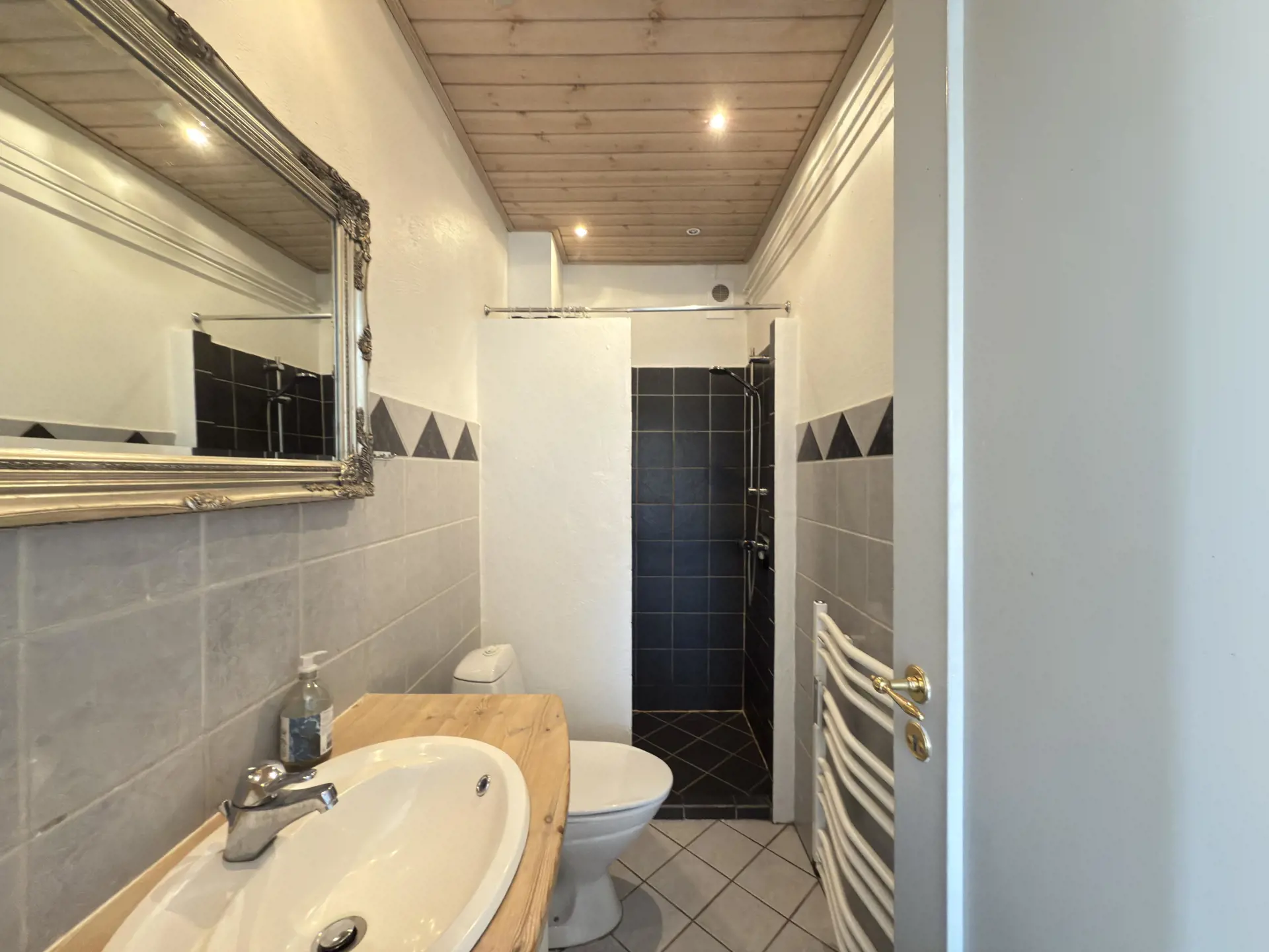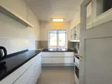 Die Küche liegt separat und ist gut ausgestattet. Das Badezimmer befindet sich in der Mitte der Wohnung und ist daher ohne Fenster.